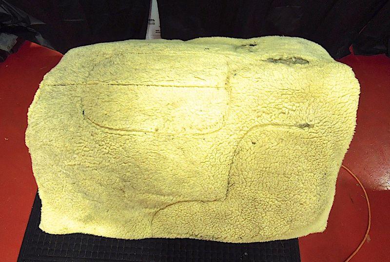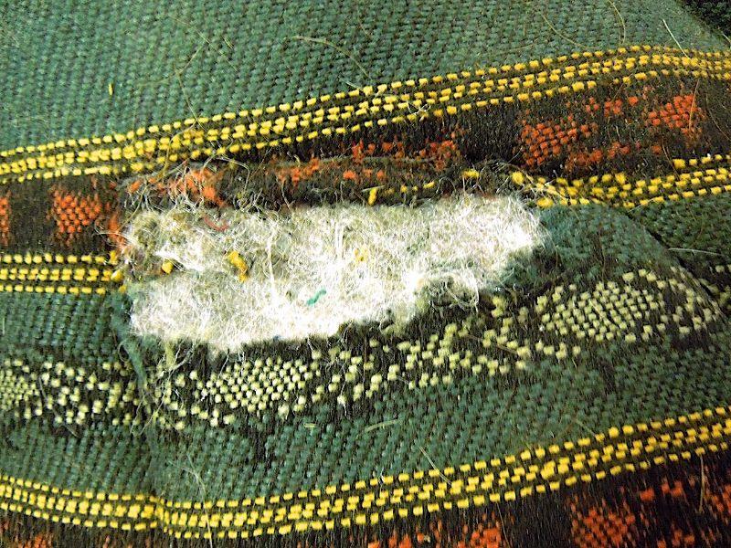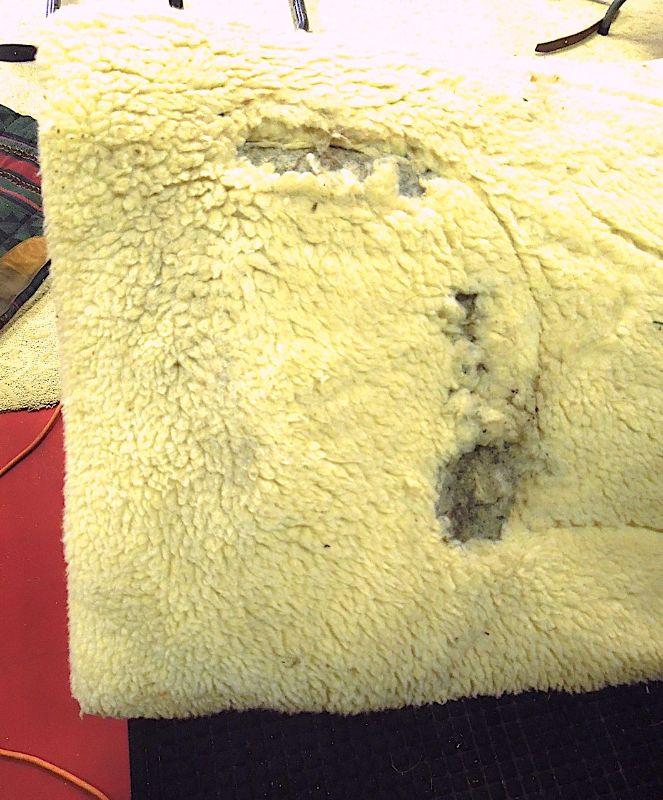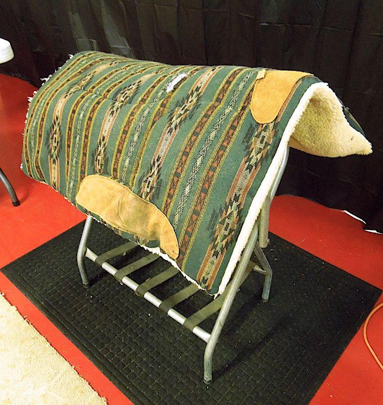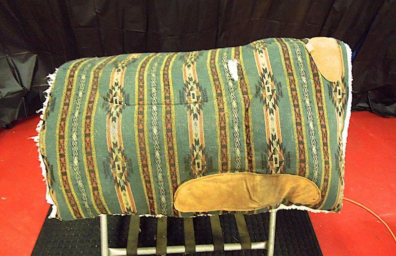Handsome navaho design This cotton nylon blend cover saddle pad by BJK has a small area that needs repair on top side where batting is showing through. Underside fleece is worn around neck area as well. Fairly clean and still has some miles of use. Suede leather stirrup pads and front.