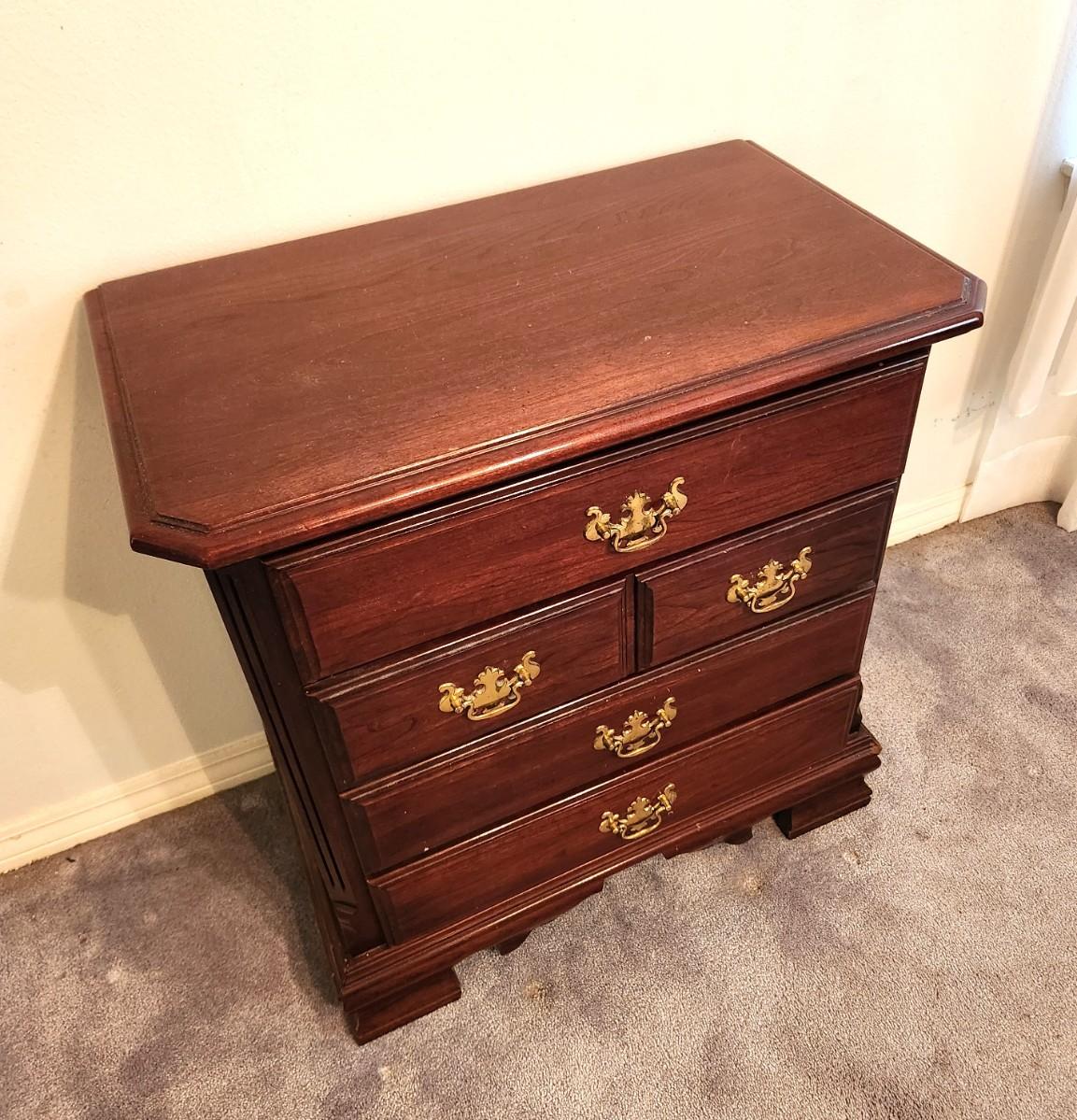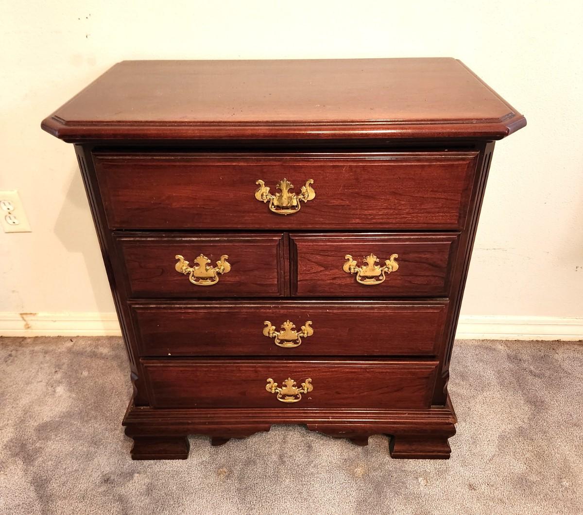 Classic design from the Carlisle Furniture Company - single nightstand, 4 drawers, 28" across, 16" deep, 30" tall. A versatile piece of furniture. Could also be used in a den or living room as a lamp table. Gently used condition.