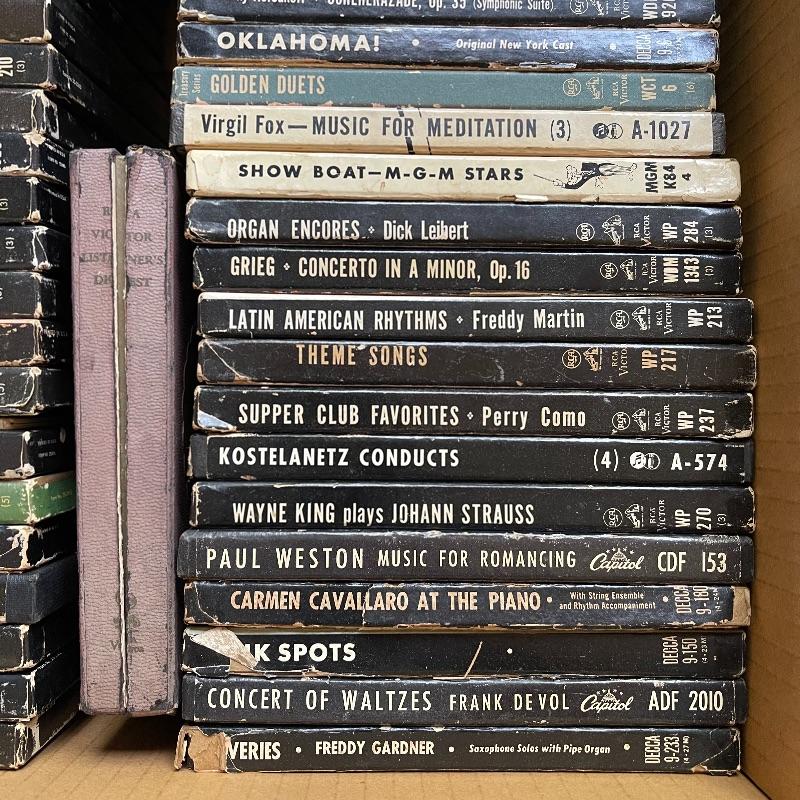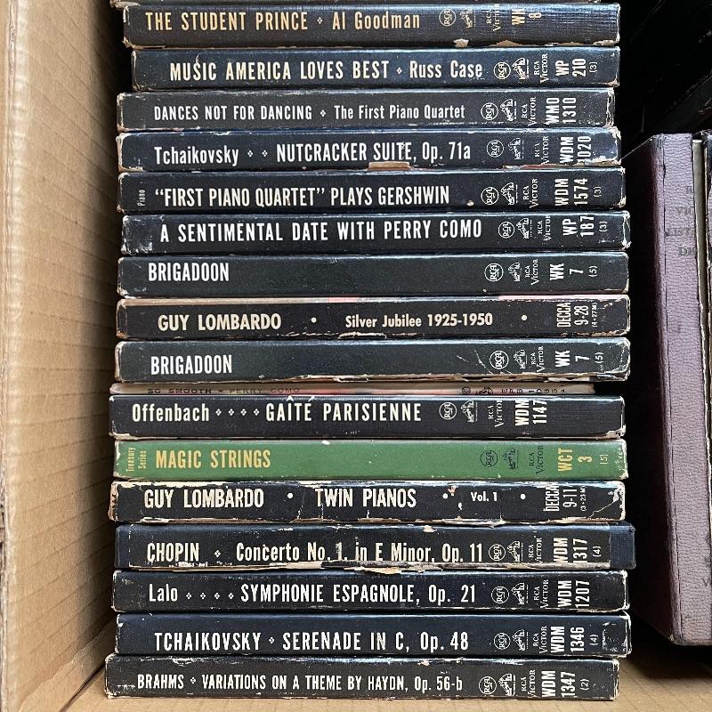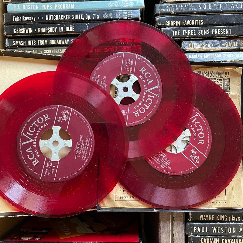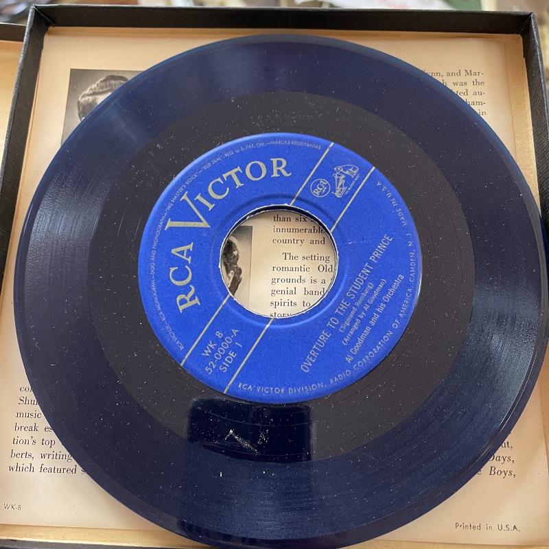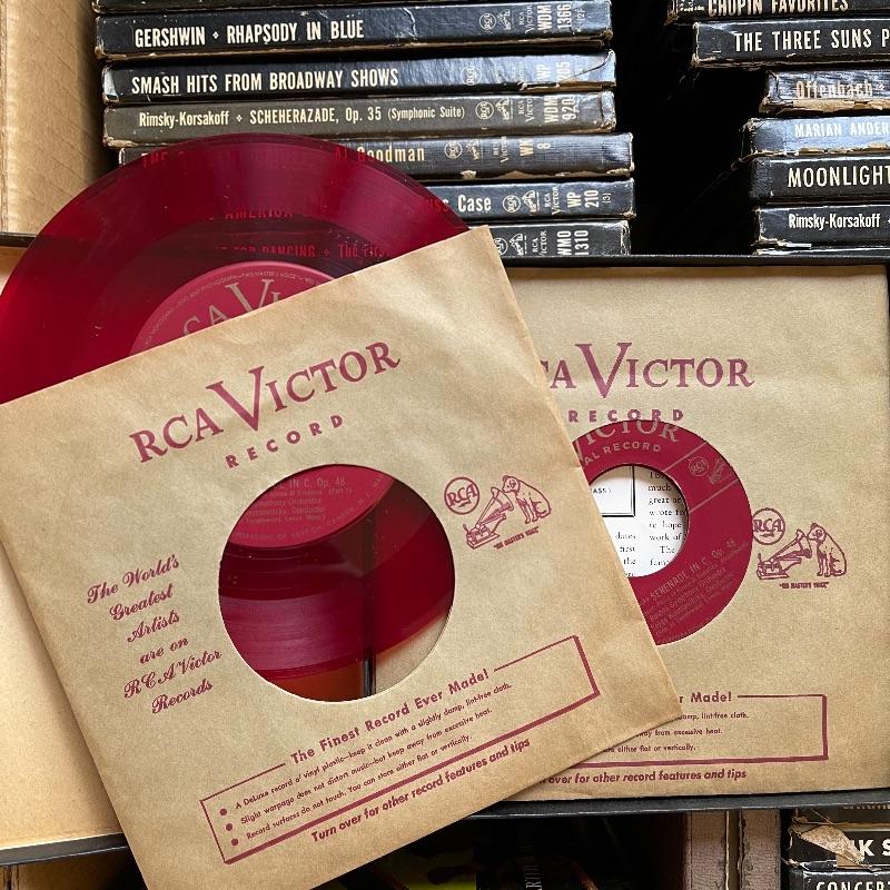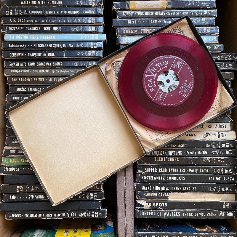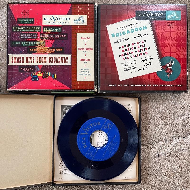 This lot includes a collection of 45 rpm 7” vinyl records including musical soundtracks, classical music, and more. Most case sets include multiple records for each musical composition. There are 27 sets of the RCA Victor Red Seal Records, 8 RCA Victor Musical Smart Set vinyls, 5 of which are dark blue and 3 are turquoise. There are over 60 vinyl records in this lot.