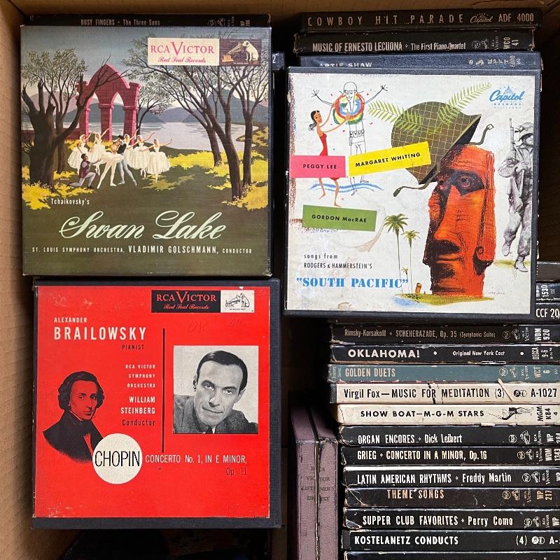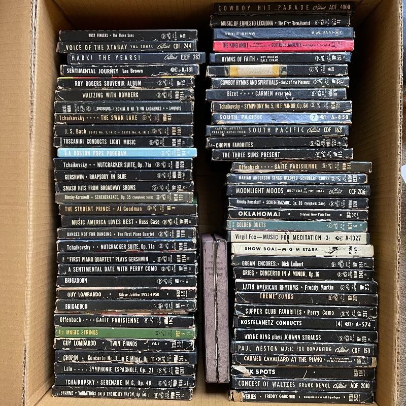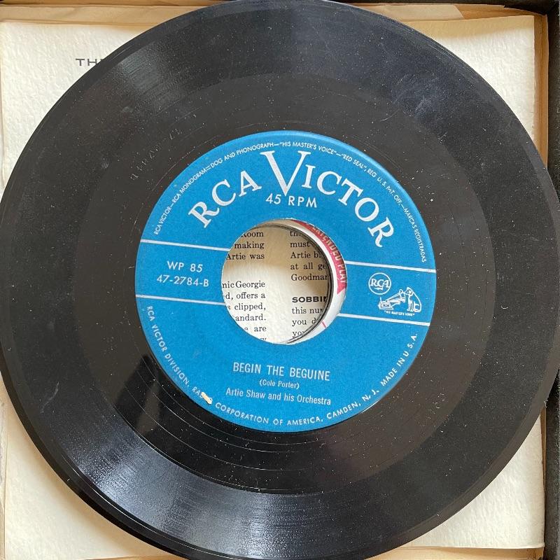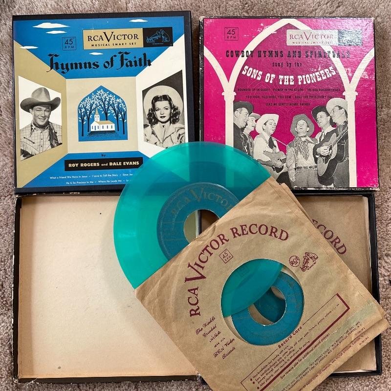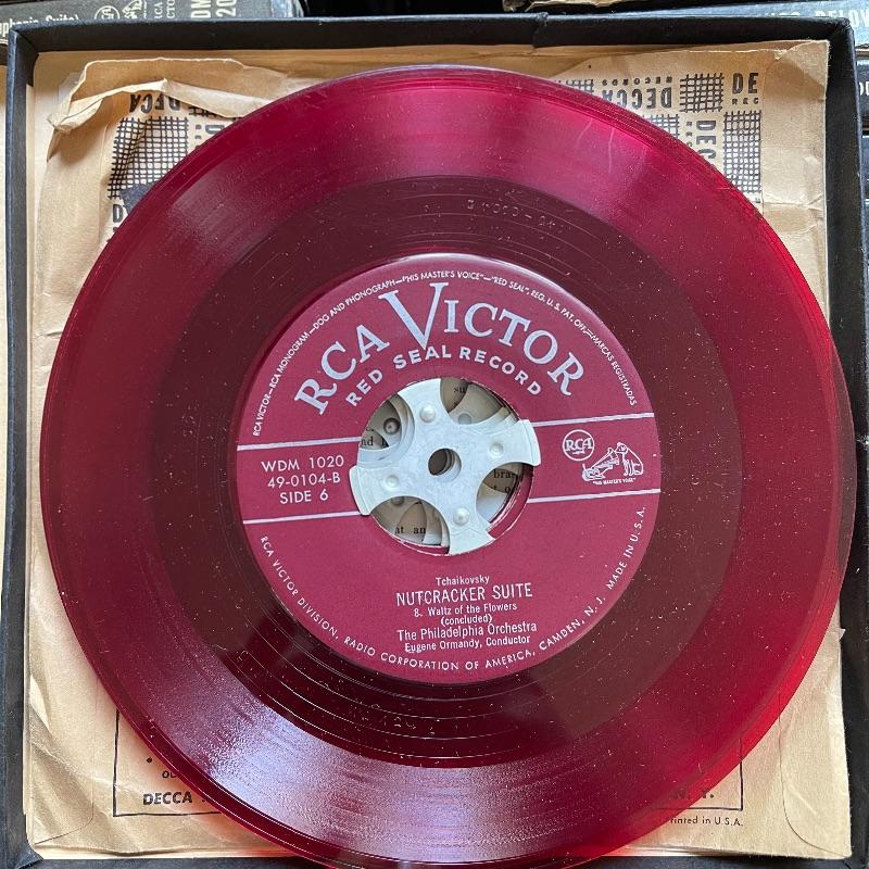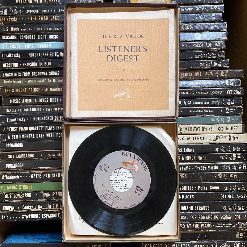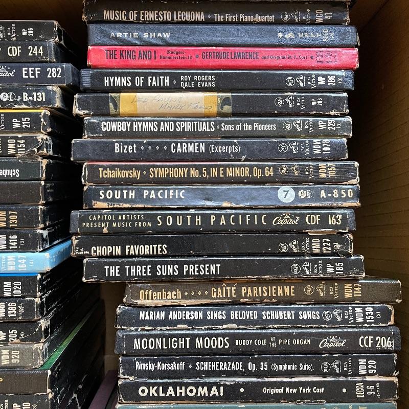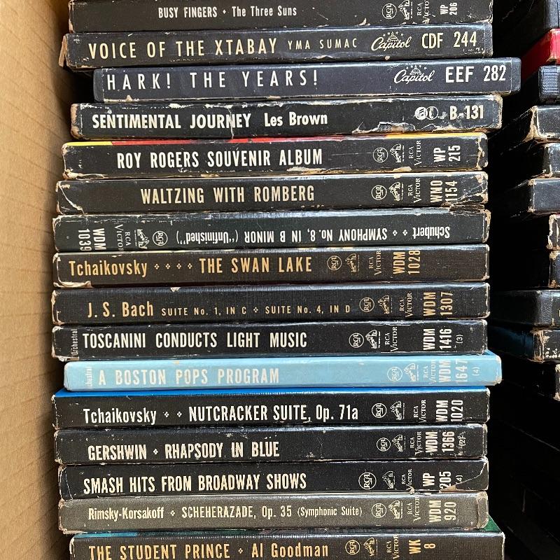 This lot includes a collection of 45 rpm 7” vinyl records including musical soundtracks, classical music, and more. Most case sets include multiple records for each musical composition. There are 27 sets of the RCA Victor Red Seal Records, 8 RCA Victor Musical Smart Set vinyls, 5 of which are dark blue and 3 are turquoise. There are over 60 vinyl records in this lot.