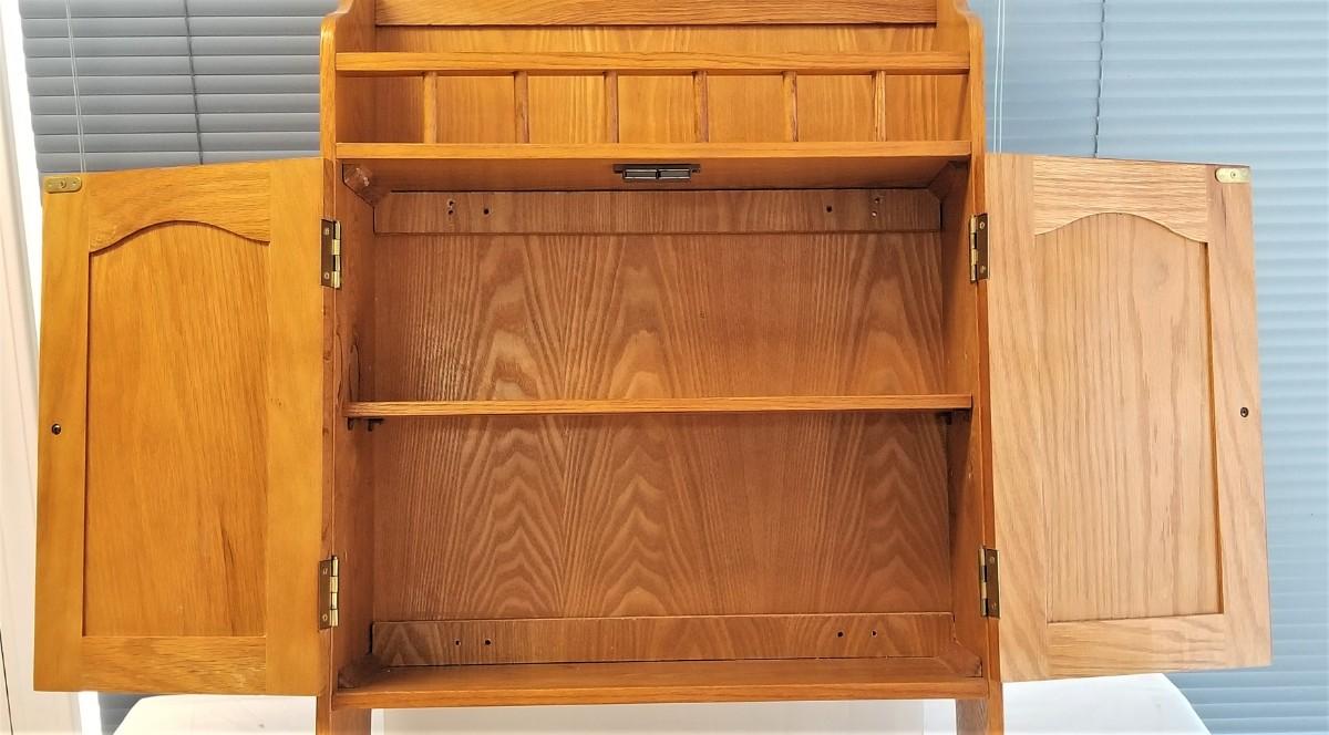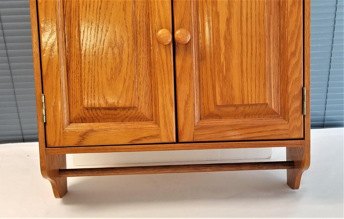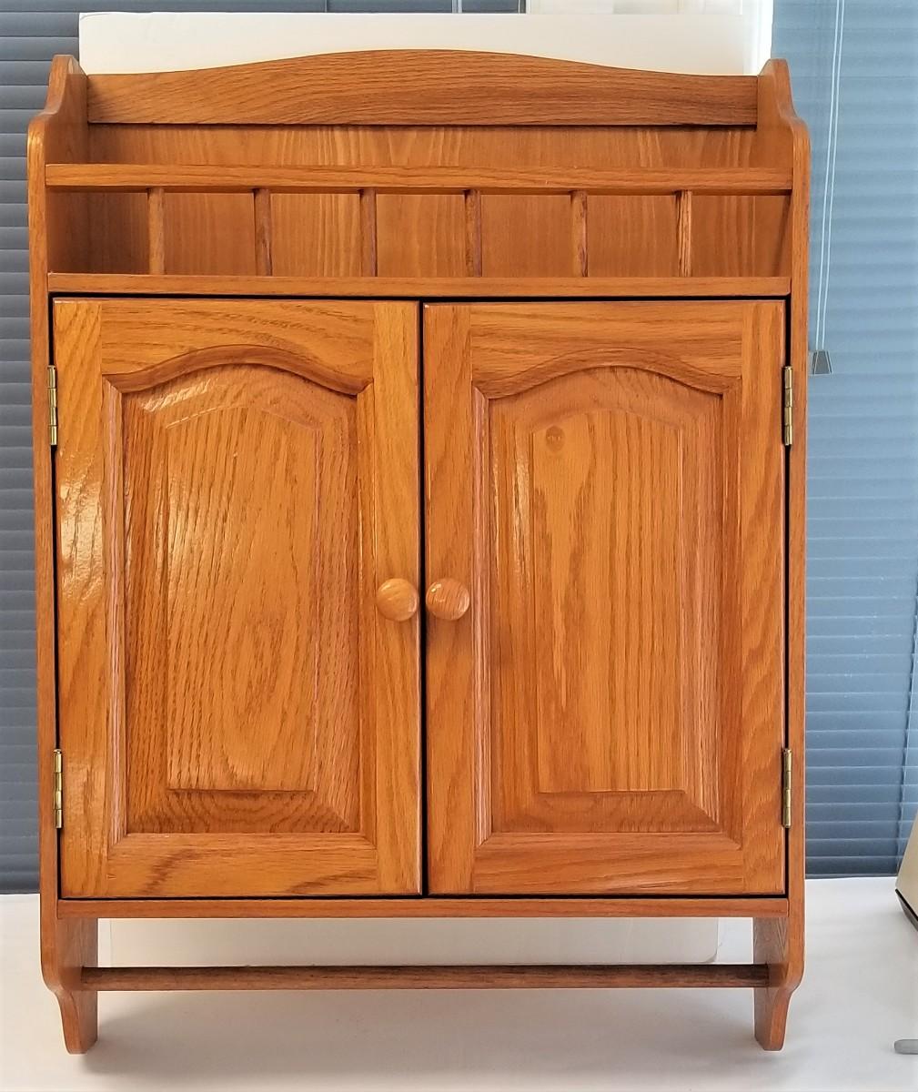 Oak finish Contemporary Wall Cabinet - good for bath or kitchen. Towel rack on bottom, 1 shelf inside. 21" across, 7" deep, 29" tall. Good condition. Screws to wall.