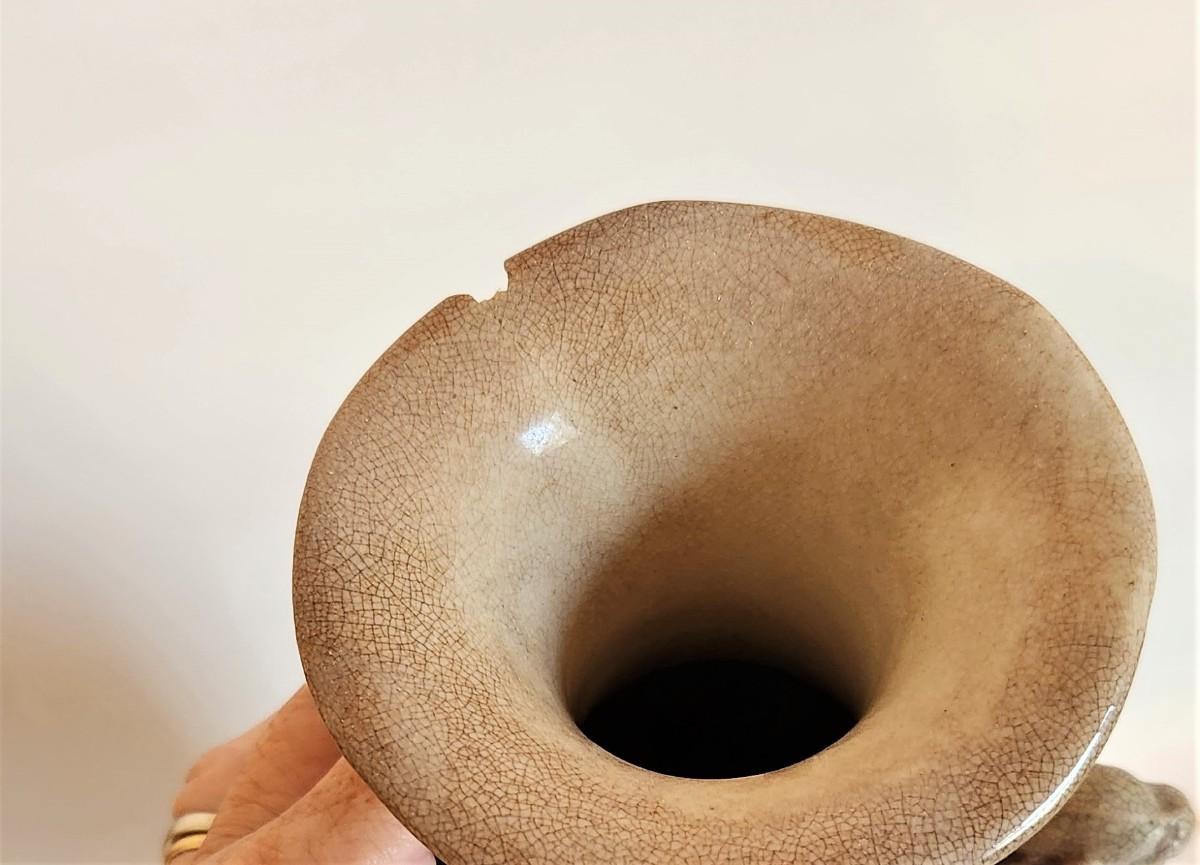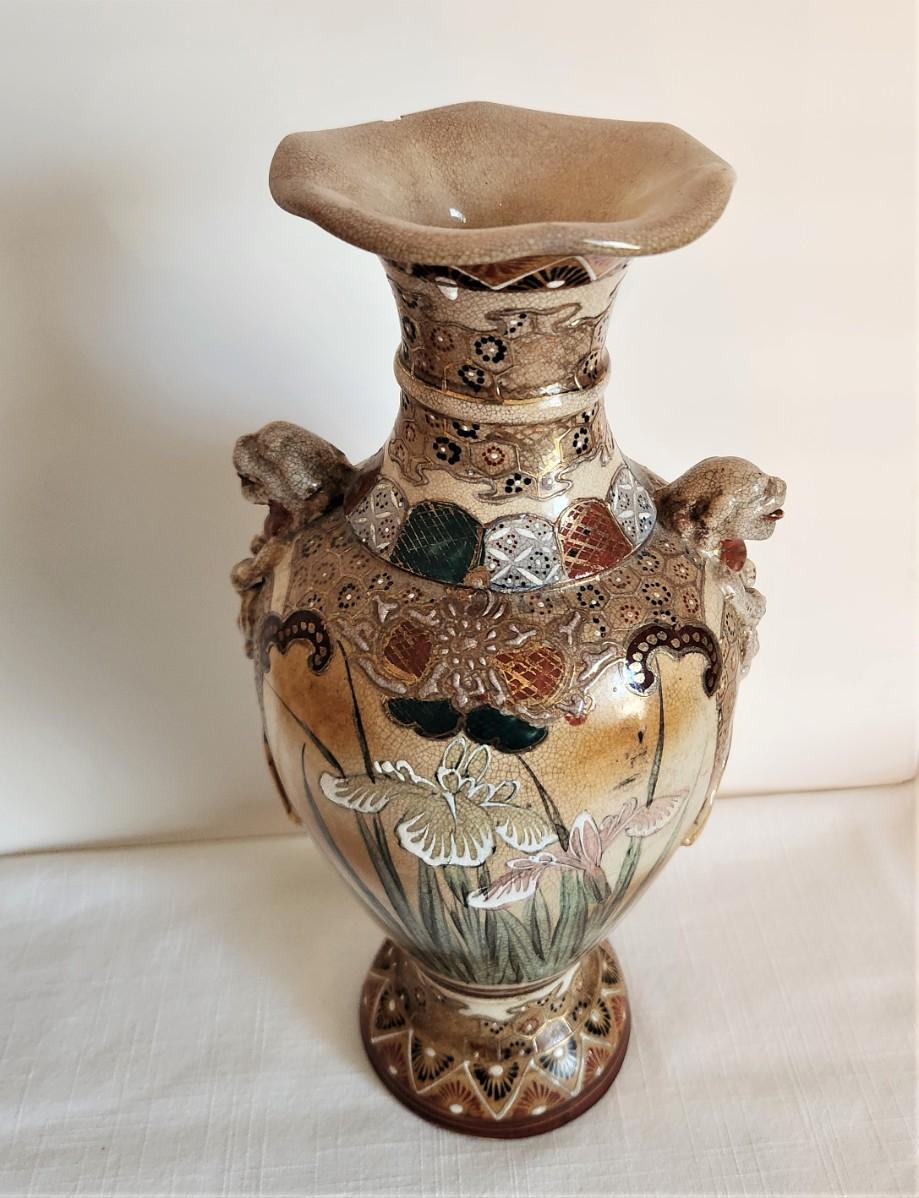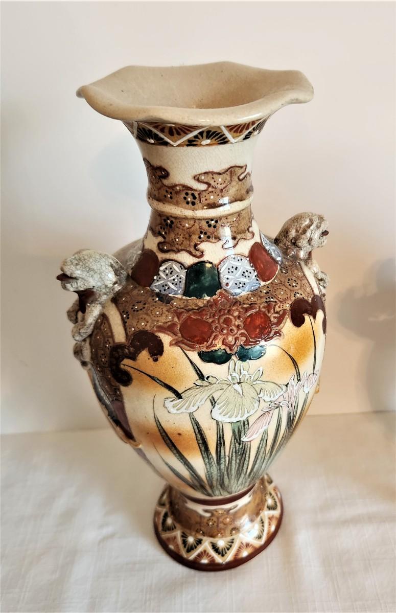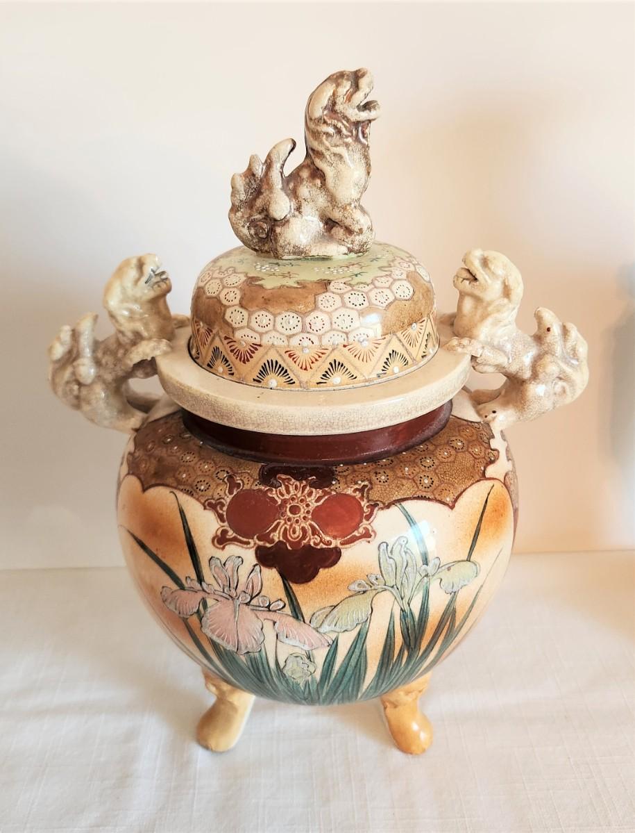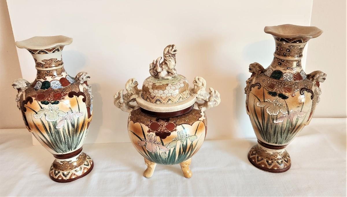 Attractive Decorator Asian-style mantle set - contemporary, but designed to look old. Two vases and lidded pot. Vases are each 12" tall - note that one is chipped on the back of the rim. Foo lion pot/jar is 11.5" tall.