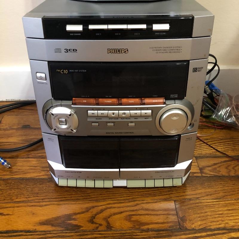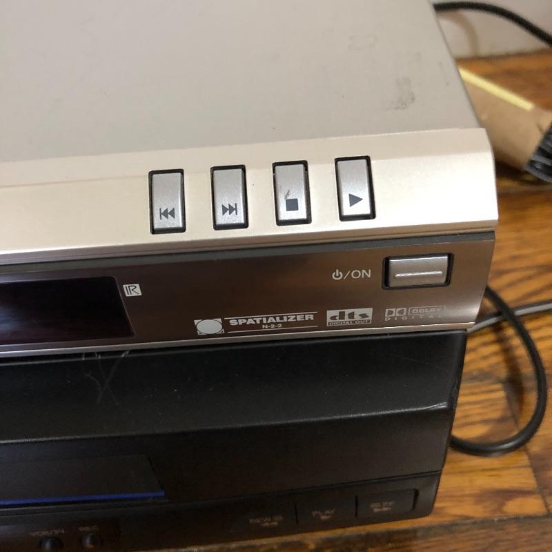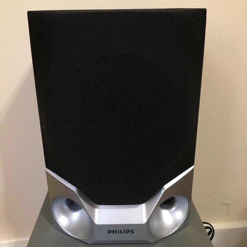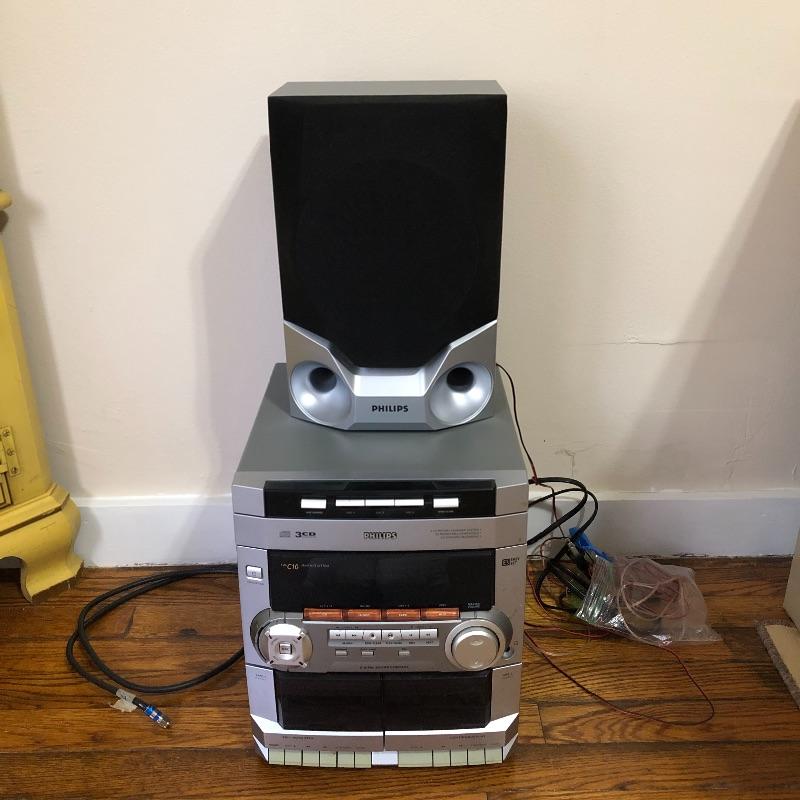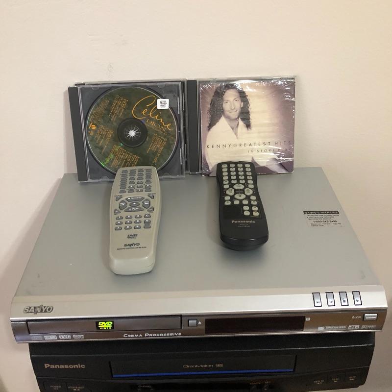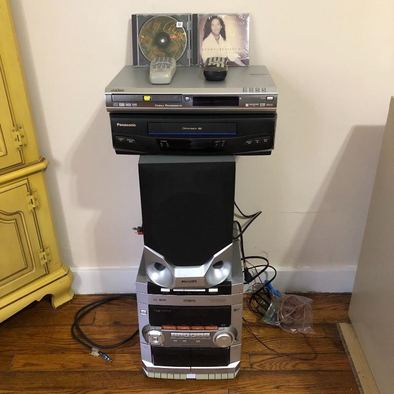 This lot contains a Phillips 3-Disc Rotary Charger System (10” x 11.5” x 12”); two Phillips speakers (8.5” x 6” x 12.5”), Sanyo (14” x 9.5” x 2”) and Panasonic (14” x 10” x 4”) DVD players, Panasonic and Sanyo remotes, and four CD’s, from artists such as Kenny G and Celine Dion. It comes with manuals for the Phillips speakers and the Sanyo CD player. This lot is perfect if you are looking to add to your sound system for your TV. All electronics powered on when tested. Local pickup only.