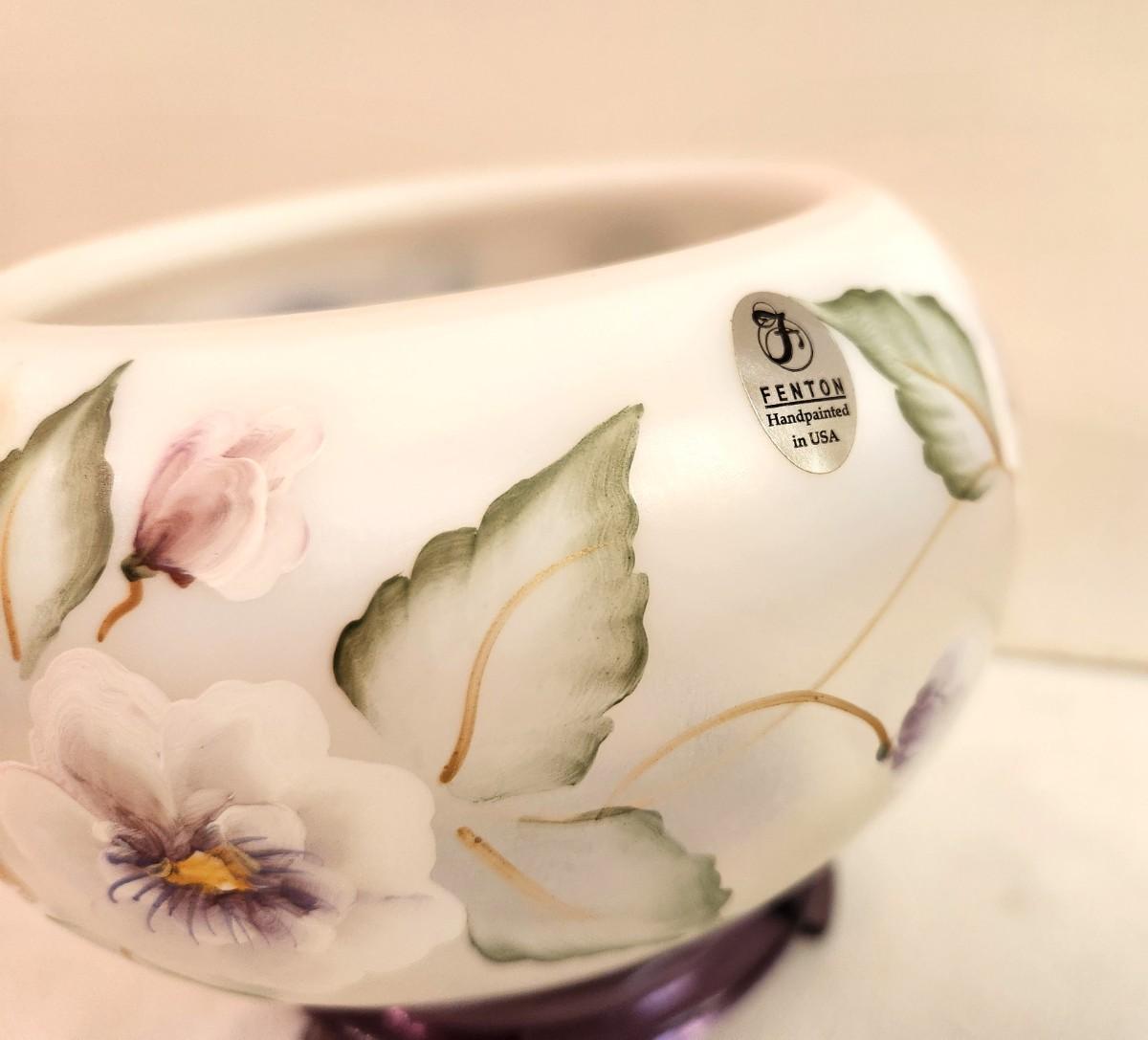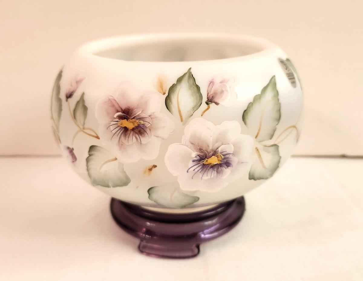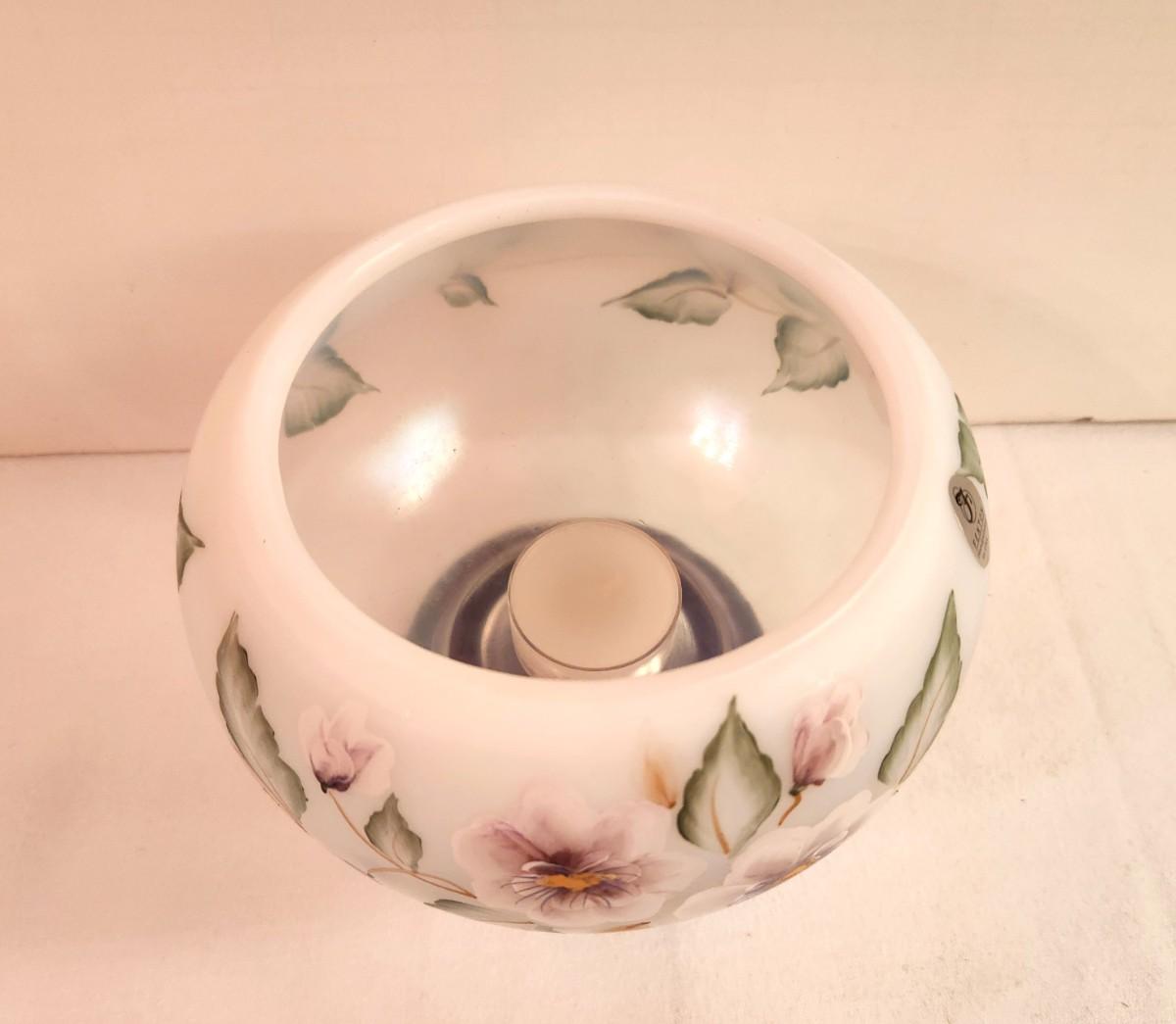Hand Painted Fenton Art Glass Opalescent Tea Light Candle Bowl - Pansy there - has label, signed. On base. 4" Tall - good condition, no box.