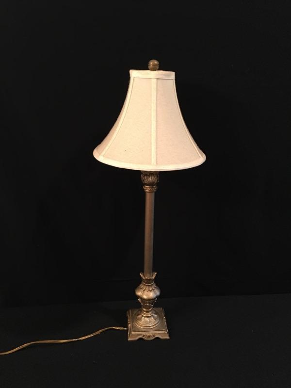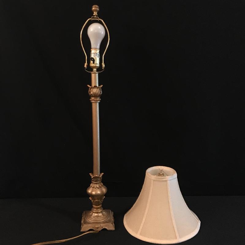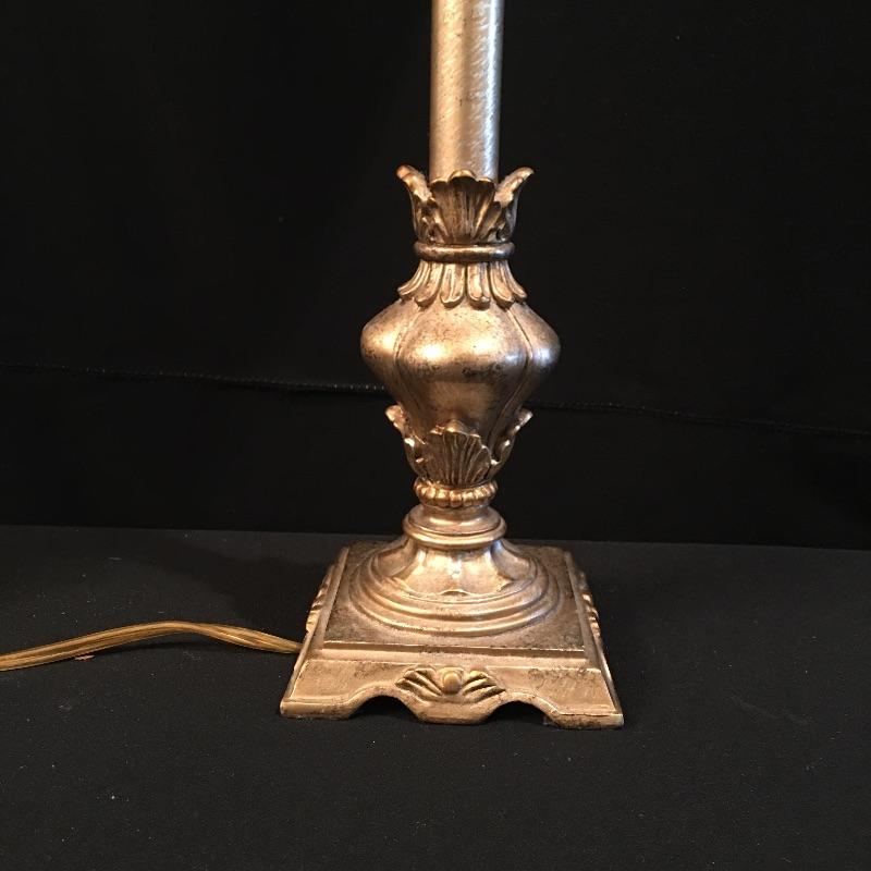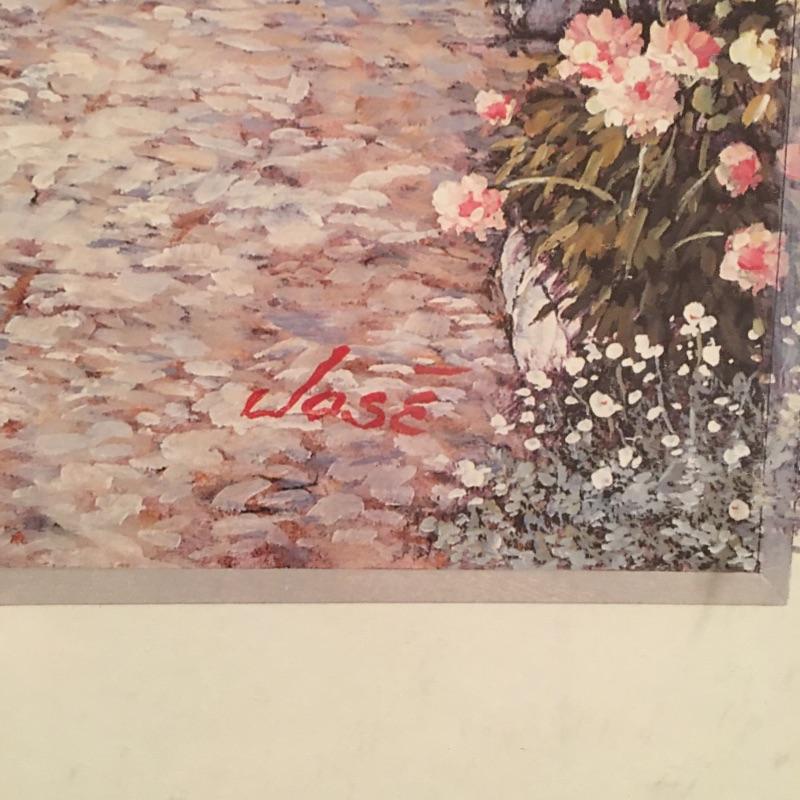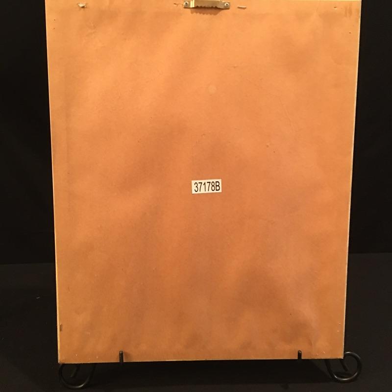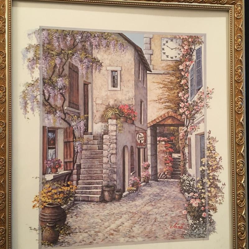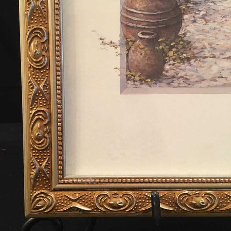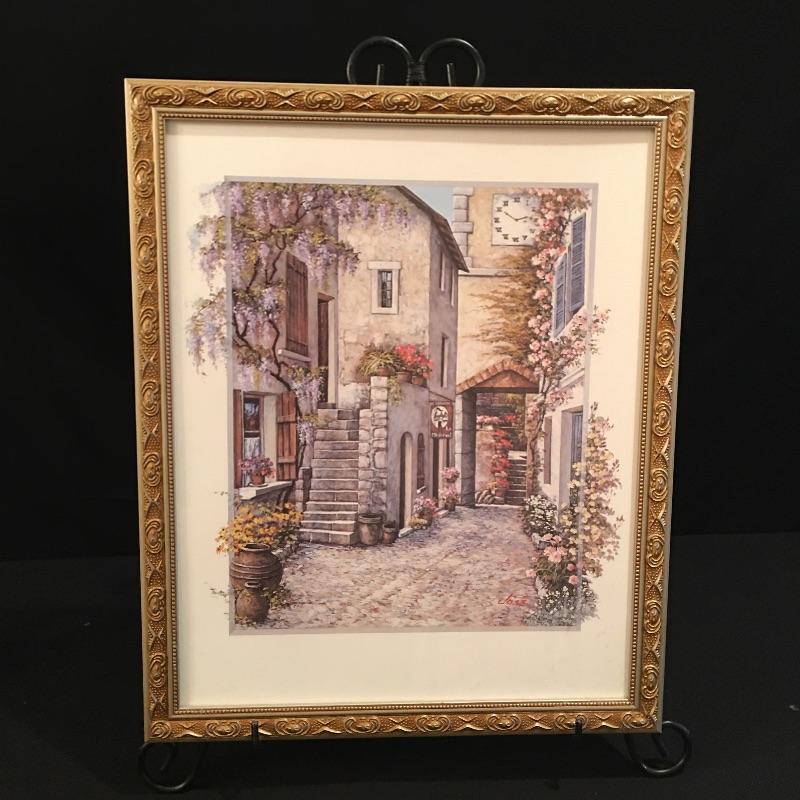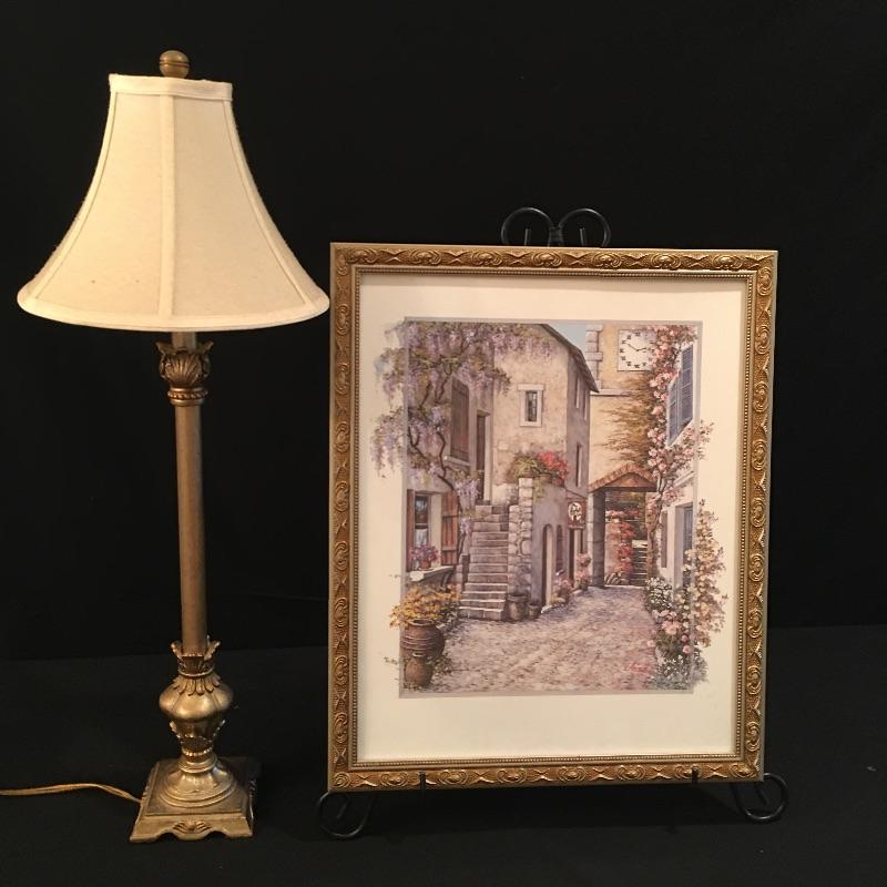 Add a little style and warmth to your home with this print and lamp. Print is of a clock tower and alleyway by José with the foliage spilling onto the matting. Art is complemented nicely in a decorative wooden frame with some sort of man made textured border, probably resin or plastic. Lamp is gold colored with a resin base. Frame measures 18” x 22”. Lamp worked when tested. It’s shade is in nice condition, but pretty dusty.