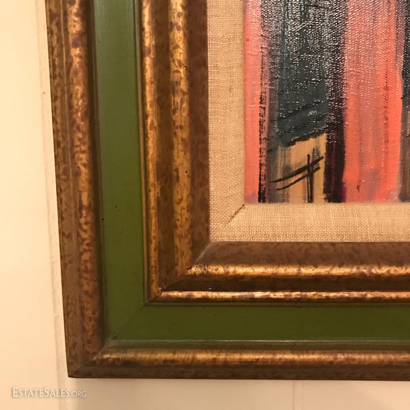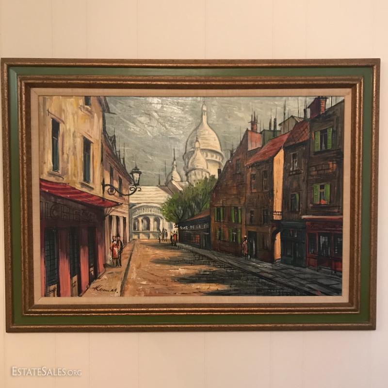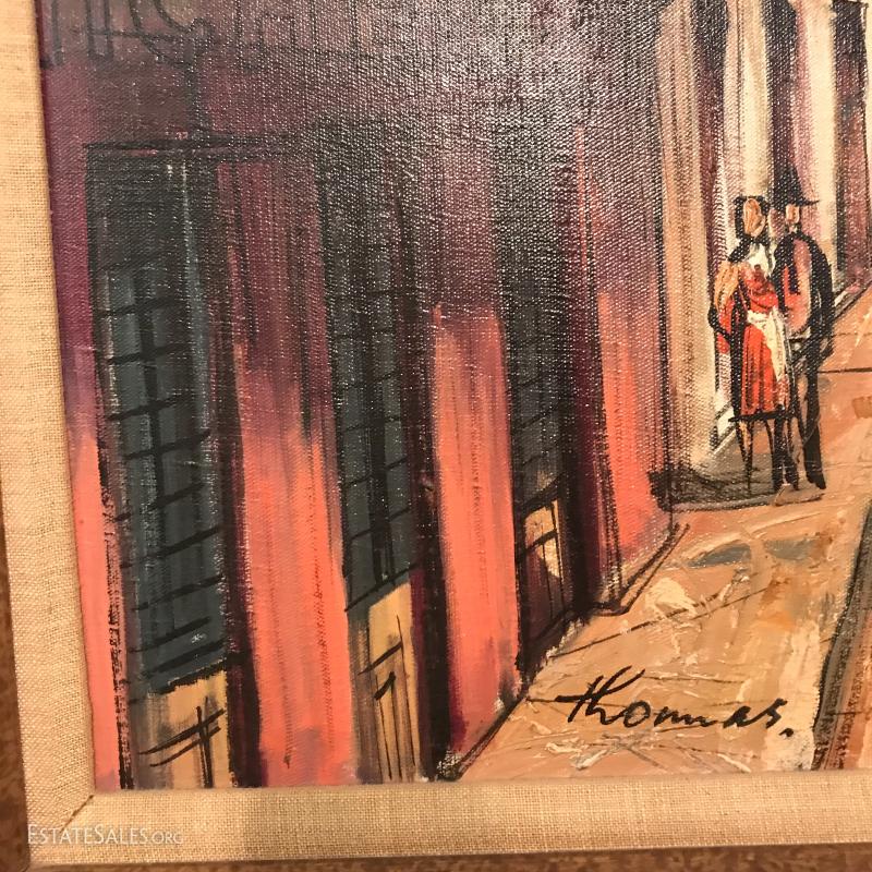 Beautifully framed street scene on canvas. Signed "Thomas." 44" l x 32"w. Shipping or Local pick up in Asheville, NC.