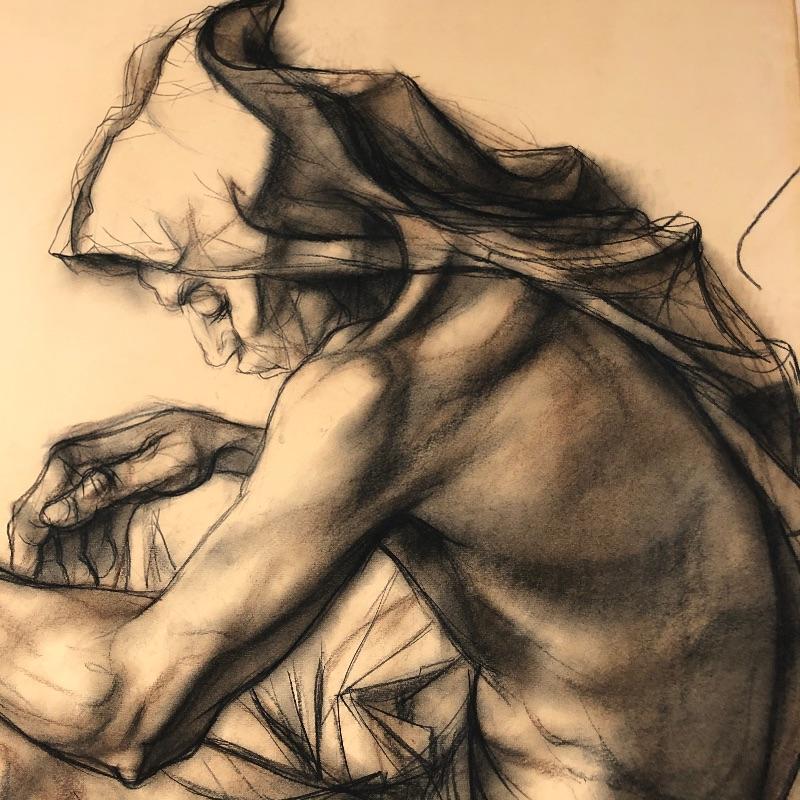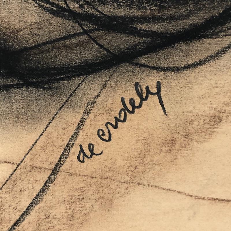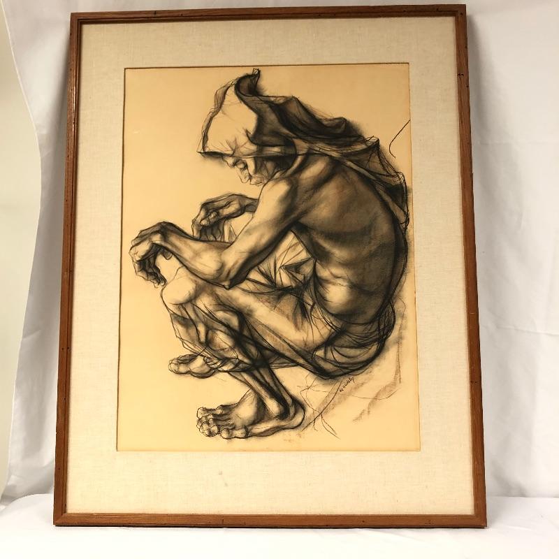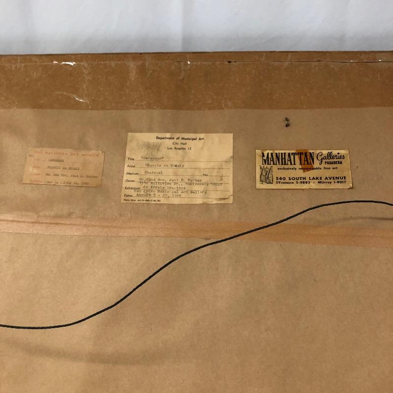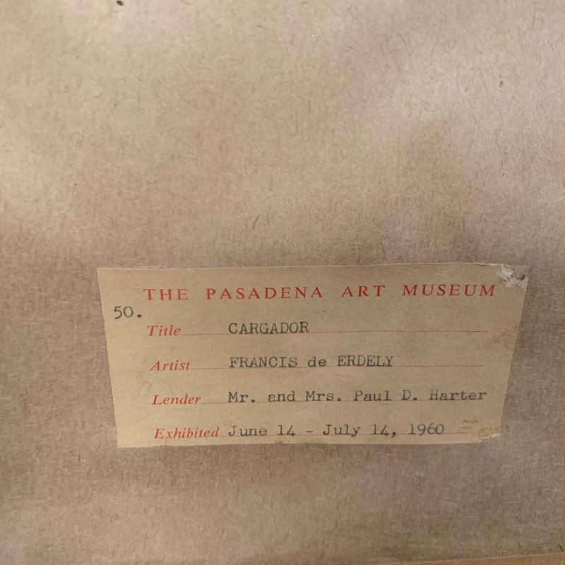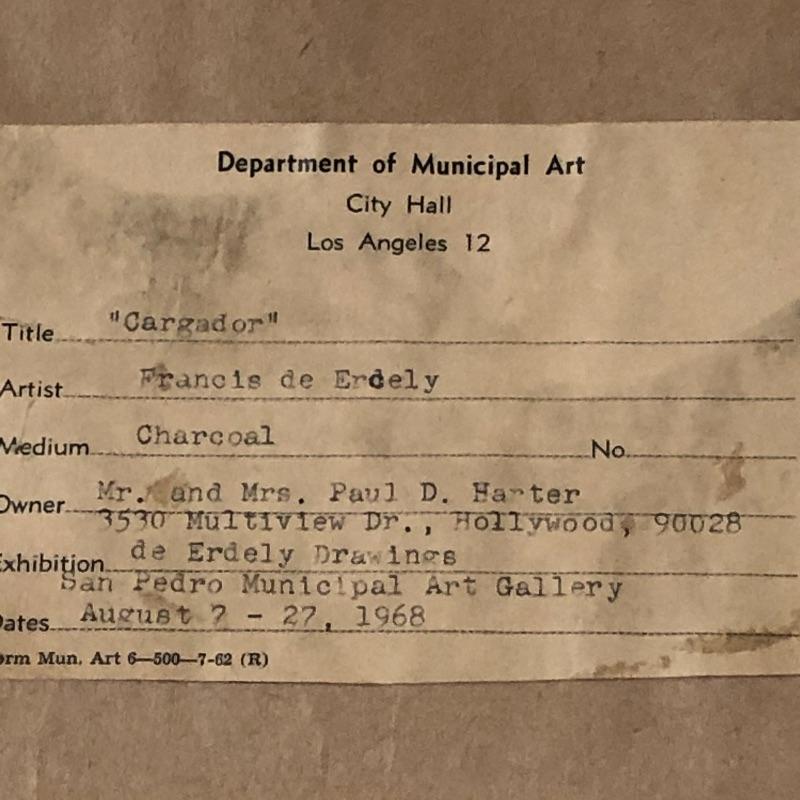 This large matted and framed charcoal is by Francis De Erdely and titled “˜Cargador’. This large piece is set in a 1.75” wide wood frame that measures 31” x 39”. There is a paper on the back from LA Dept of Municipal Art with some details.