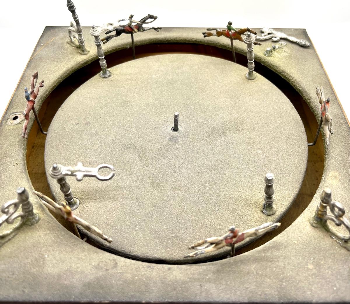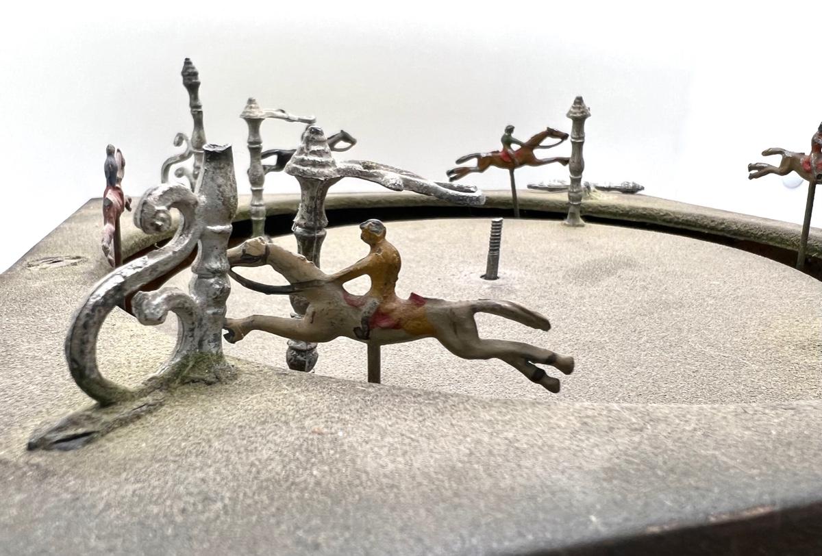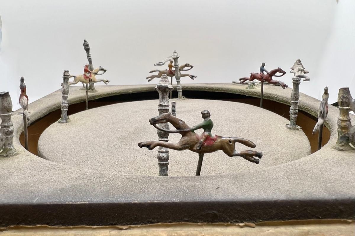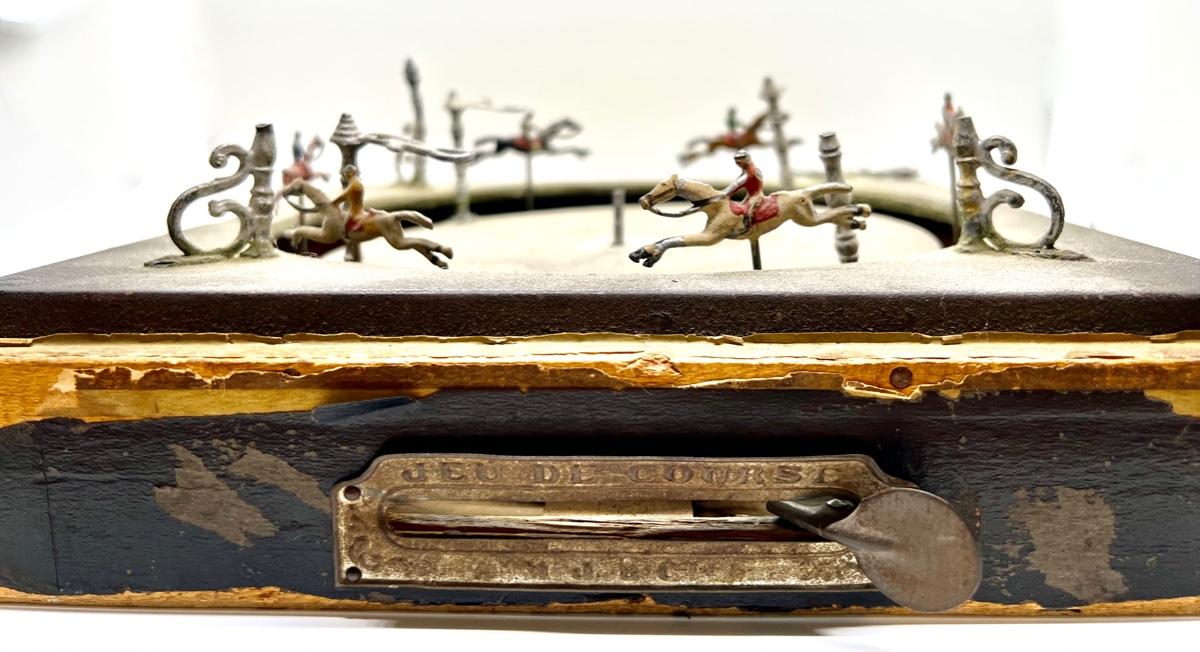 LOT 17 - French Horse Racing Tin Game - Jeu De Course Trade Stimulator M.J. Cie. This is shelf art and is very worn. Moving the handle at the base still creates movement of the round platform. It has a fabulous patina. Game measures 10 1/2 inches by 10 1/2 inches. It measures 4 1/2 inches tall. It is being sold in AS IS condition. There are missing pieces and parts.
