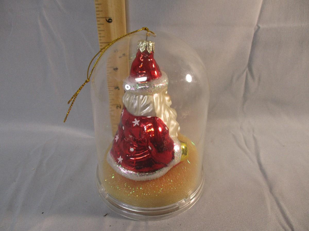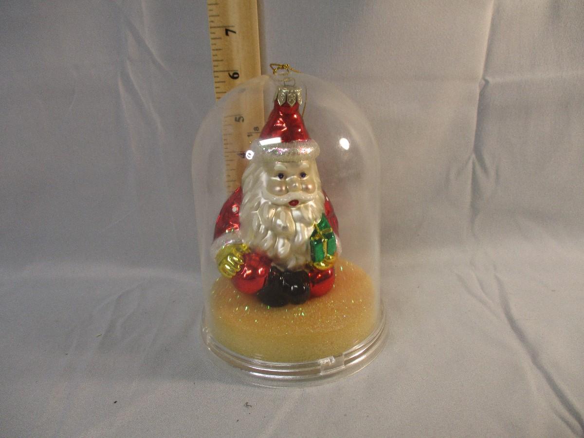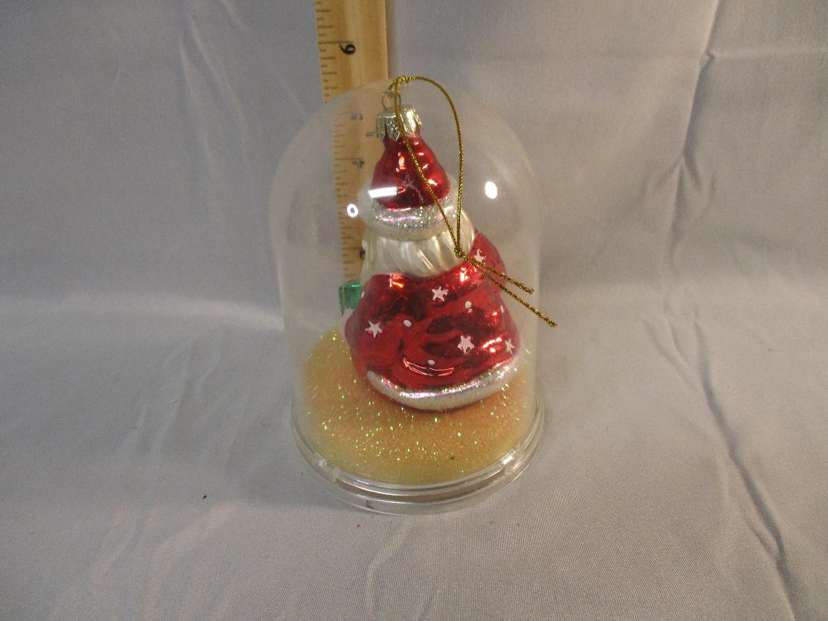 This appears to be a blown glass Santa ornament in a plastic protective display dome. I don't see any issues. The dome is about 6" tall.
