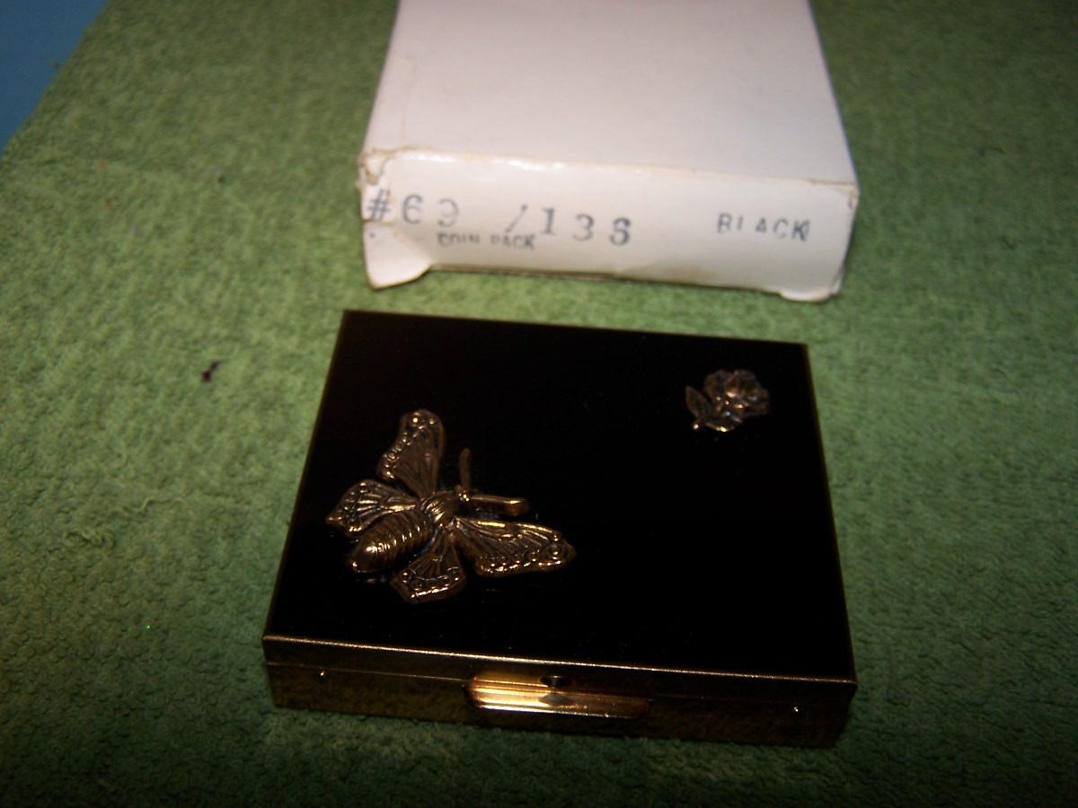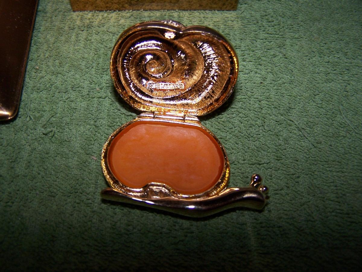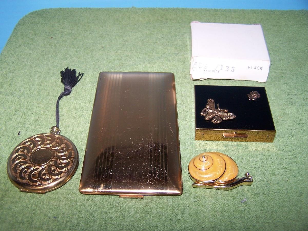 THESE ARE GREAT VINTAGE PERFUME/COIN/PILL BOX/CIGARETTE CASE(ELGIN AMERICAN). SNAIL IS A ESTEE LAUDER AND IS A UNUSED PERFUME. CIG CASE IS 3 1/8'' X 5 7/8''... LIGHT WEAR...
