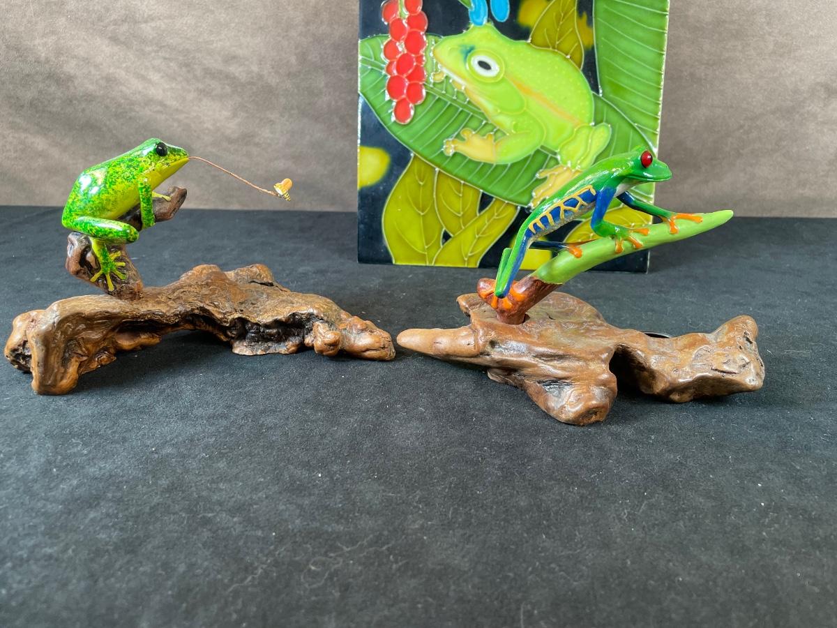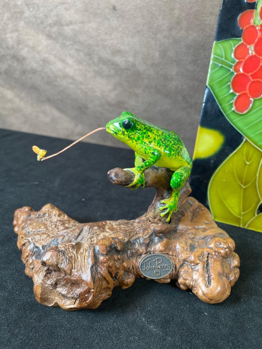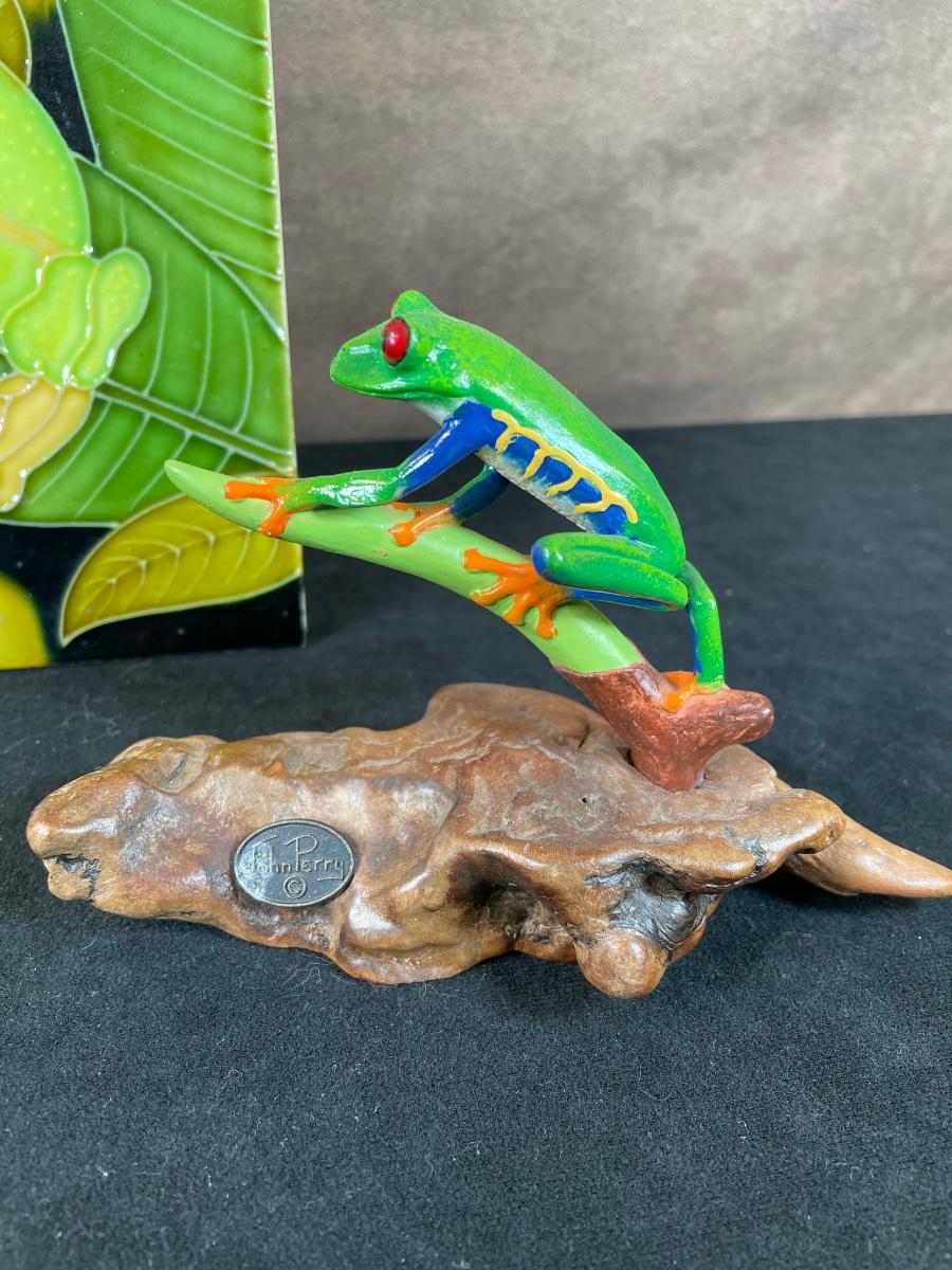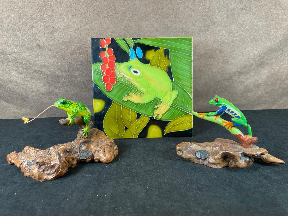 Two hand-painted resin frog figurines, by artist John Perry, mounted on a polished burl wood bases. 5" tall. Also included is a handmade ceramic tile with built-in stand or can be used as a trivet