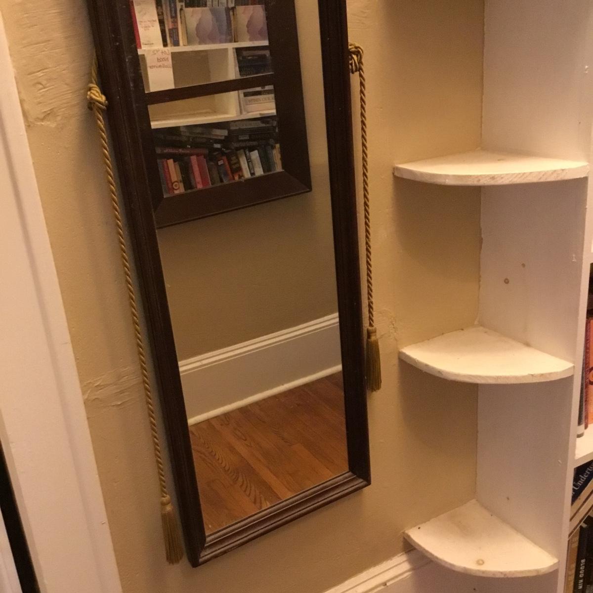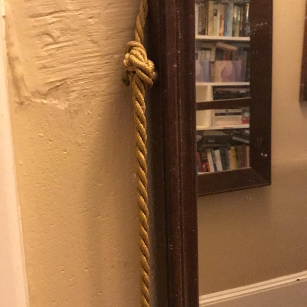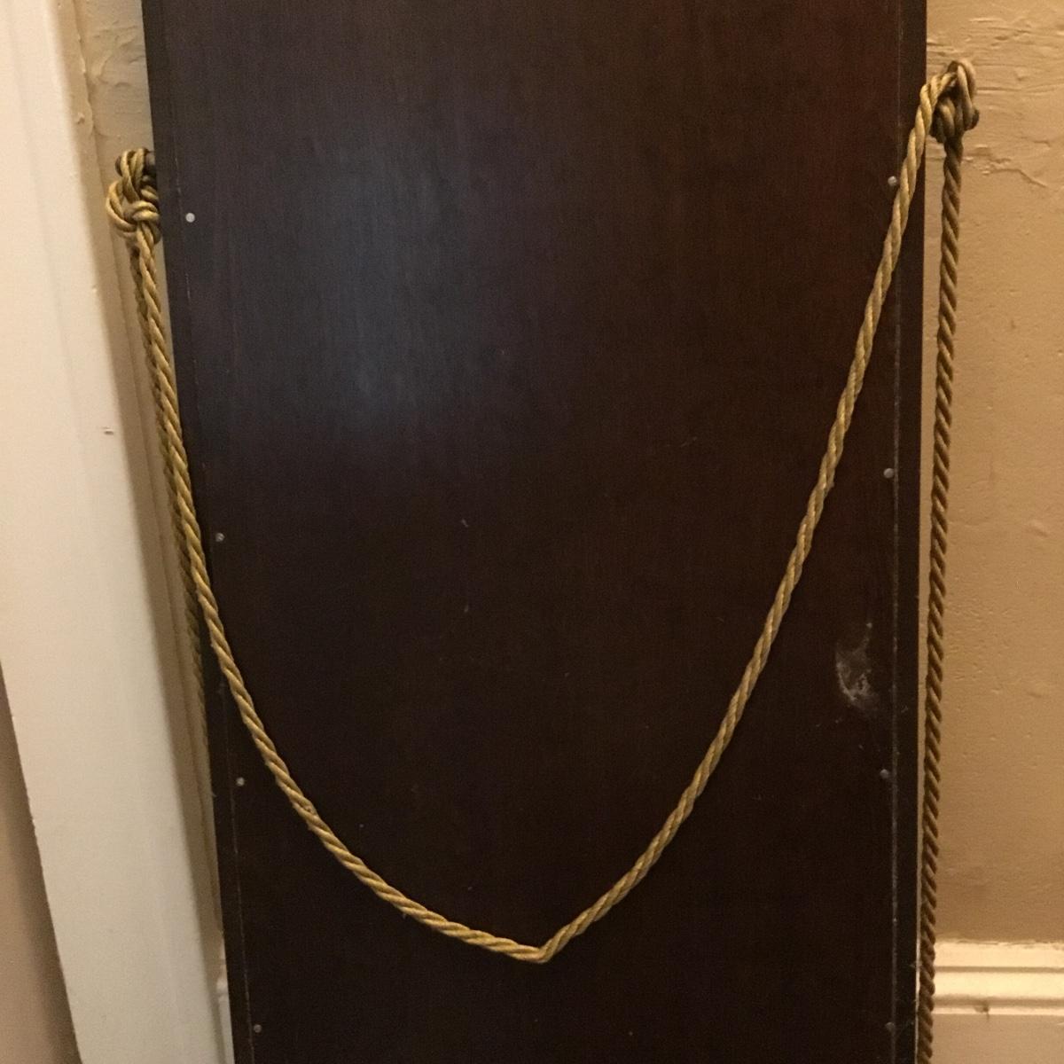 Measuring 15”X52” this long wall mirror will make a great addiction to an entryway or bedroom. Mirror is framed in dark wood and has curved details, see photos. Notice the functional and extra design feature of the golden tassel. See photos for details. Local pickup only.