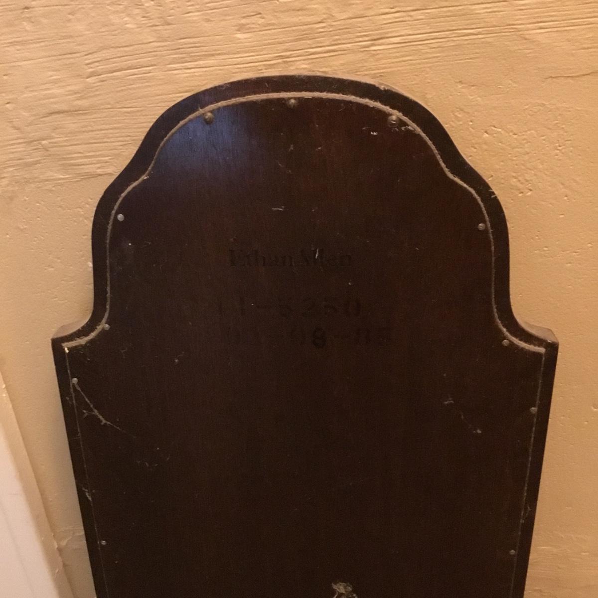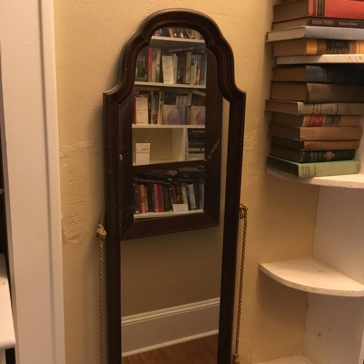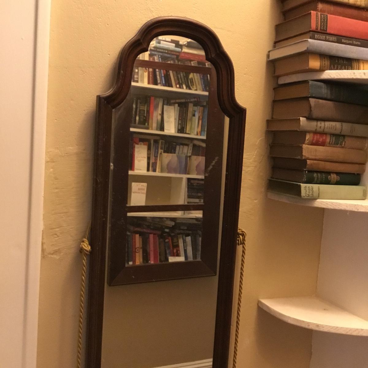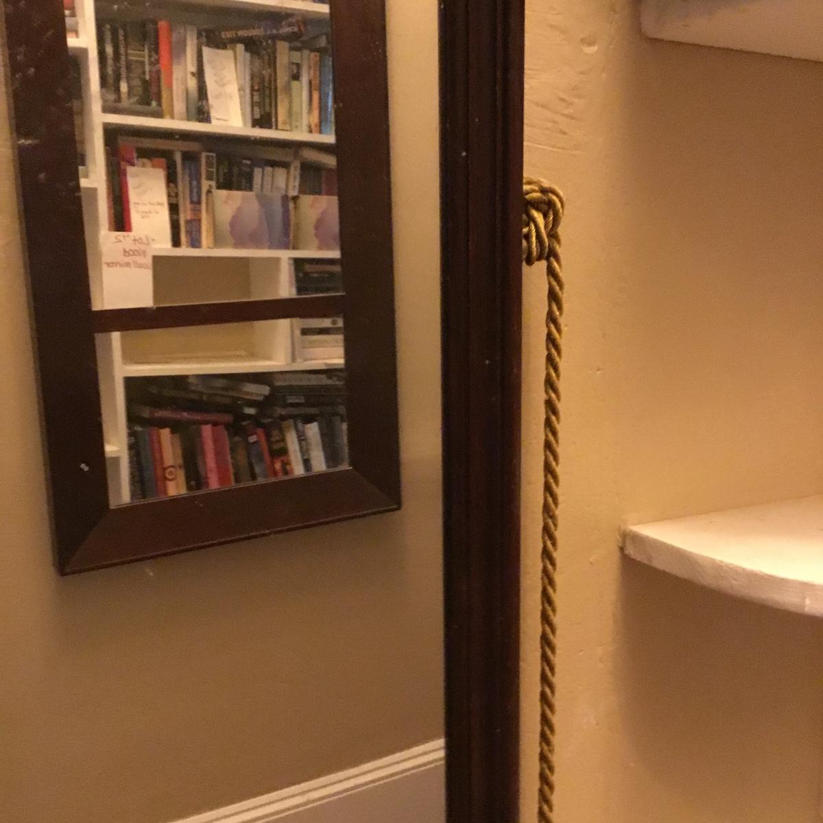 Measuring 15”X52” this long wall mirror will make a great addiction to an entryway or bedroom. Mirror is framed in dark wood and has curved details, see photos. Notice the functional and extra design feature of the golden tassel. See photos for details. Local pickup only.