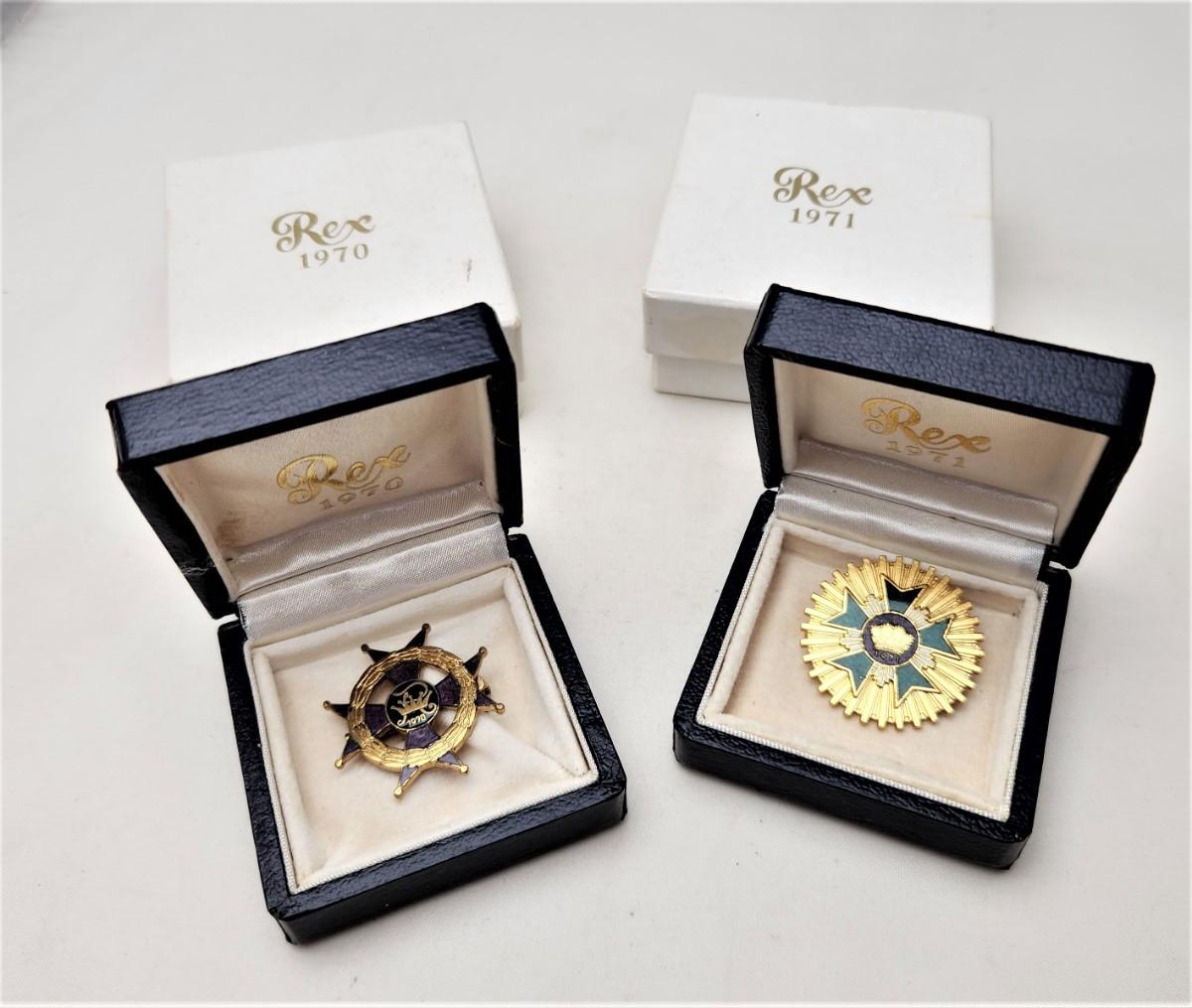 Two ladies ducals/favors from the Rex organization with original cases and boxes - 1970 and 1971. Each measures about 1.25" across. the 1970 brooch has very minor wear to the enamel - 1971 is good. I would be willing to ship these - you pay priority postage.