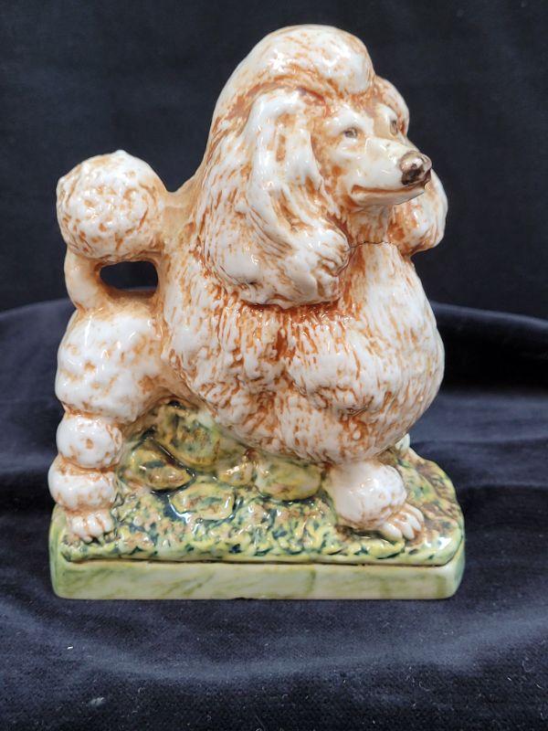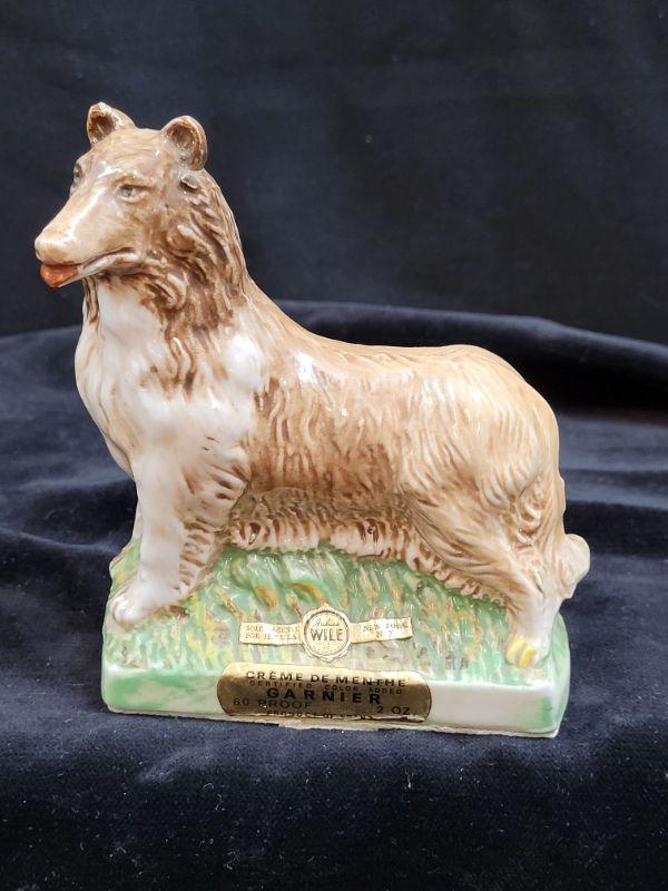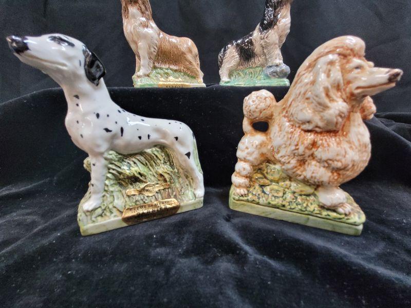 4 Dog shaped Garnier liquor bottles. 4 breeds Collie. Dalmatian, poodle, setter.