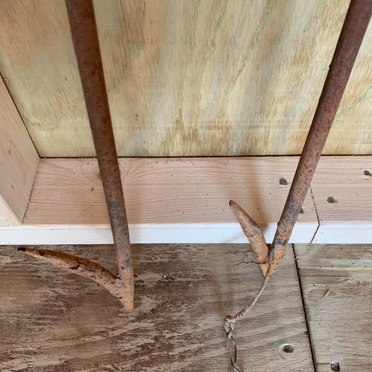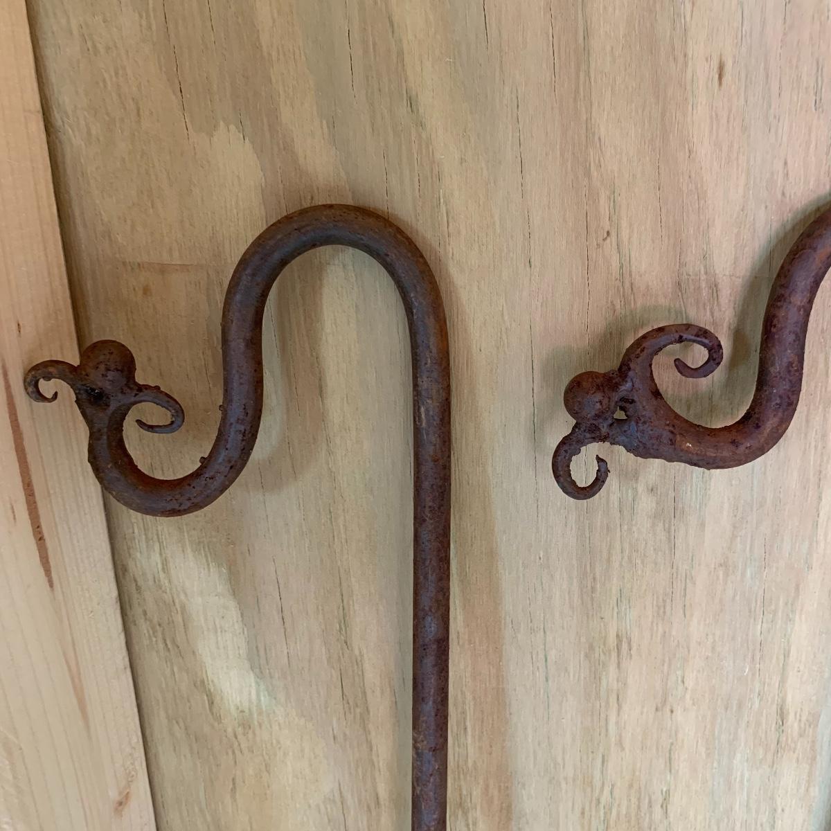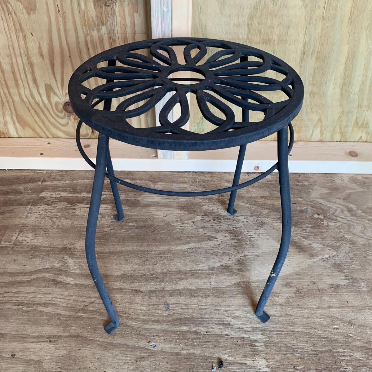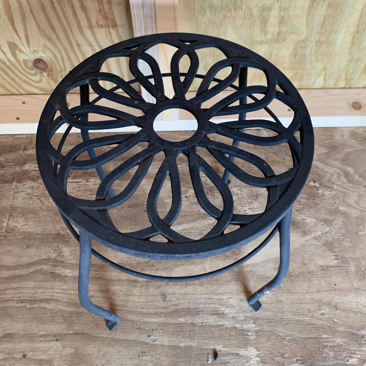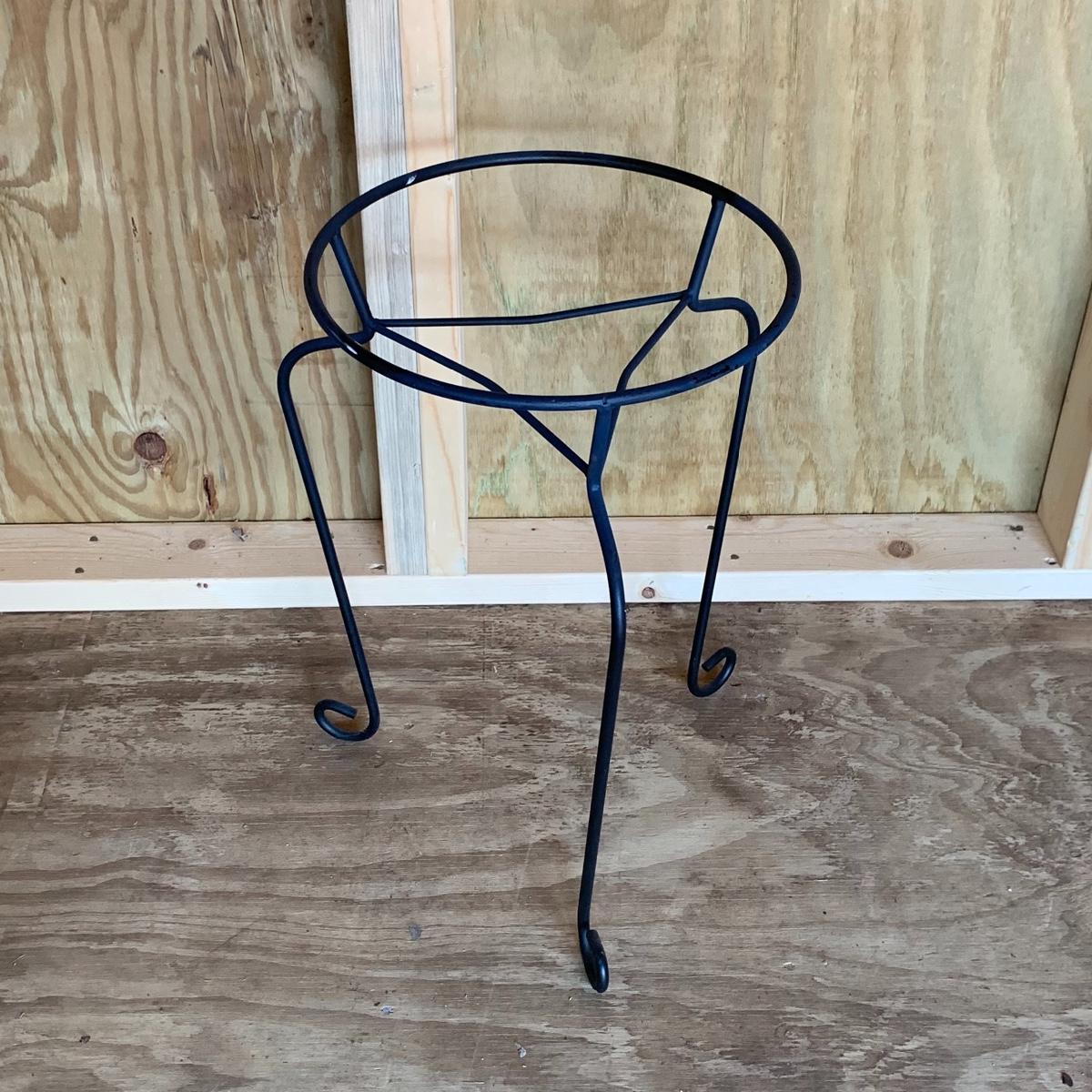 This lot contains a variety of metal plant stands and hangers, as well as a trellis. There are four table-like plant stands, five taller plant hanging poles, an obelisk shaped trellis, and some smaller decor. The plant stands range from 15”-20” tall. The trellis is about 13” x 13” x 62”. The tallest hanging pole has one hook on either side of it and is about 90” tall. These are all used and some are a bit rusted, but still lovely and functional. Local pickup only.