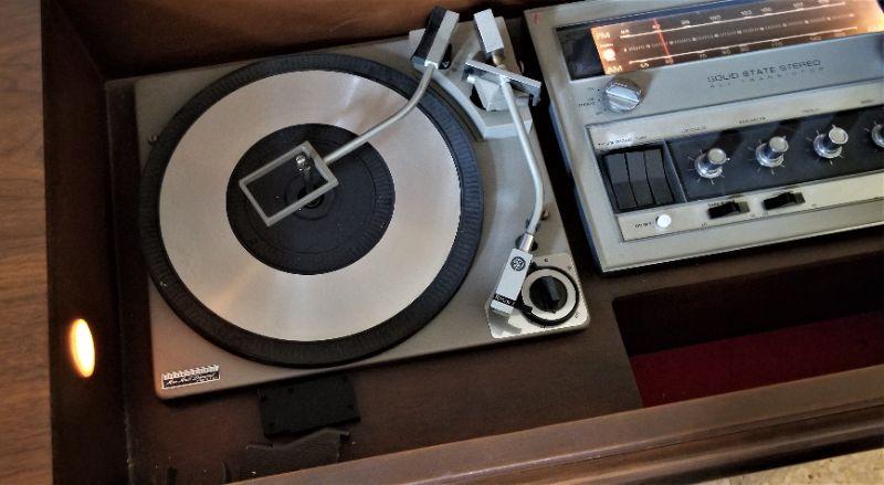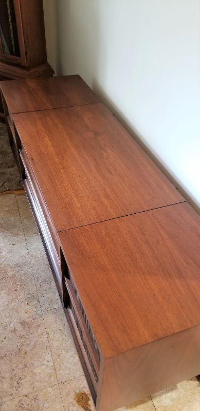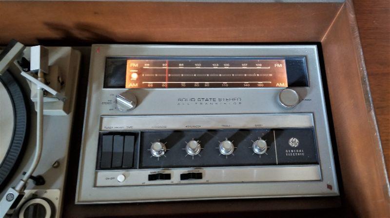 Project piece - this piece has a great mid-century cabinet in good condition - GE Solid State All Stereo All Transistor - has turntable and radio. Comes on, so it's getting power - turntable spins smoothly (so it doesn't need a belt) - appears the speakers are not working/hooked up and the control panel knobs are not engaging properly. Probably the components need to be taken apart and given a good clean. You are buying this stereo "as is." The cabinet is a beauty and could be repurposed for something else. You will need help to move it. It measures 59.5" long, 17" wide, 24" tall.