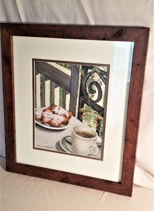 Nice framed print of morning coffee and beignets on the gallery - done in 2007 by Jan Bagwell. Good condition. Measures 14.5" x 16.5".