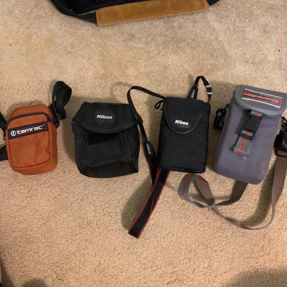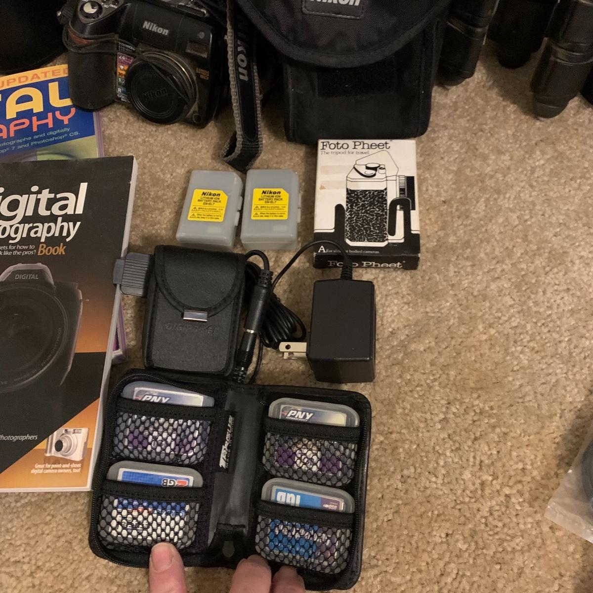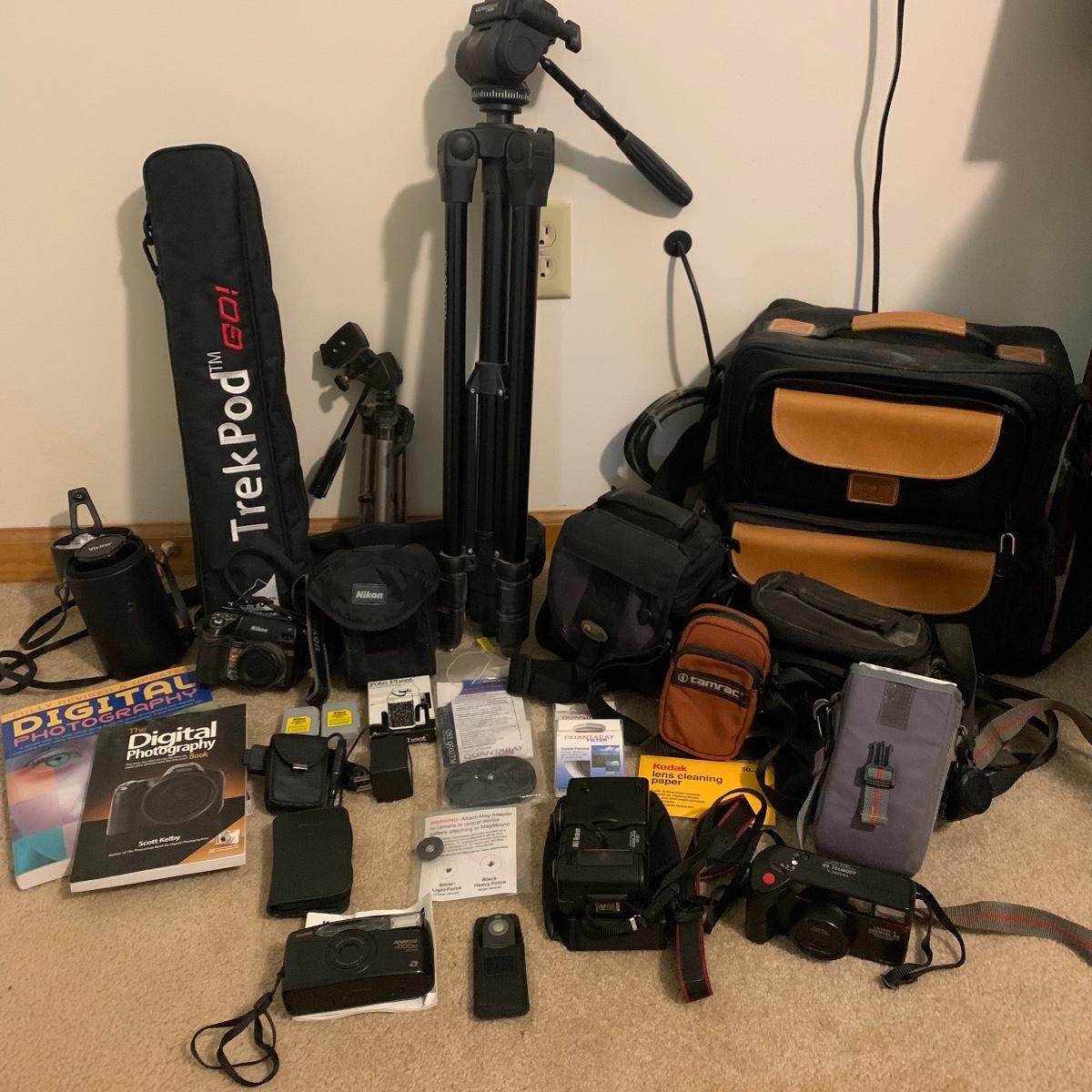Lot contains film and digital camera, tripods, lens and accessories. Kodak Advantix 4100ix zoom camera, Yashica Zoomtec 60 (film still in camera as battery is dead), Nikon Coolpix 950 digital camera and Nikon Cool Pix 8400 are the cameras featured in this lot. All appear to be operable but this is not verified. All were in cases and well kept. There are rechargeable batteries, a Vivitar lens and three tripods. Both large and small tripods are by Quanaray and there is a Trek Pod tripod/walking stick in like new condition.along with the cases the camera’s are stored in there are three extras LowePro, Tamrac and a large Quantary case that measures 16” x15” x8”. Two digital photography books also included in this lot. Shipping available.