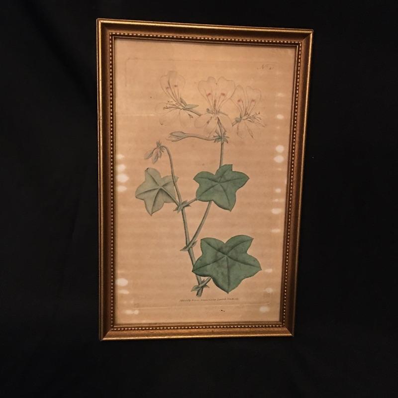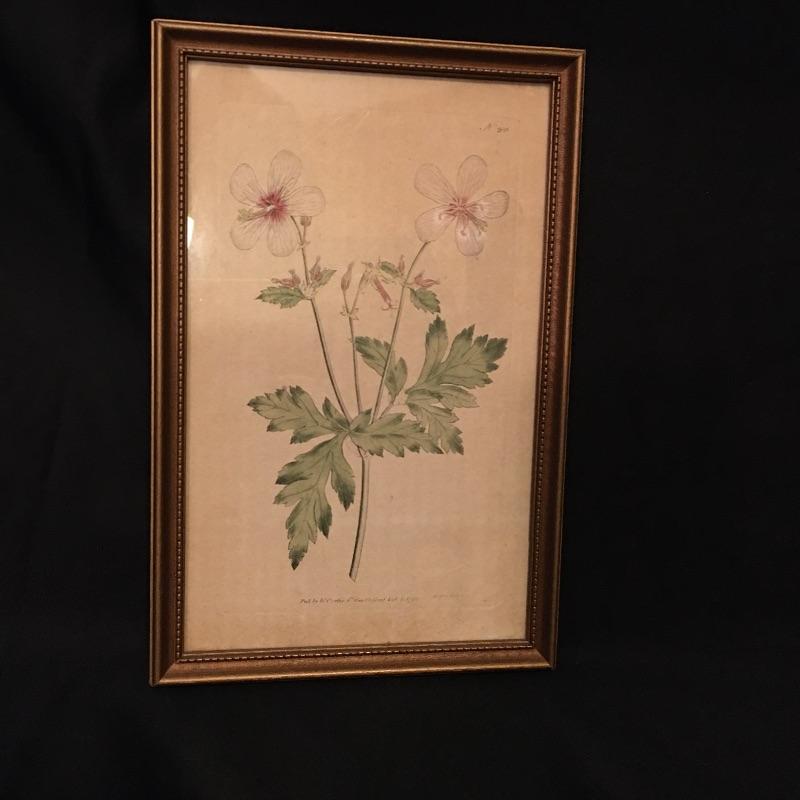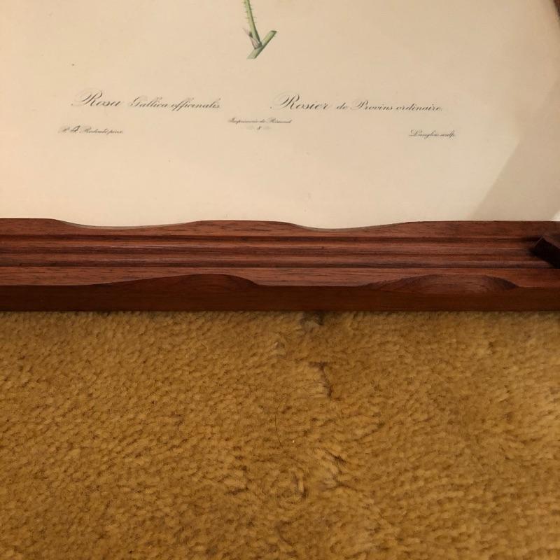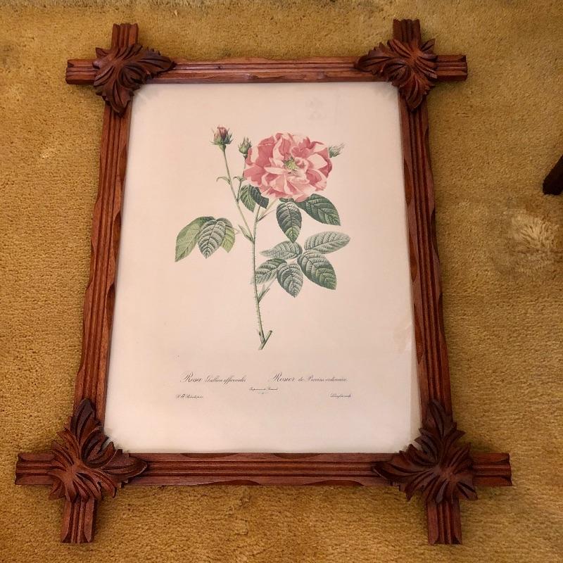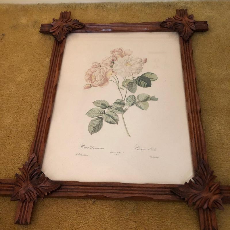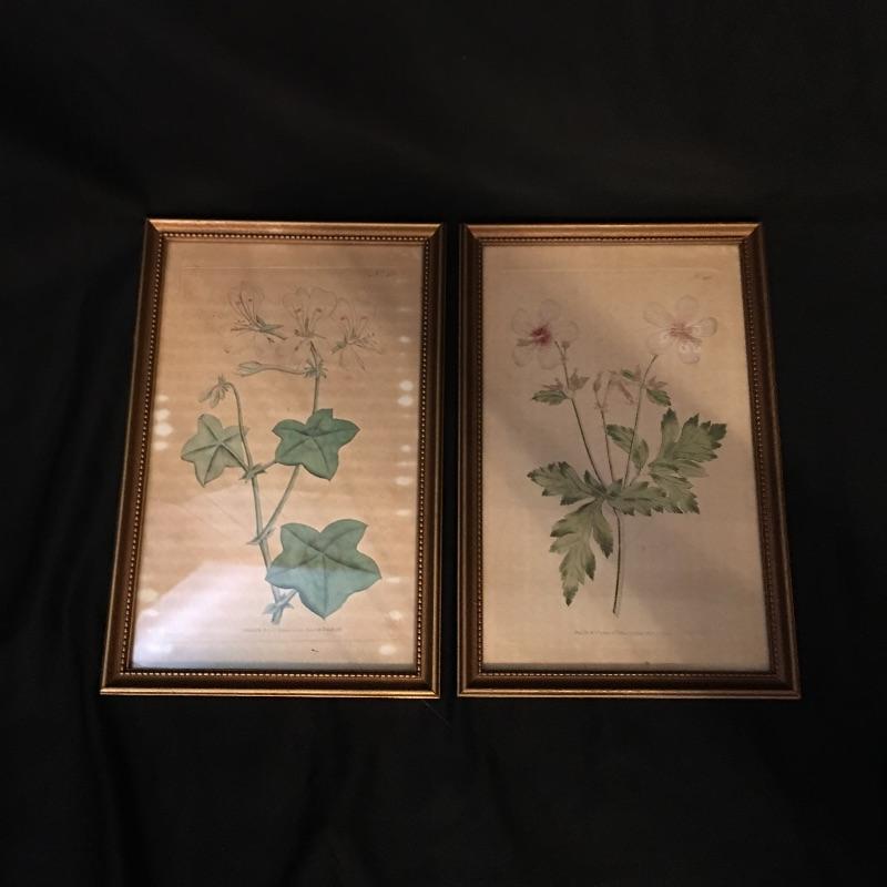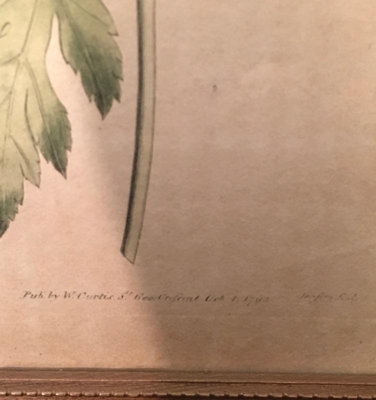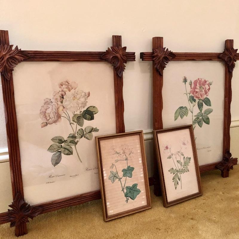 Two lovely pairs of floral prints. The smaller pair are marked published by W. Curtis and numbered 20 and 206 . Frames are wood. One of the prints has spots on each side, see pictures. Frame measures 6.5” x 10”. The other two prints are mounted in stunning wood frames and are labeled and signed. They measure 13.5” x 18”. They are both signed and numbered, so they appear to a part of a series of rose varieties prints.