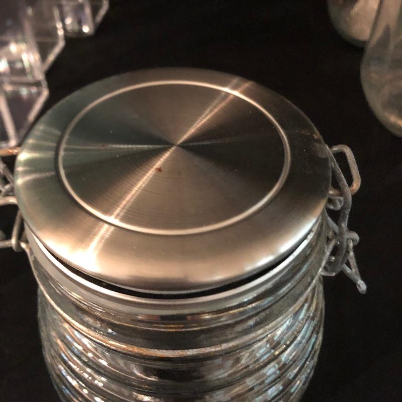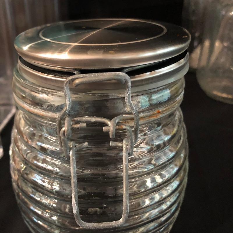 A total of 18 containers here that are perfect for storing your pantry staples. The 8 teal blue lidded canisters are plastic and made by Room Essentials. There are 5 metal Oggi flip lid canisters plus a yellow plastic one. Five glass canisters finish off this handy lot.