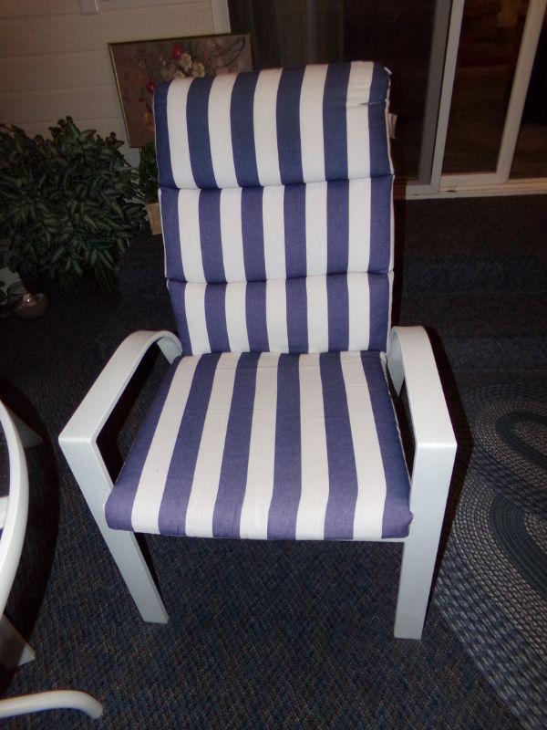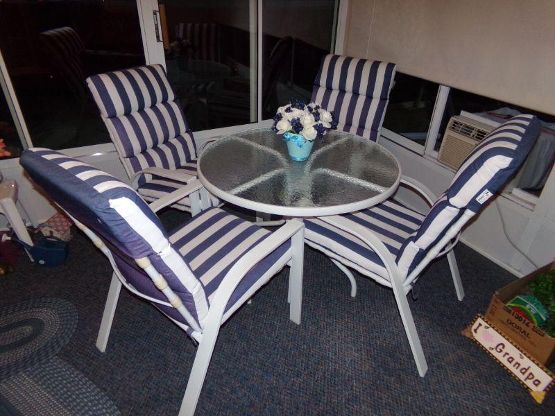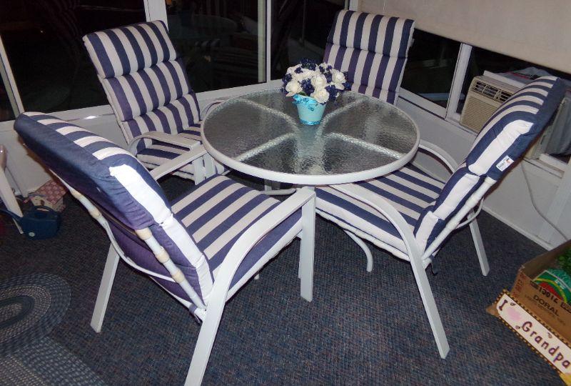 GLASS TOP PATIO TABLE 41" AND 4 LIGHT METAL CHAIRS W/CUSHIONS