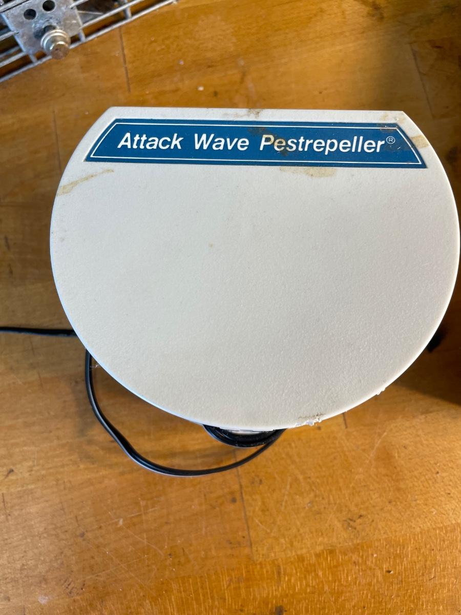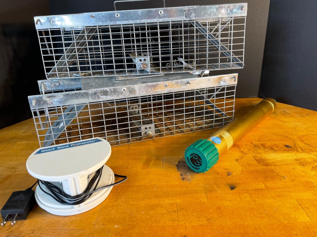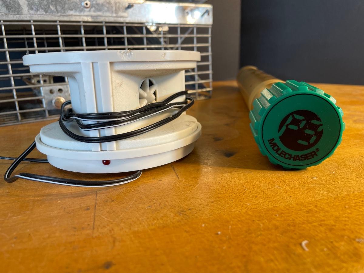 Pair of metal animal traps, "Molechaser" and an "Attack Wave Pest Repeller"