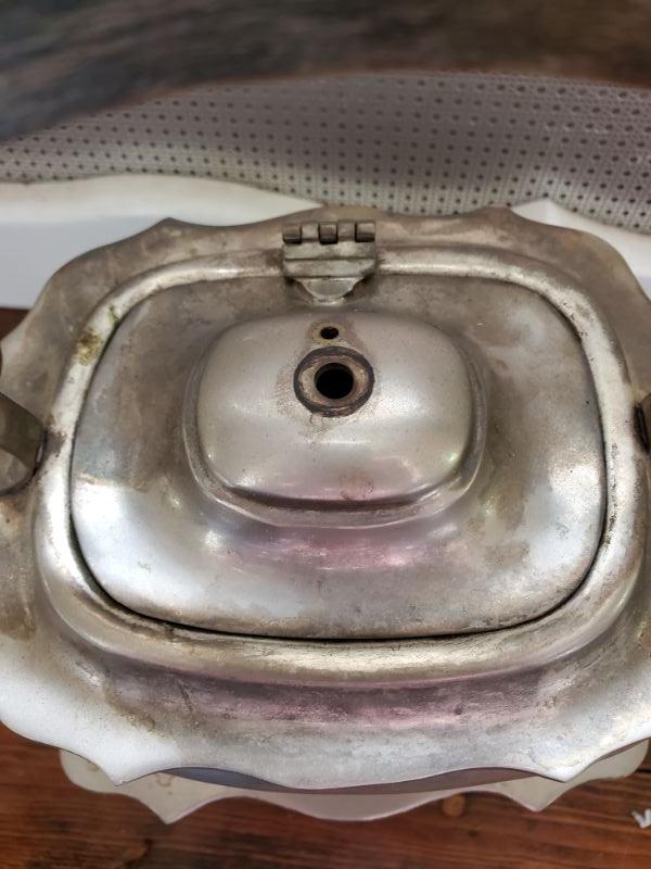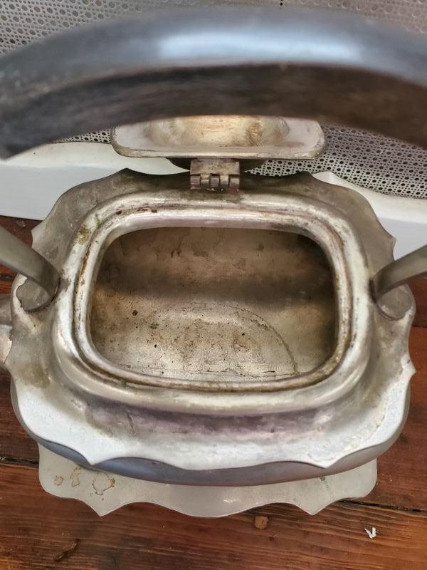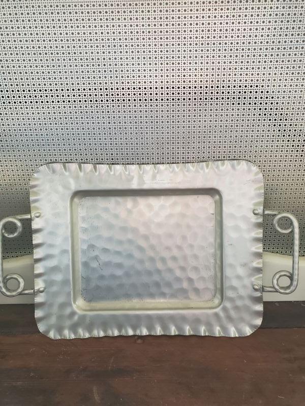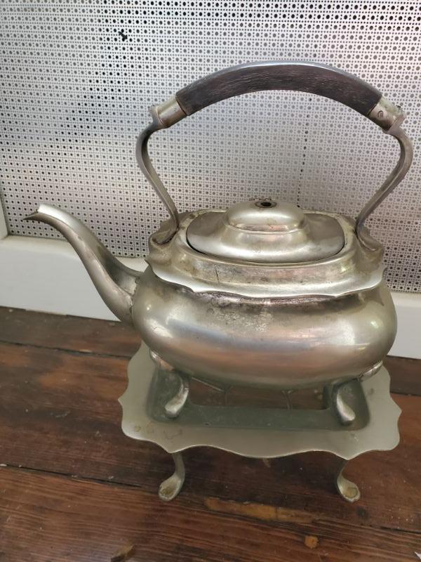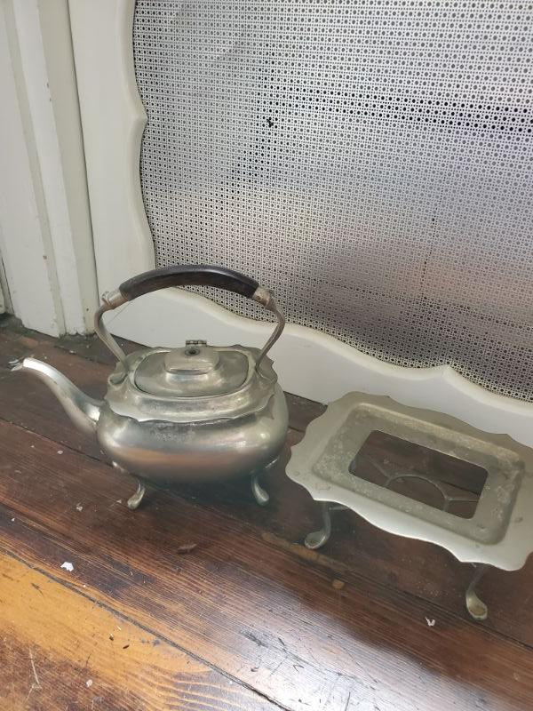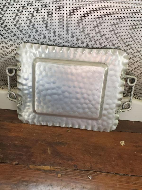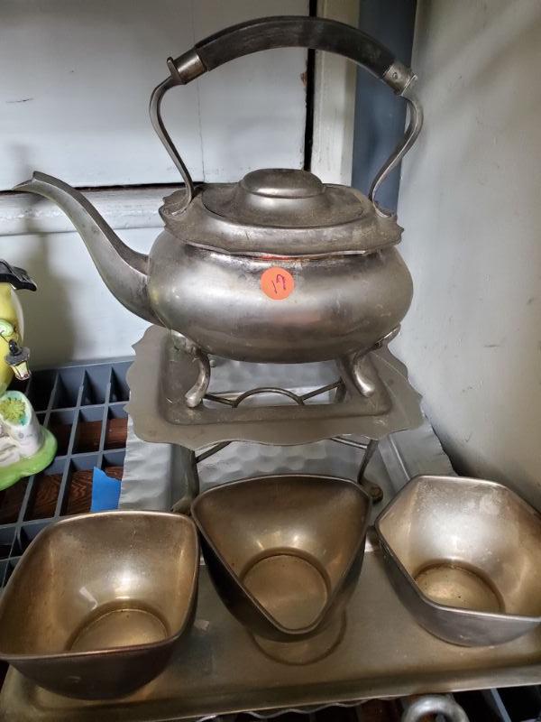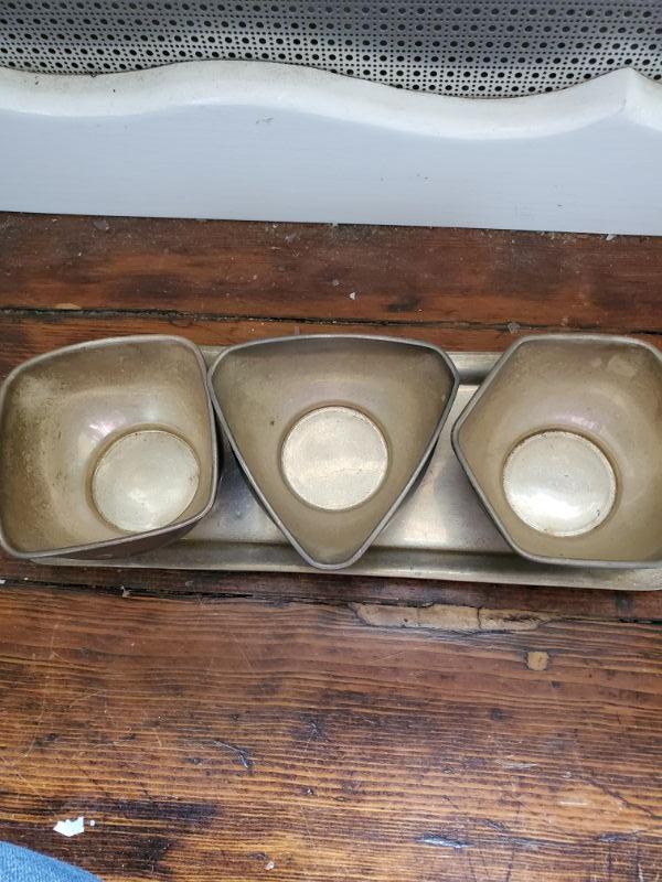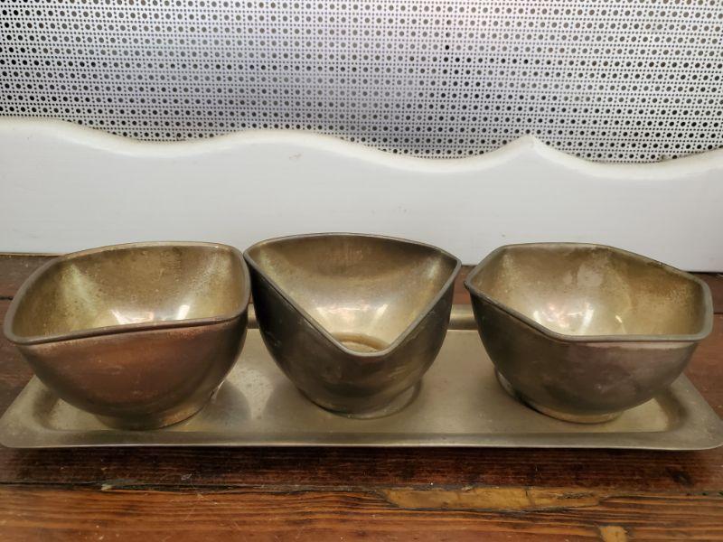 Tea pot on stand has lost its knob, three small bowls with tray, great for dips, and a hammered aluminum tray is 16x10.