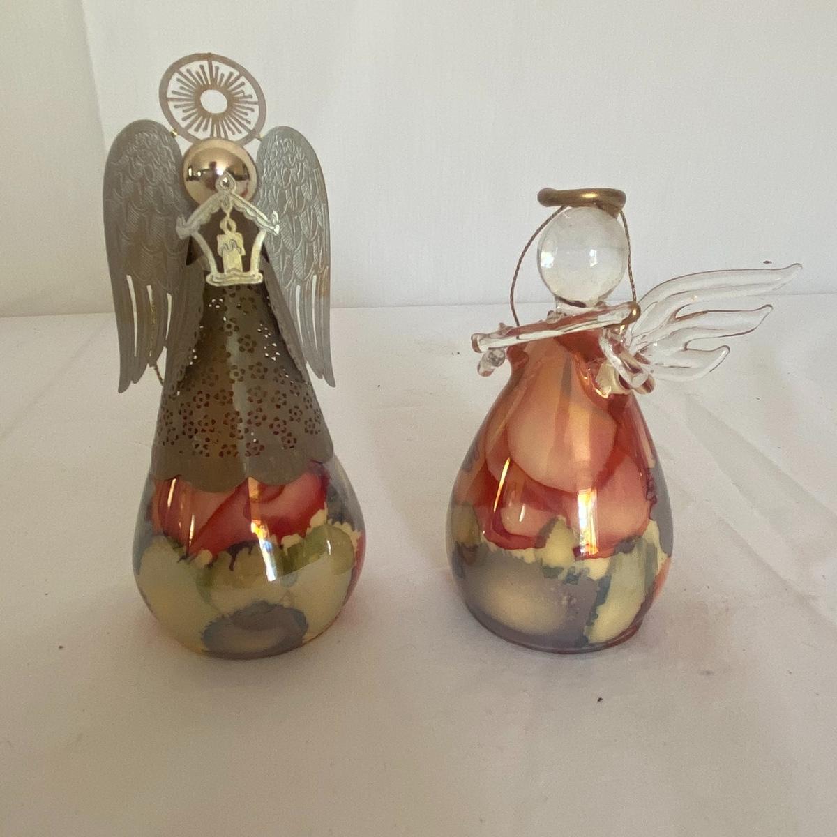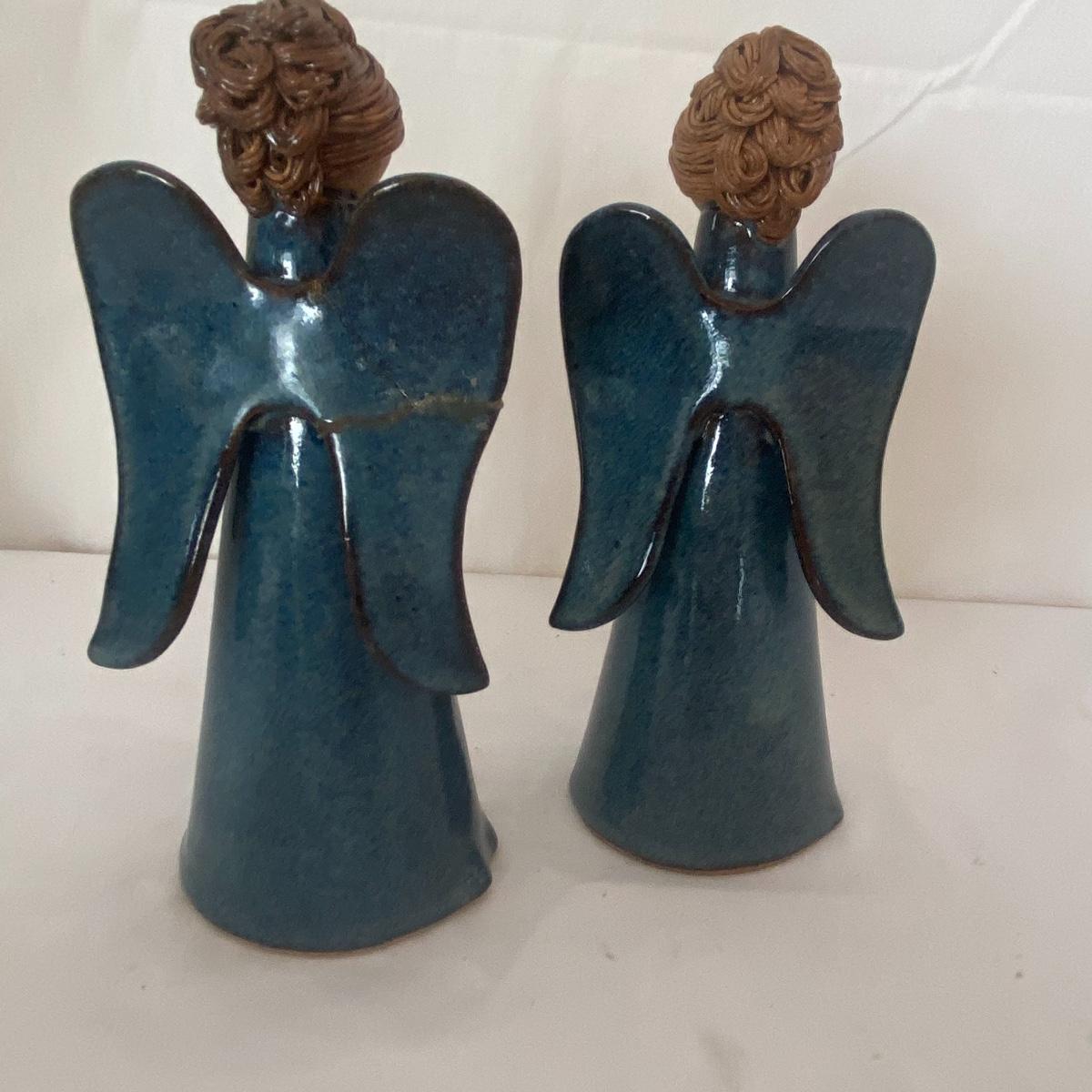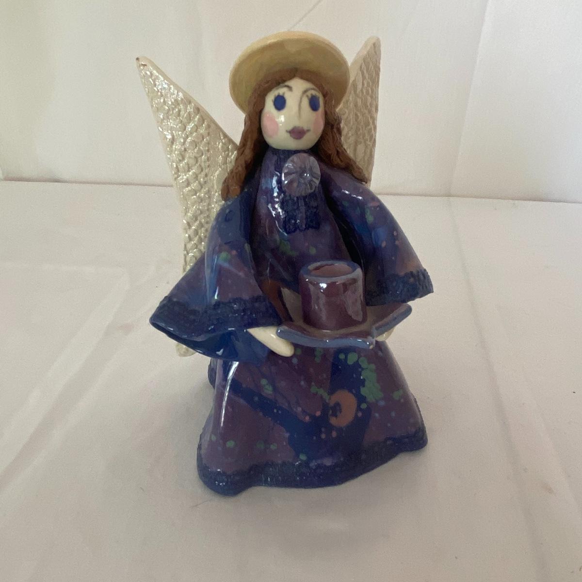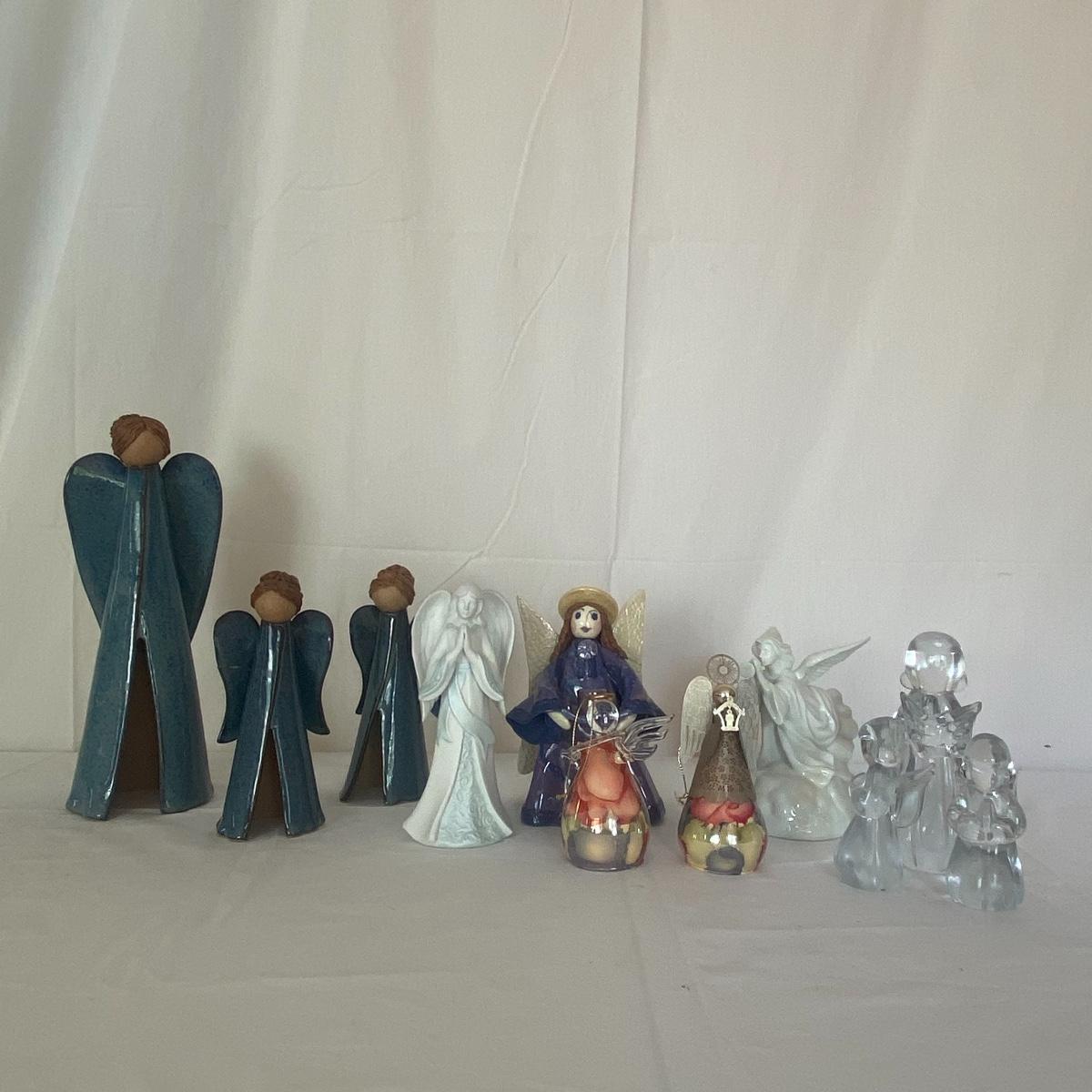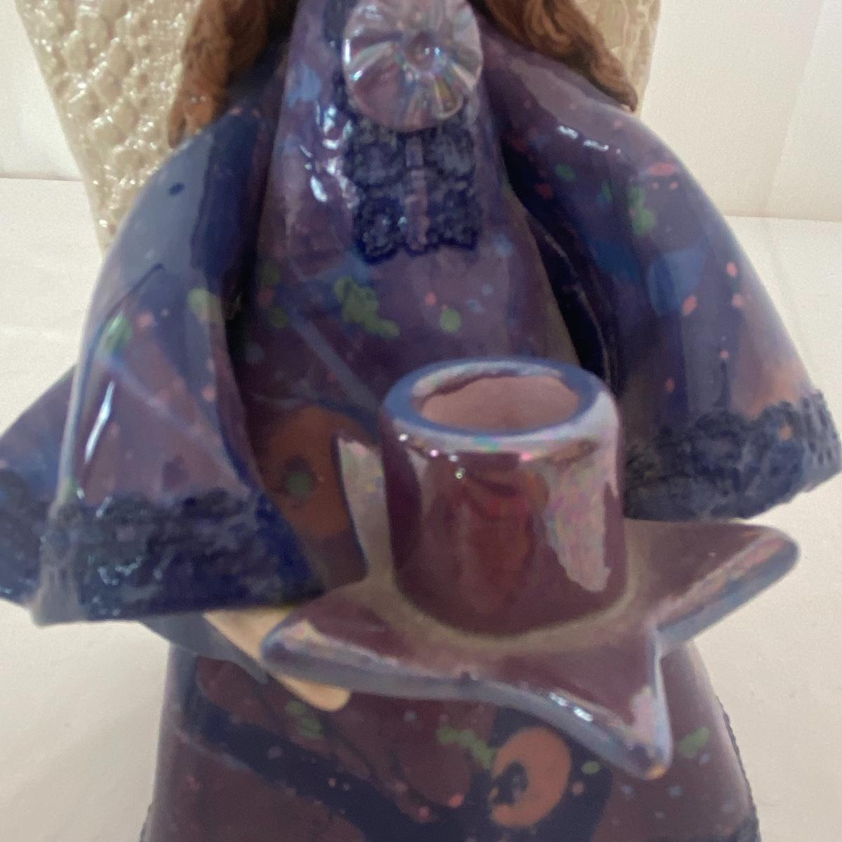 Angelic lot includes many decorative angel collectibles. Set of three sister angels, beautifully glazed and signed pottery, one angle appears to have a wing repair from previous break, see photos. Largest angel stands 11.5” tall. Set of three hand blown glass angels from Twos Company. Smallest angel stands approximately 4” tall. See photos. A glass angel music maker standing 5.5” tall included as well, with a delightful tune! Two additional angel figurines are included, one white and blue and the other is purple and also a candle holder! Lastly, included in this lot are a pair of Russ Bernie Co. angel ornaments. See photos for stunning colors and details. Shipping available!