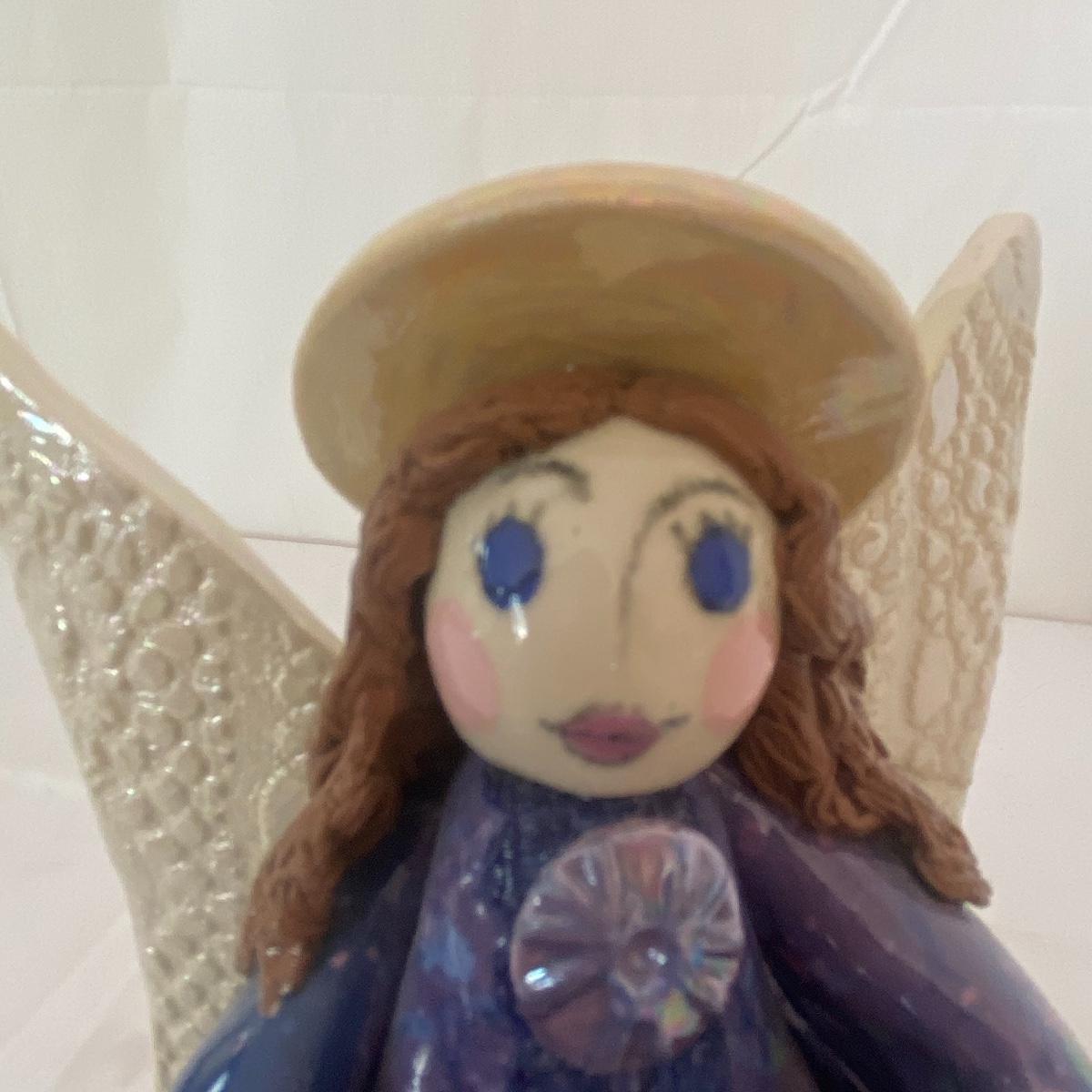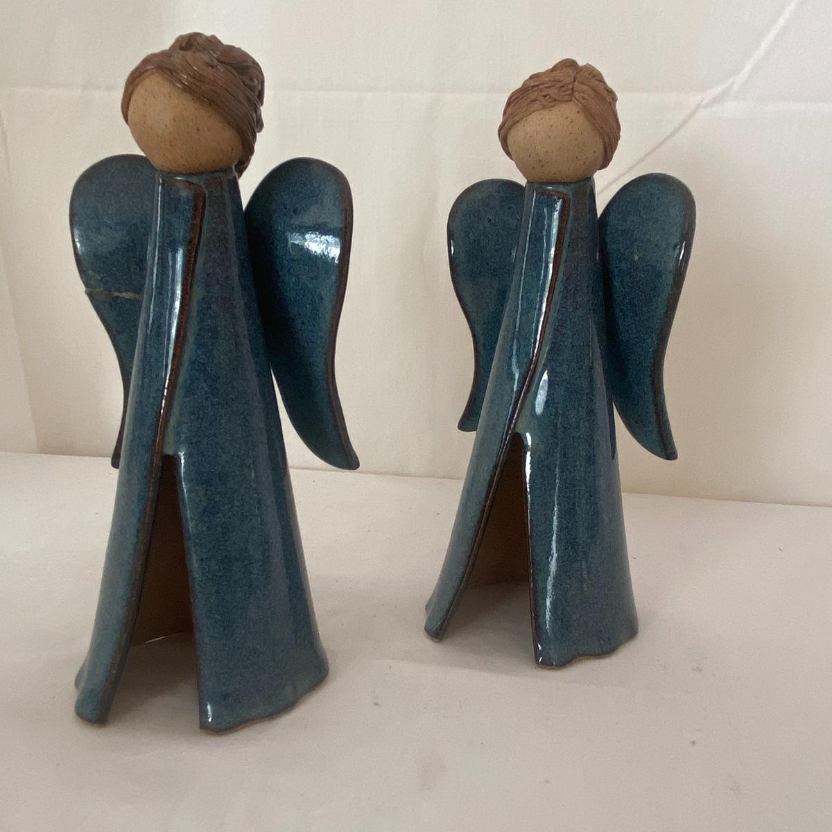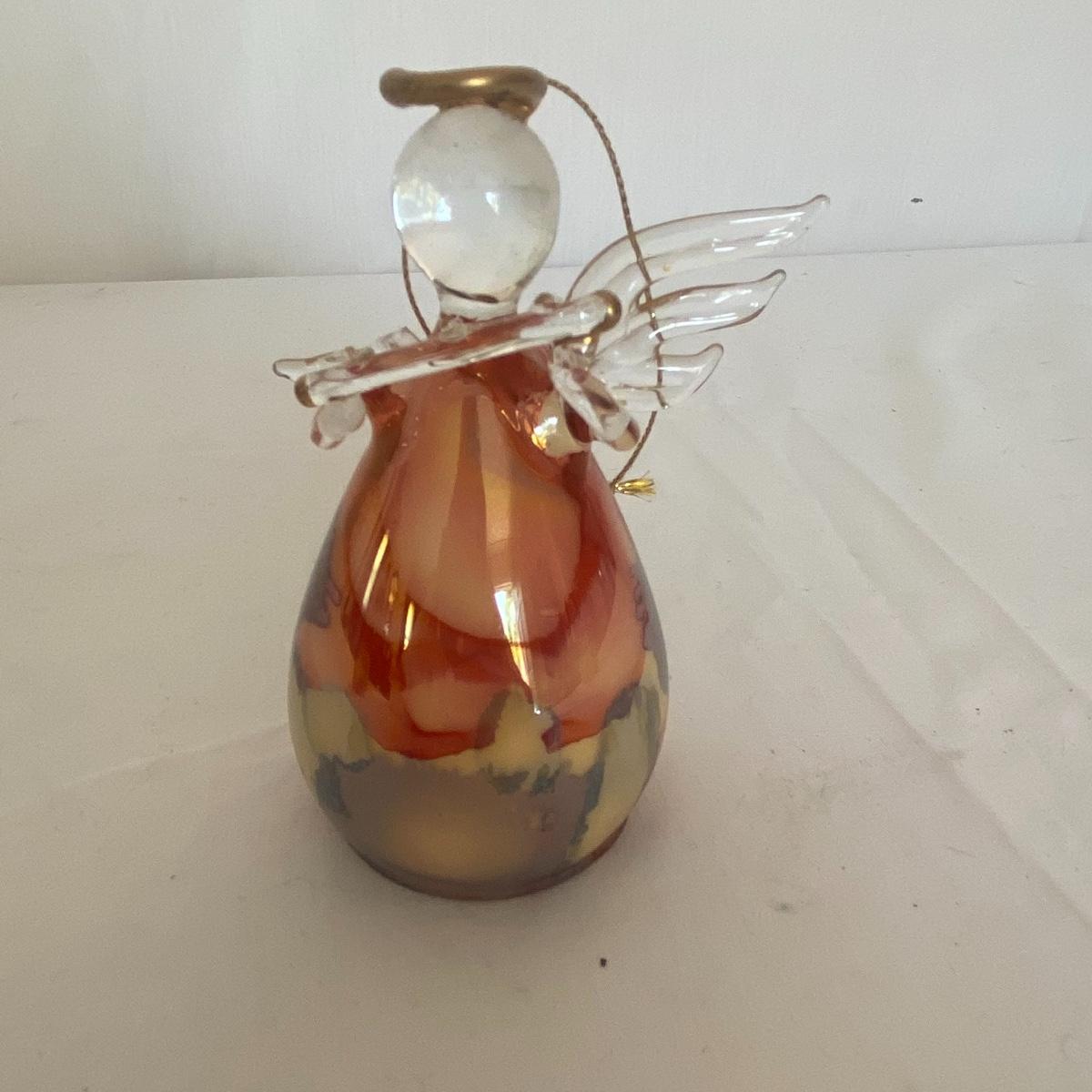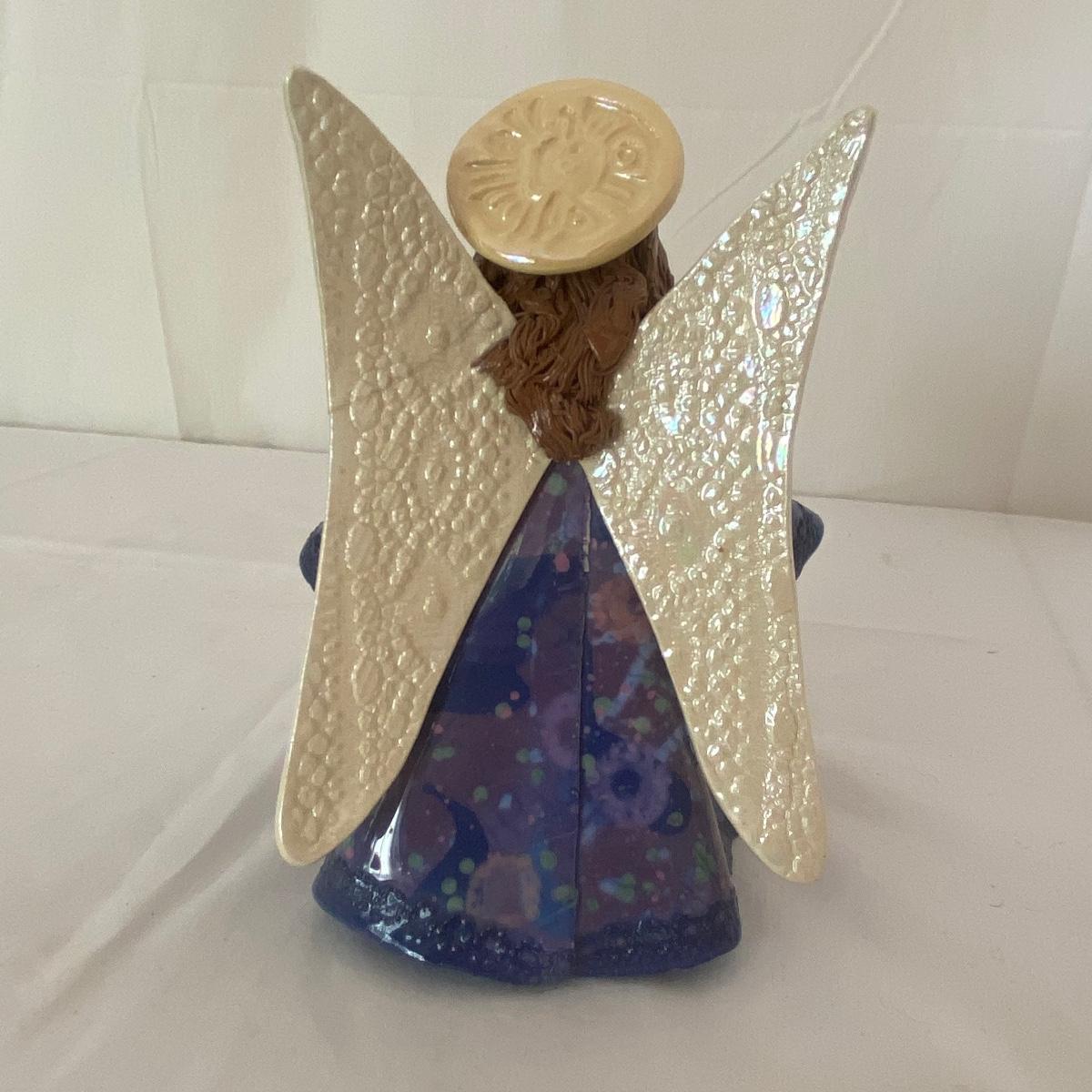 Angelic lot includes many decorative angel collectibles. Set of three sister angels, beautifully glazed and signed pottery, one angle appears to have a wing repair from previous break, see photos. Largest angel stands 11.5” tall. Set of three hand blown glass angels from Twos Company. Smallest angel stands approximately 4” tall. See photos. A glass angel music maker standing 5.5” tall included as well, with a delightful tune! Two additional angel figurines are included, one white and blue and the other is purple and also a candle holder! Lastly, included in this lot are a pair of Russ Bernie Co. angel ornaments. See photos for stunning colors and details. Shipping available!