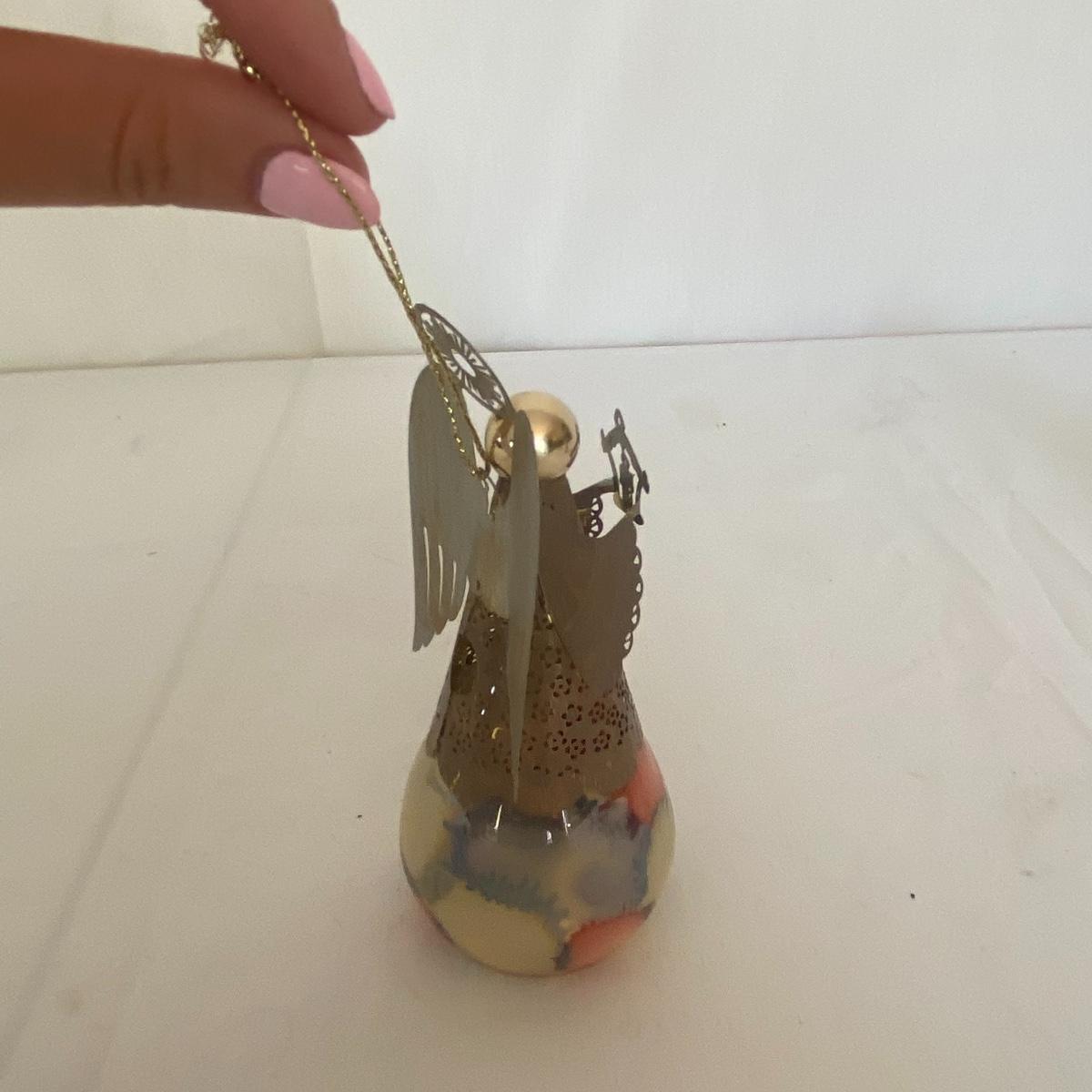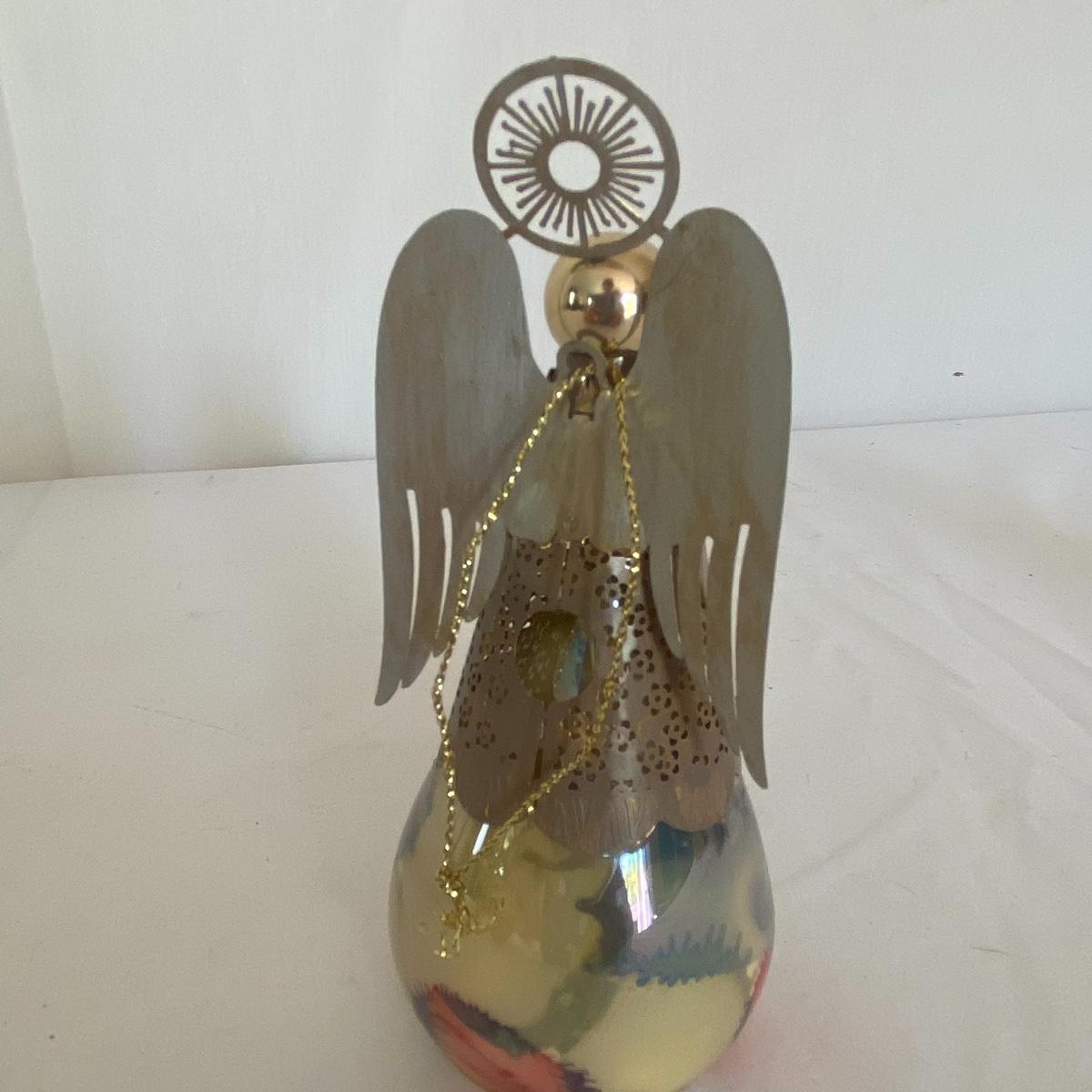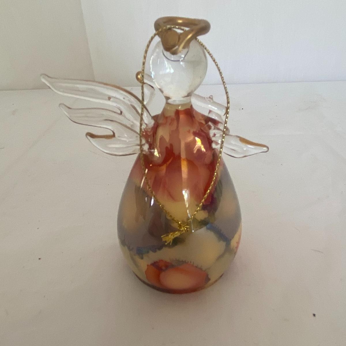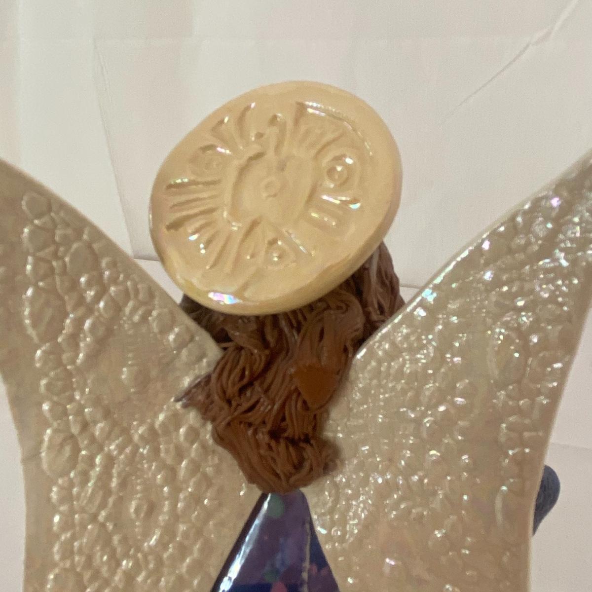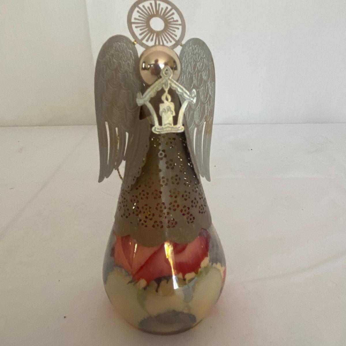 Angelic lot includes many decorative angel collectibles. Set of three sister angels, beautifully glazed and signed pottery, one angle appears to have a wing repair from previous break, see photos. Largest angel stands 11.5” tall. Set of three hand blown glass angels from Twos Company. Smallest angel stands approximately 4” tall. See photos. A glass angel music maker standing 5.5” tall included as well, with a delightful tune! Two additional angel figurines are included, one white and blue and the other is purple and also a candle holder! Lastly, included in this lot are a pair of Russ Bernie Co. angel ornaments. See photos for stunning colors and details. Shipping available!