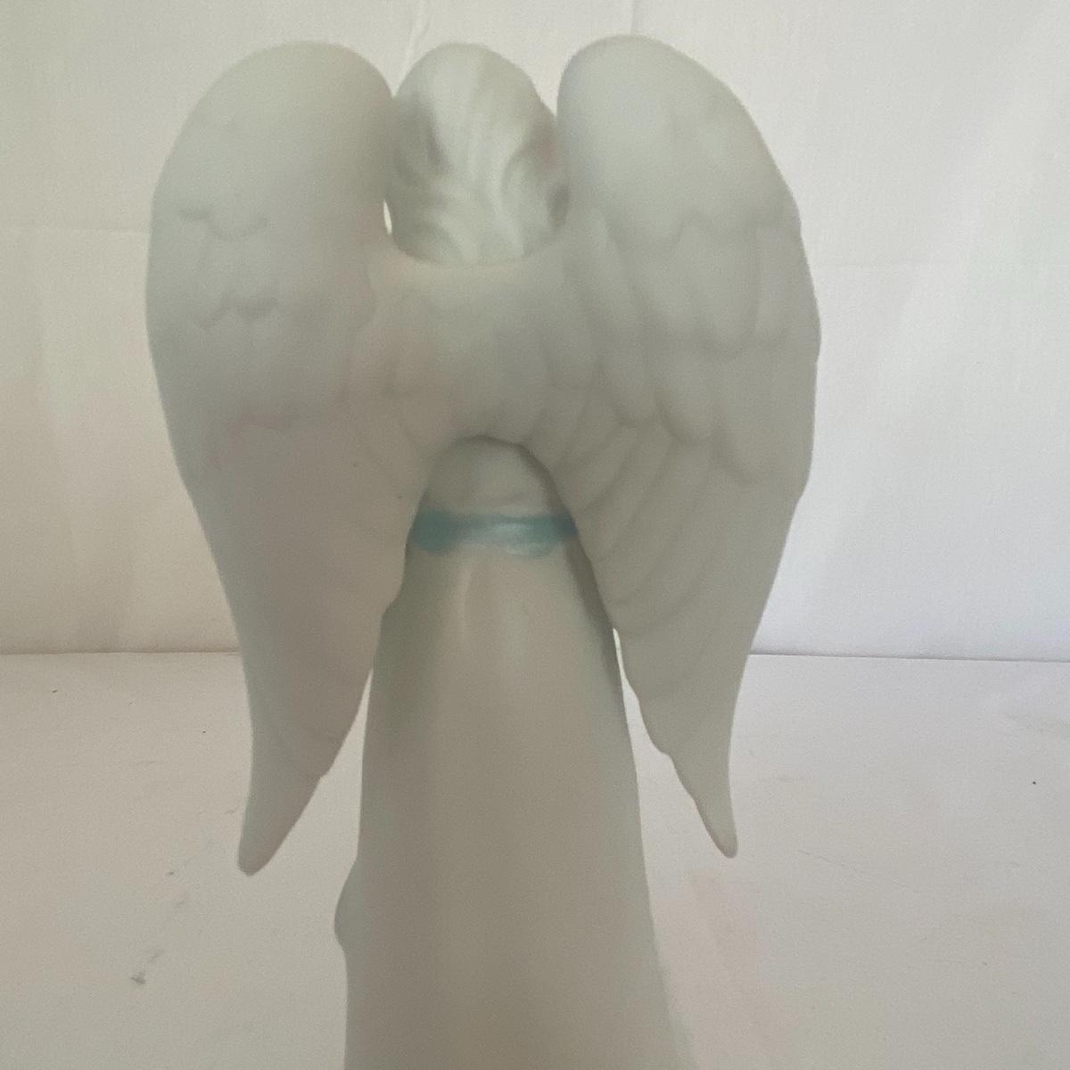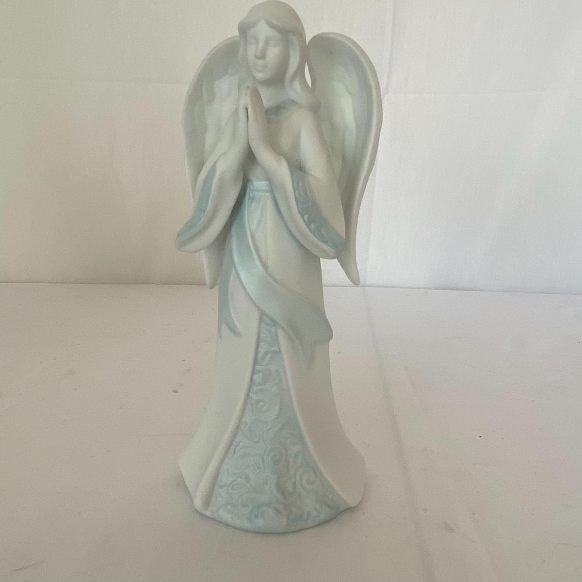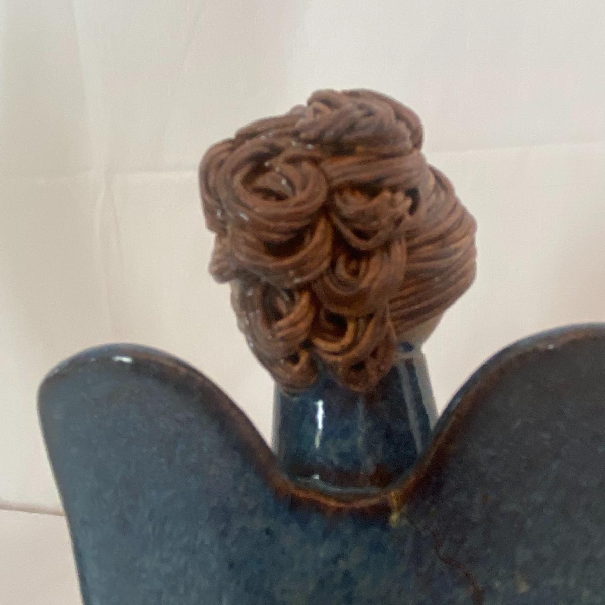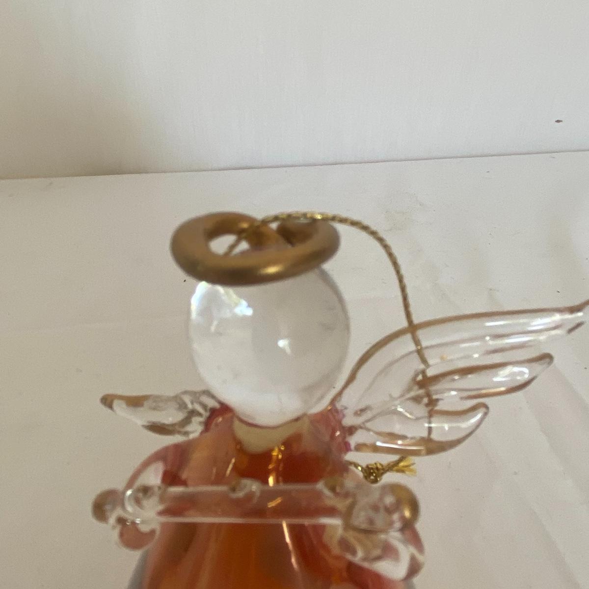 Angelic lot includes many decorative angel collectibles. Set of three sister angels, beautifully glazed and signed pottery, one angle appears to have a wing repair from previous break, see photos. Largest angel stands 11.5” tall. Set of three hand blown glass angels from Twos Company. Smallest angel stands approximately 4” tall. See photos. A glass angel music maker standing 5.5” tall included as well, with a delightful tune! Two additional angel figurines are included, one white and blue and the other is purple and also a candle holder! Lastly, included in this lot are a pair of Russ Bernie Co. angel ornaments. See photos for stunning colors and details. Shipping available!