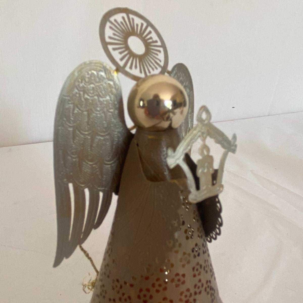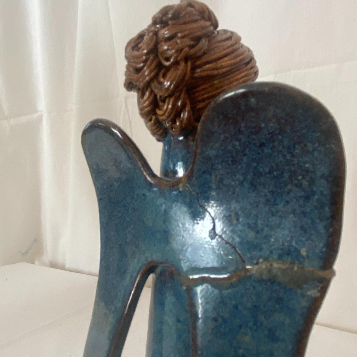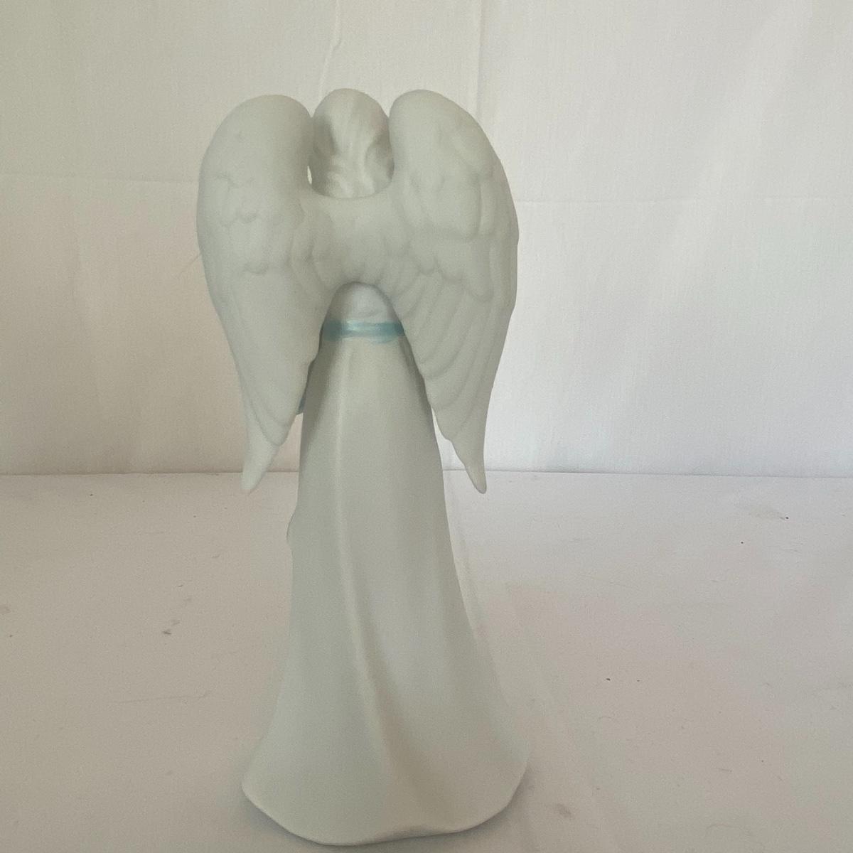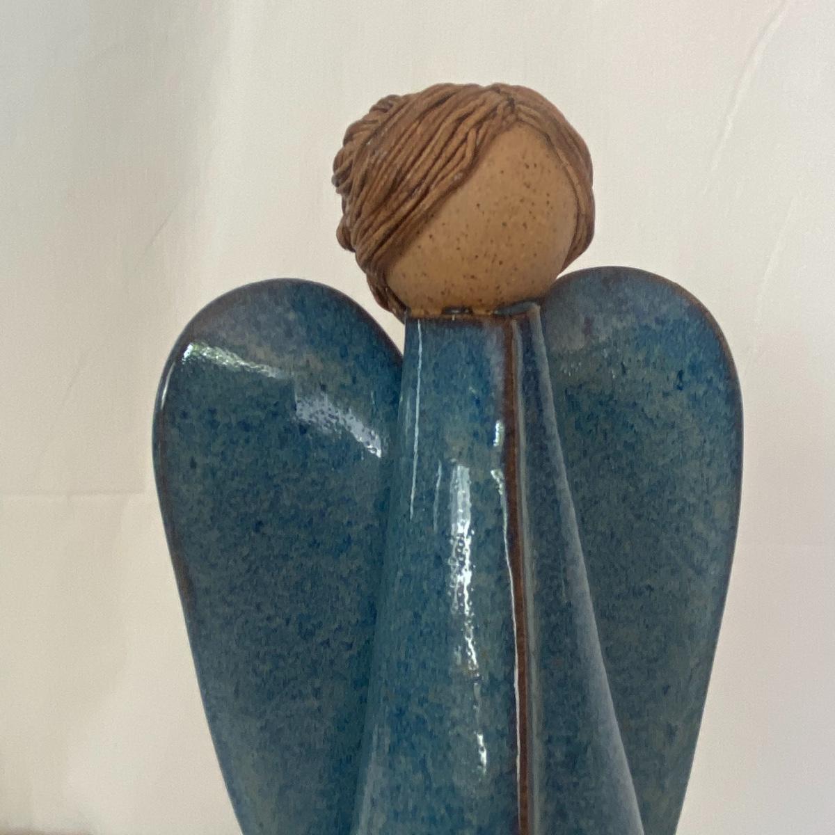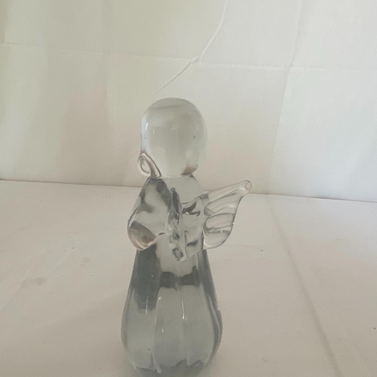 Angelic lot includes many decorative angel collectibles. Set of three sister angels, beautifully glazed and signed pottery, one angle appears to have a wing repair from previous break, see photos. Largest angel stands 11.5” tall. Set of three hand blown glass angels from Twos Company. Smallest angel stands approximately 4” tall. See photos. A glass angel music maker standing 5.5” tall included as well, with a delightful tune! Two additional angel figurines are included, one white and blue and the other is purple and also a candle holder! Lastly, included in this lot are a pair of Russ Bernie Co. angel ornaments. See photos for stunning colors and details. Shipping available!
