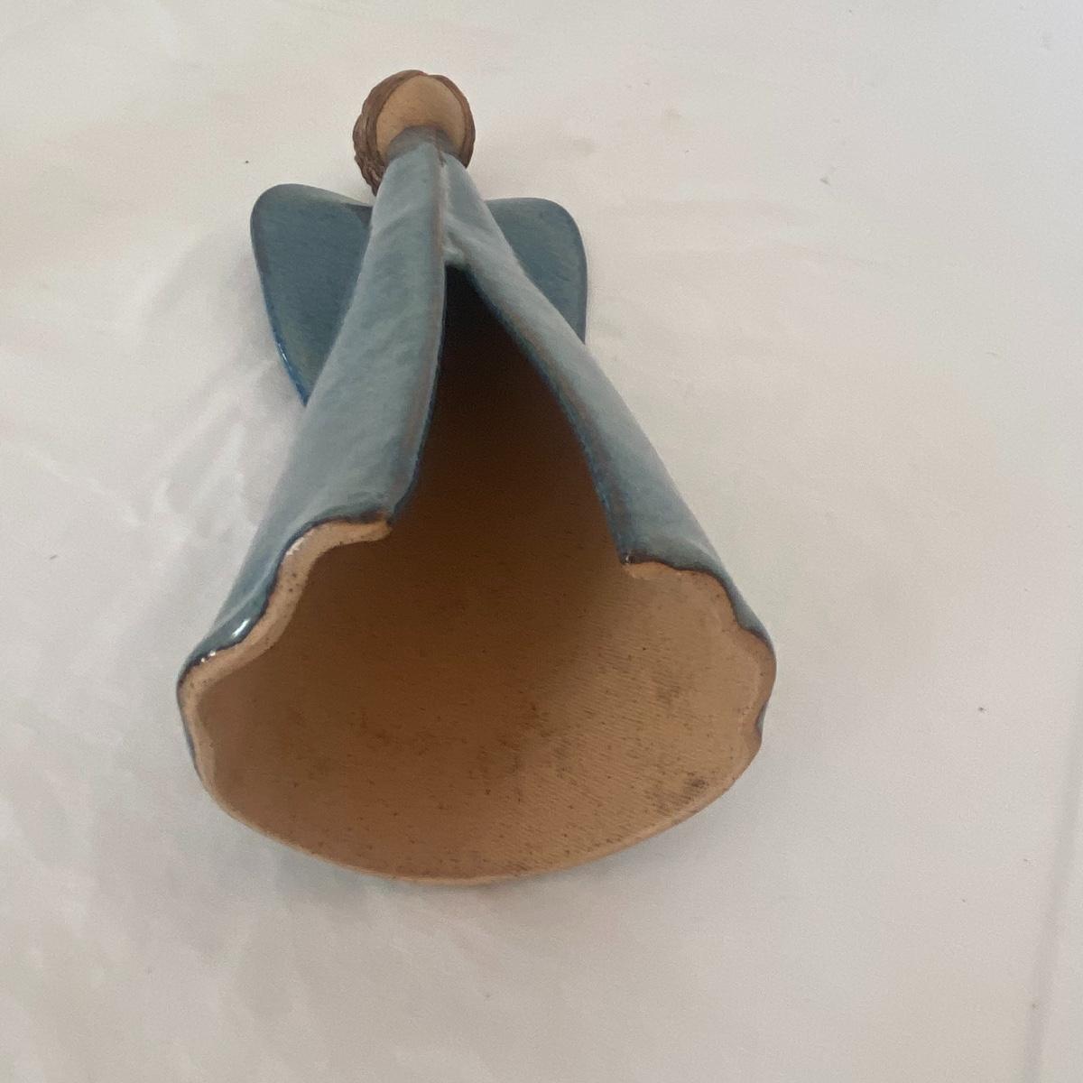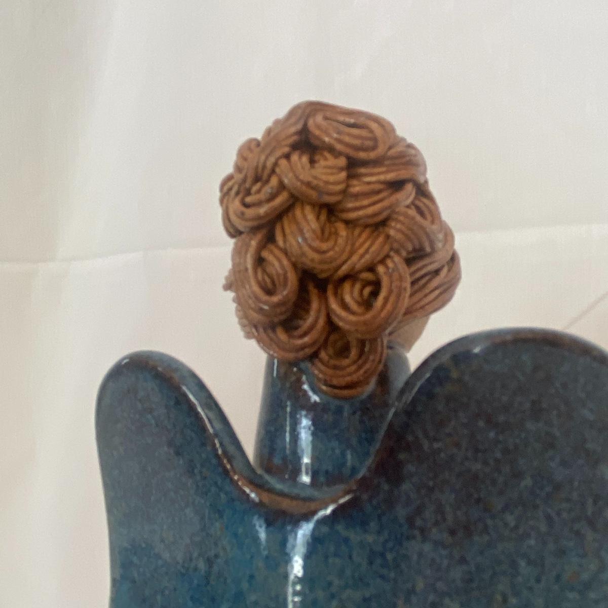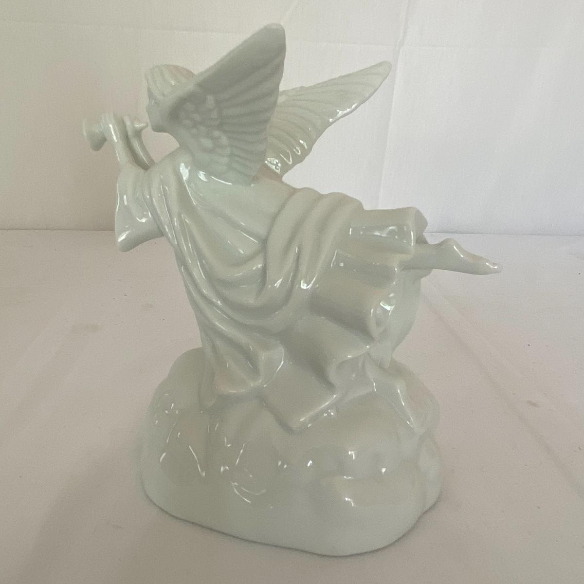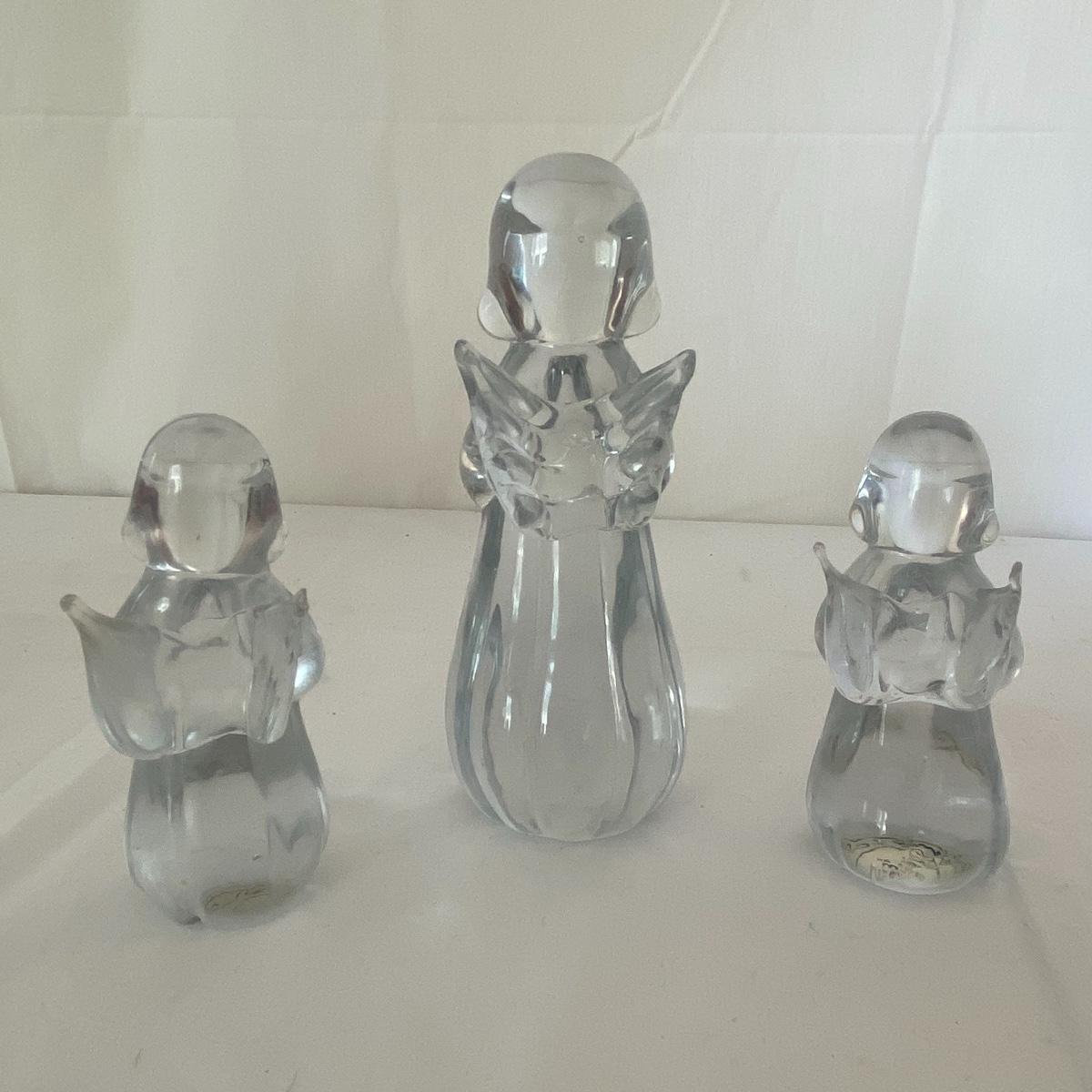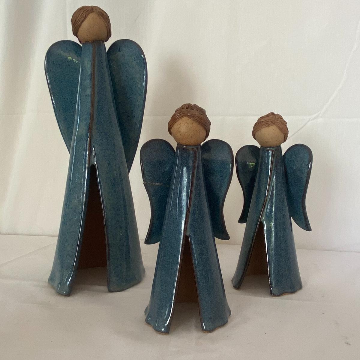 Angelic lot includes many decorative angel collectibles. Set of three sister angels, beautifully glazed and signed pottery, one angle appears to have a wing repair from previous break, see photos. Largest angel stands 11.5” tall. Set of three hand blown glass angels from Twos Company. Smallest angel stands approximately 4” tall. See photos. A glass angel music maker standing 5.5” tall included as well, with a delightful tune! Two additional angel figurines are included, one white and blue and the other is purple and also a candle holder! Lastly, included in this lot are a pair of Russ Bernie Co. angel ornaments. See photos for stunning colors and details. Shipping available!