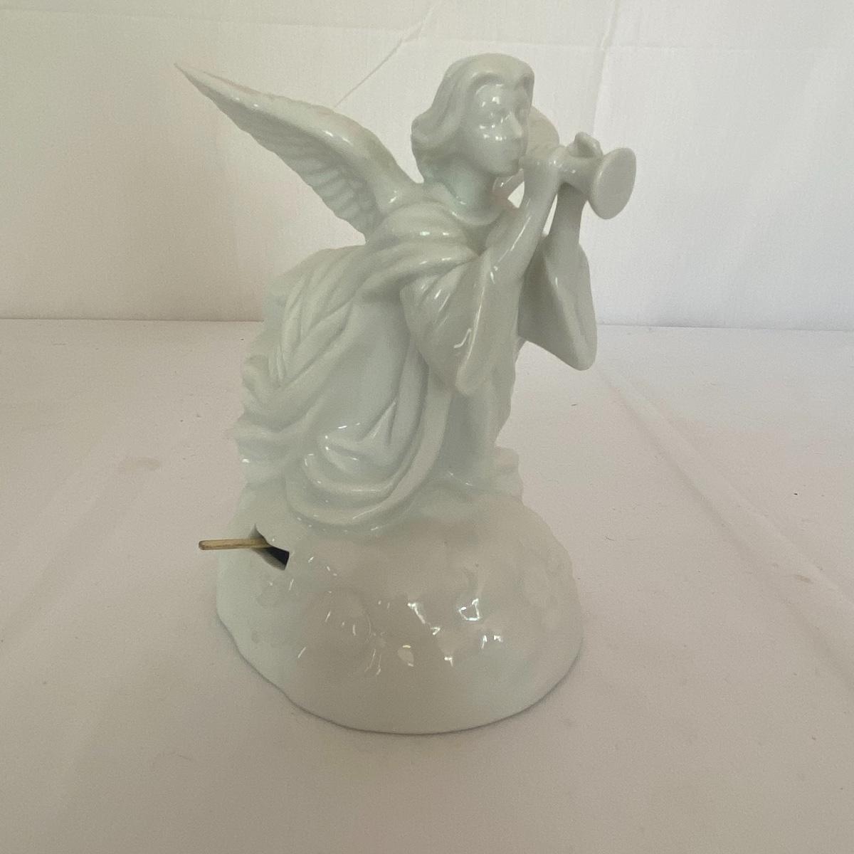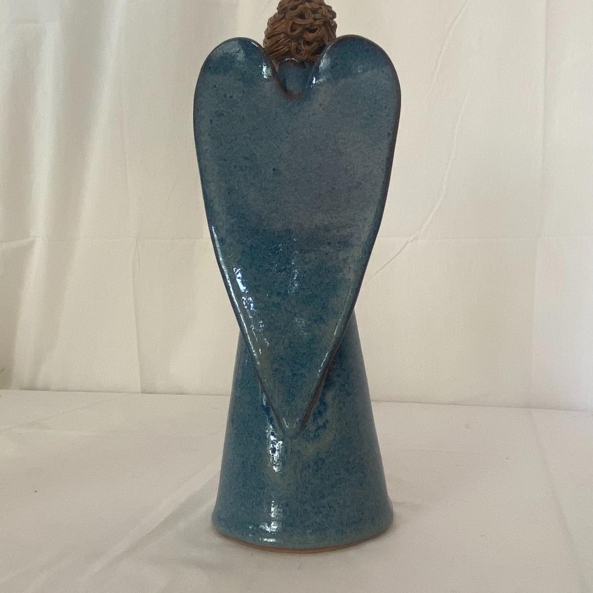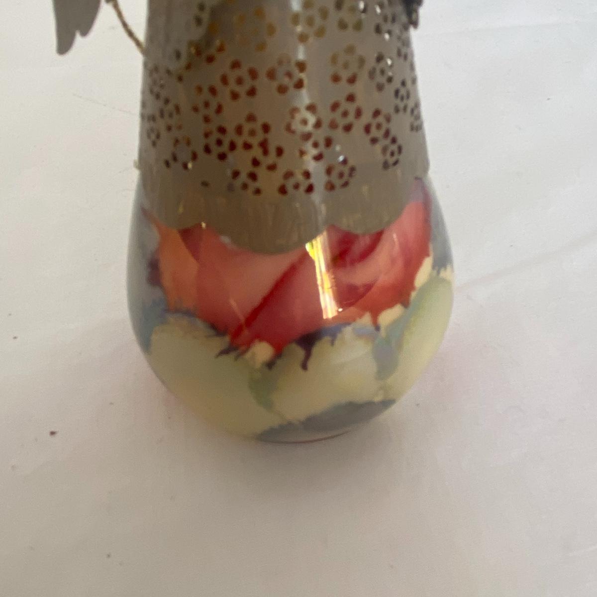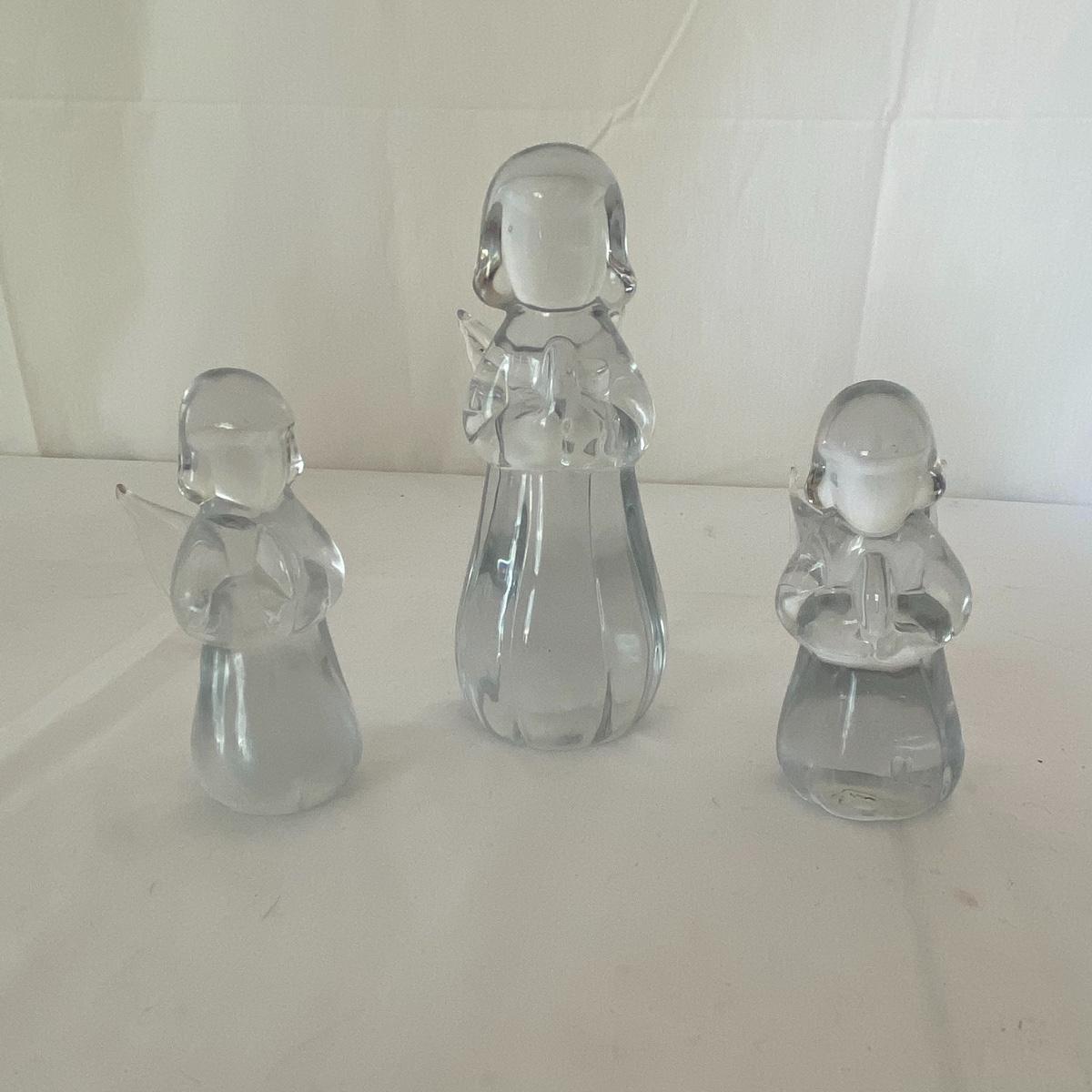 Angelic lot includes many decorative angel collectibles. Set of three sister angels, beautifully glazed and signed pottery, one angle appears to have a wing repair from previous break, see photos. Largest angel stands 11.5” tall. Set of three hand blown glass angels from Twos Company. Smallest angel stands approximately 4” tall. See photos. A glass angel music maker standing 5.5” tall included as well, with a delightful tune! Two additional angel figurines are included, one white and blue and the other is purple and also a candle holder! Lastly, included in this lot are a pair of Russ Bernie Co. angel ornaments. See photos for stunning colors and details. Shipping available!