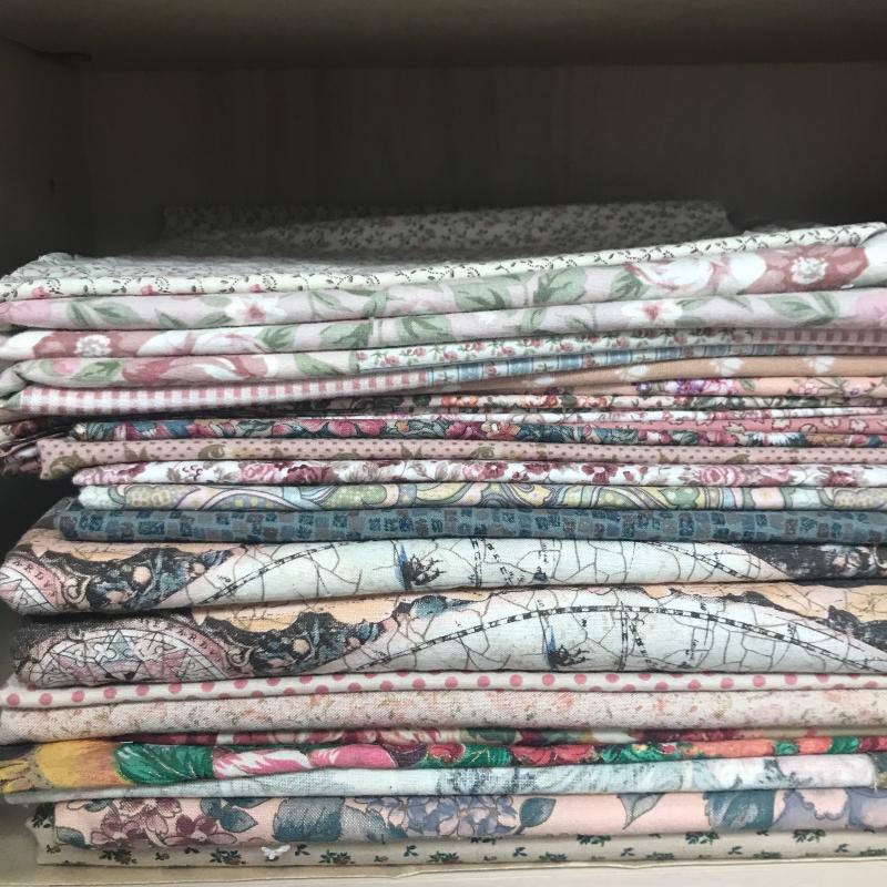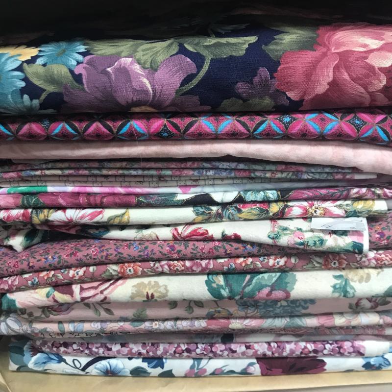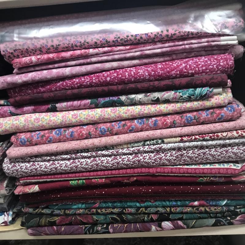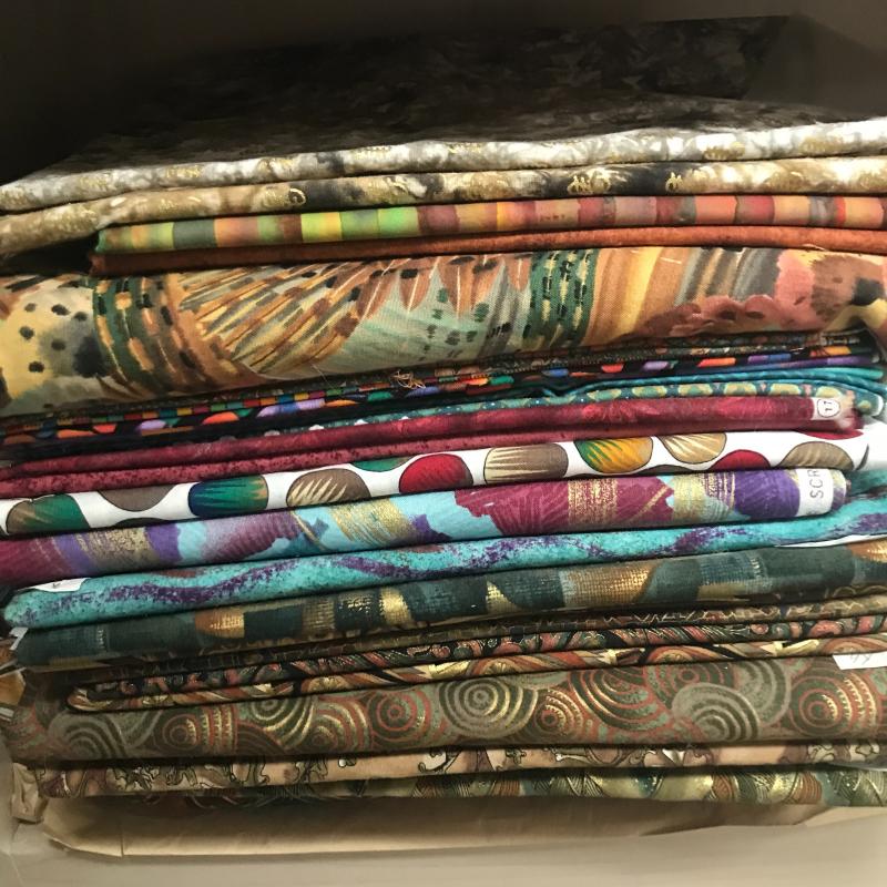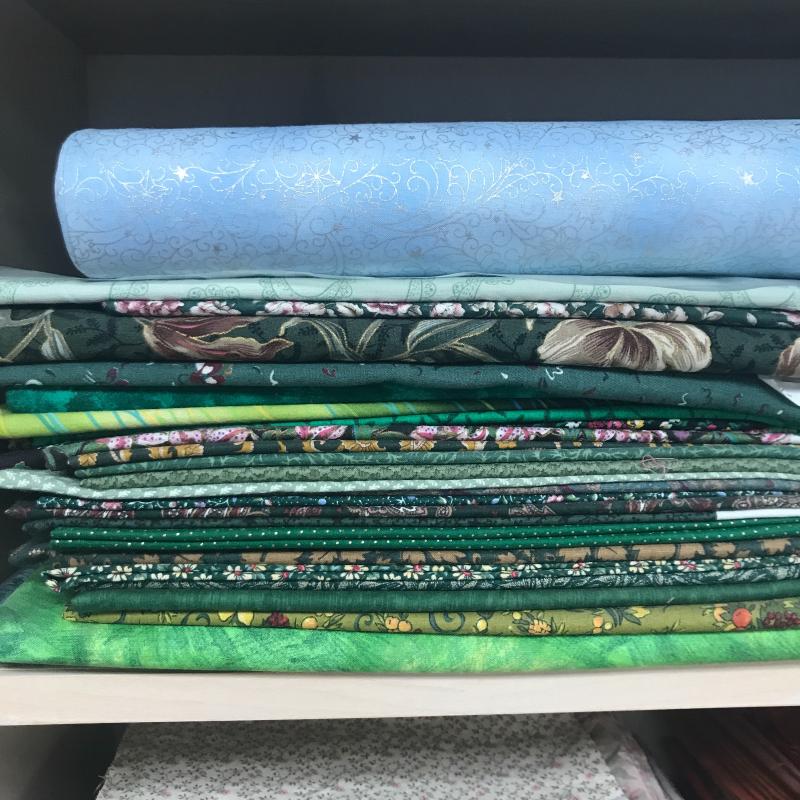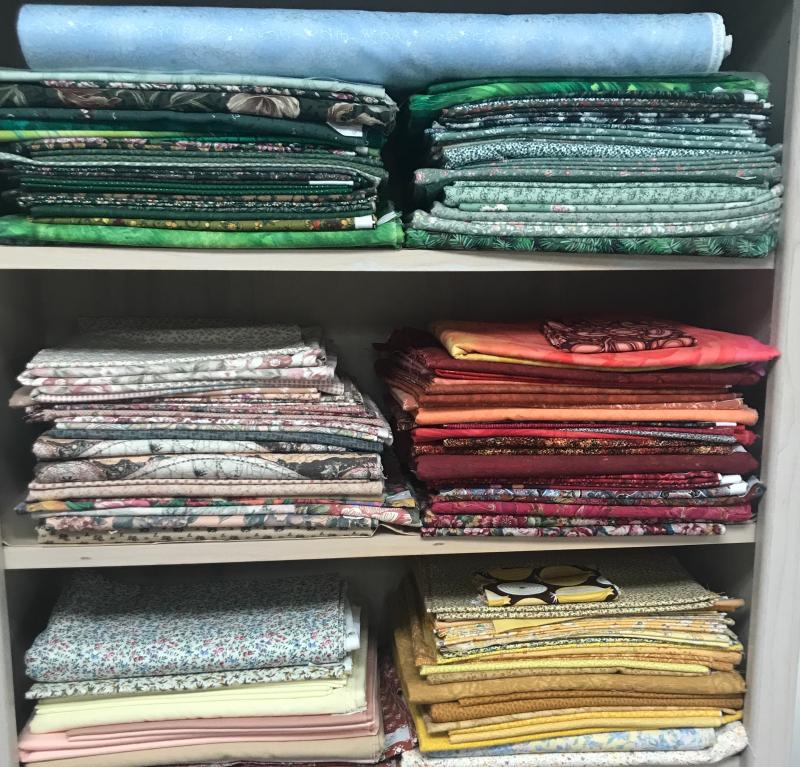 Six shelves of fabric for your quilting projects. Most fabric is at least one yard. This lot also Includes one bolt of light blue and silver fabric. See photos for designs and colors. Shelf unit not included. Shipping available. We encourage you to come to the preview to see the fabric details in person.