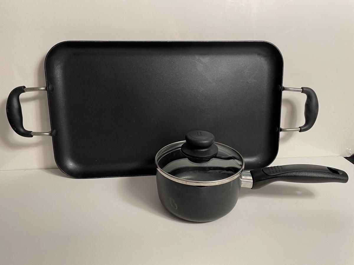 Like-new non-stick saucepan with glass lid and non-stick griddle