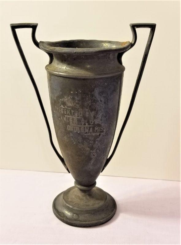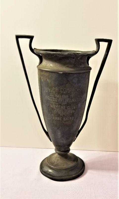This silver plate loving cup was presented by the Lanier Club in Okolona, Mississippi (this club still in existence) to Annie Baird on 6 April 1924 as a prize in a Junior Composition contest. 8.5" tall. Inscribed on front and reverse. This group was part of the Mississippi Federation of Women's Clubs - looks like they are still meeting today. Condition as shown. A neat item.