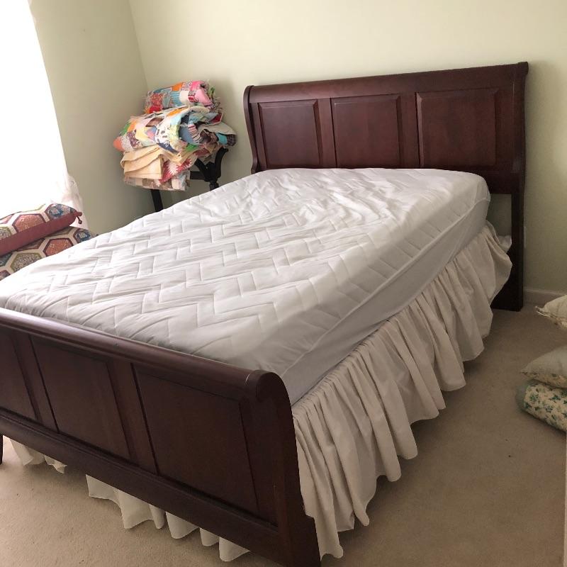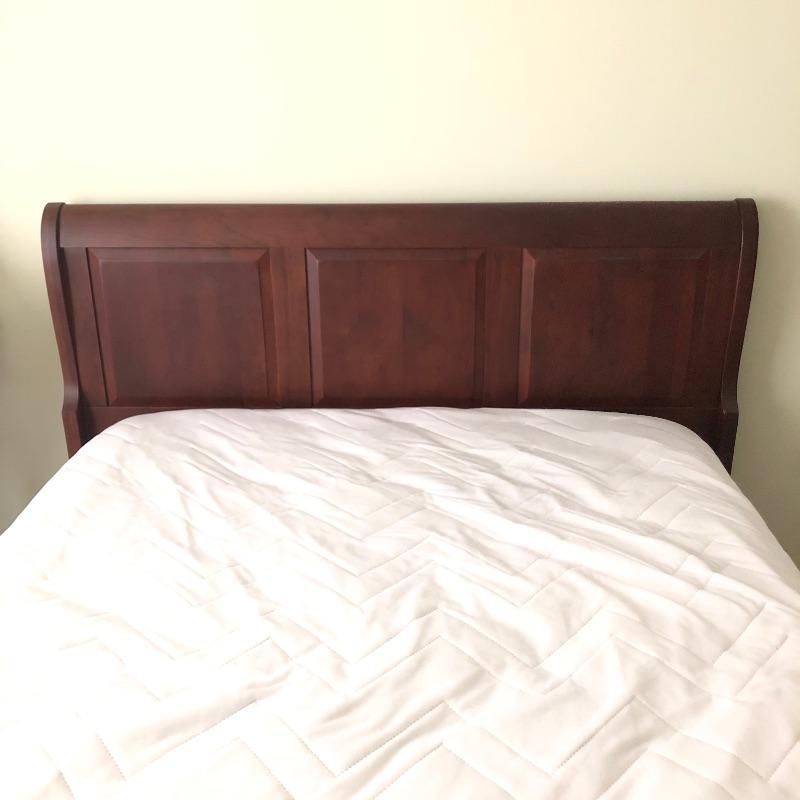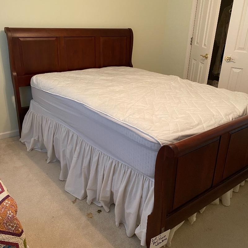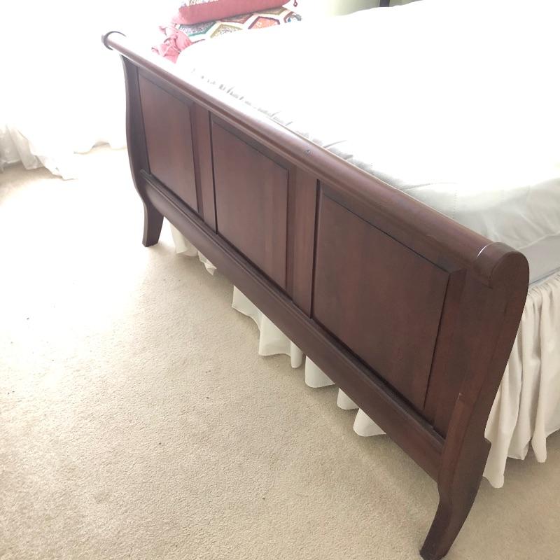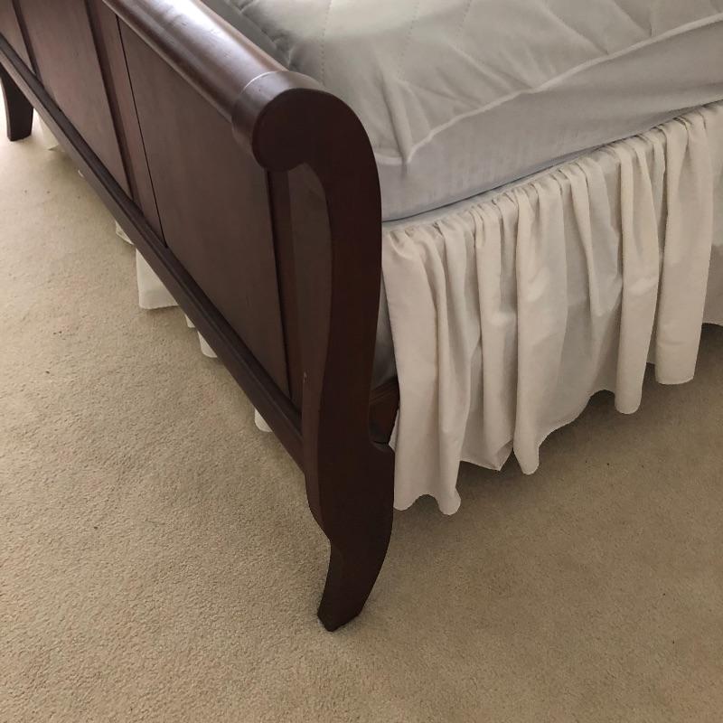 This double bed is a sleigh bed style in a rich mahogany colored wood. This lot includes headboard, footboard, rails and the bed skirt. The mattress, mattress cover and box spring are available to the winning bidder. Headboard and footboard are available for a queen or double/full mattress as they have additional slots. Double mattress size is shown.