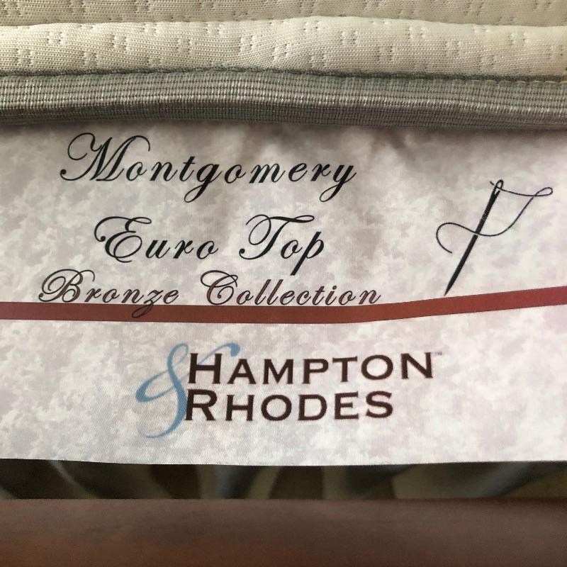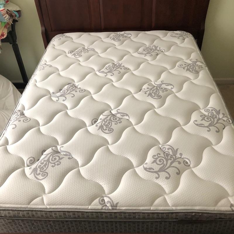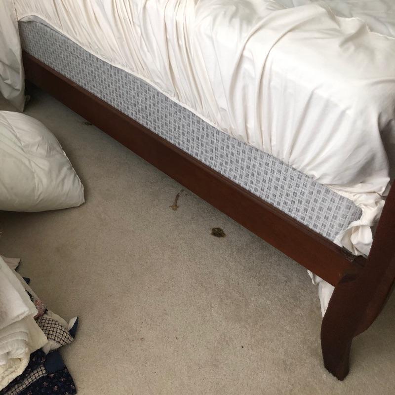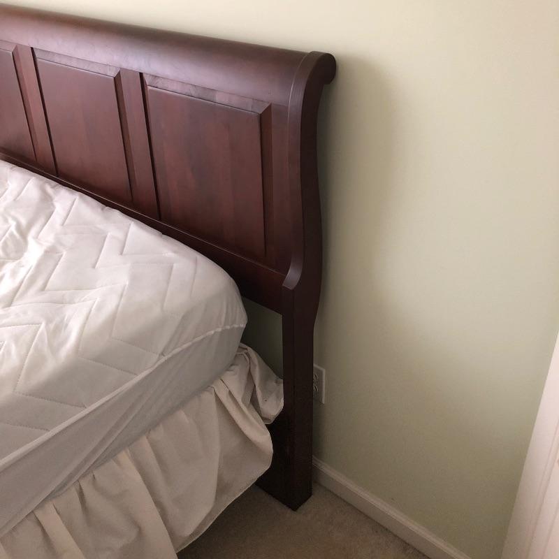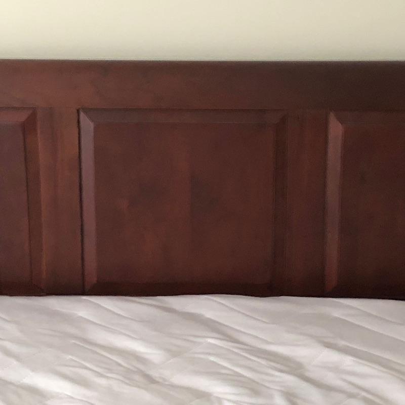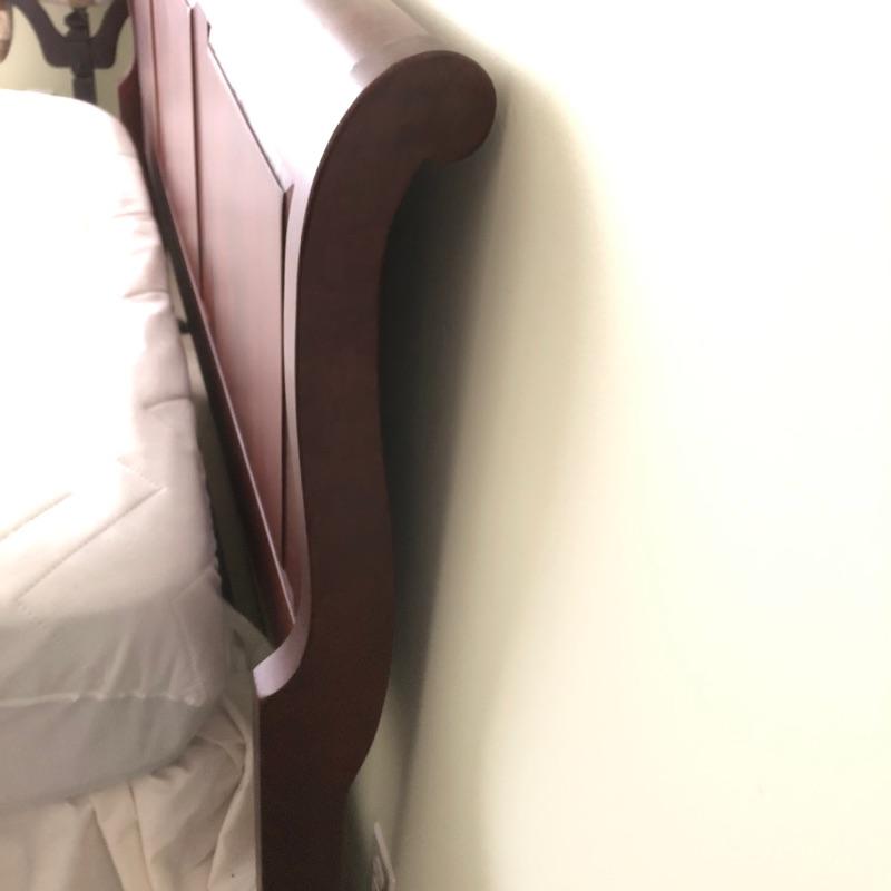 This double bed is a sleigh bed style in a rich mahogany colored wood. This lot includes headboard, footboard, rails and the bed skirt. The mattress, mattress cover and box spring are available to the winning bidder. Headboard and footboard are available for a queen or double/full mattress as they have additional slots. Double mattress size is shown.