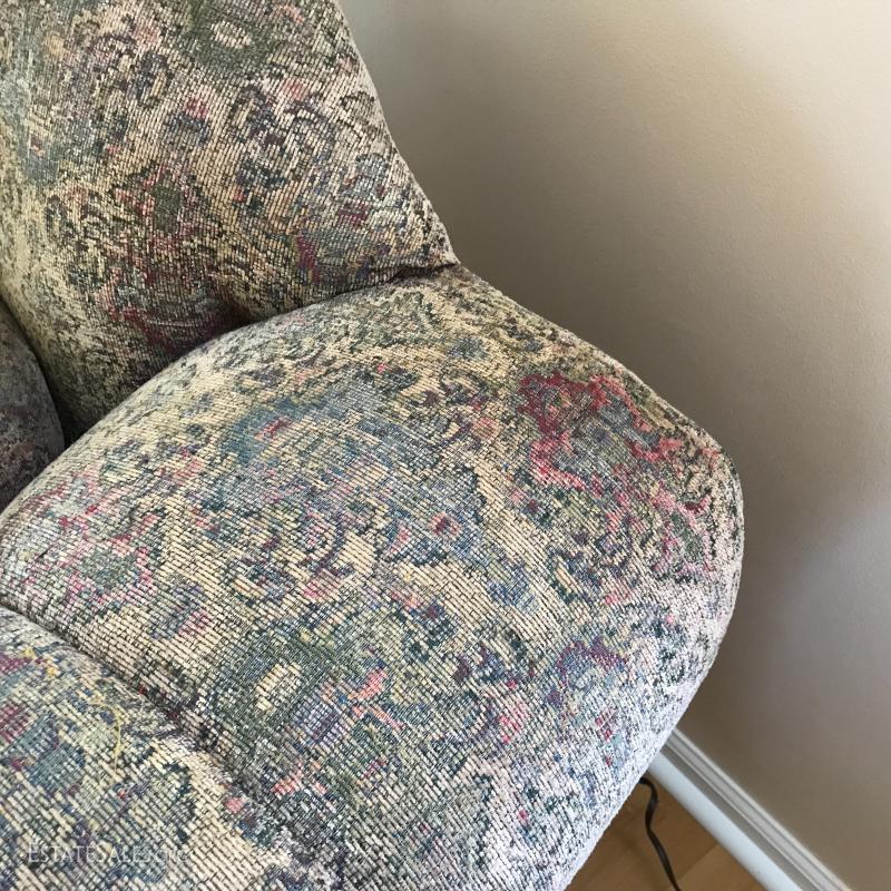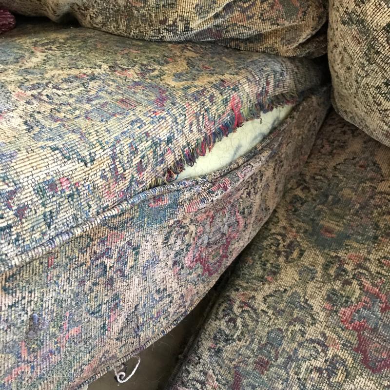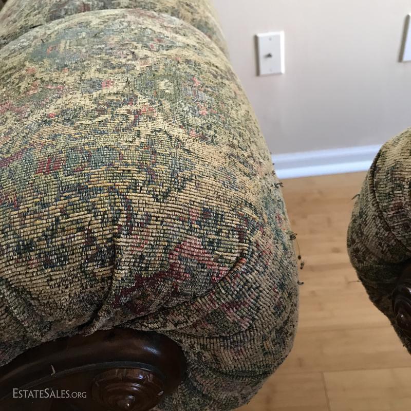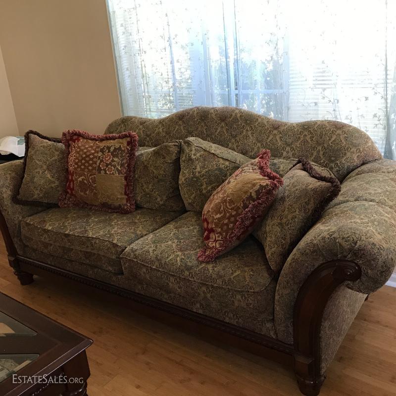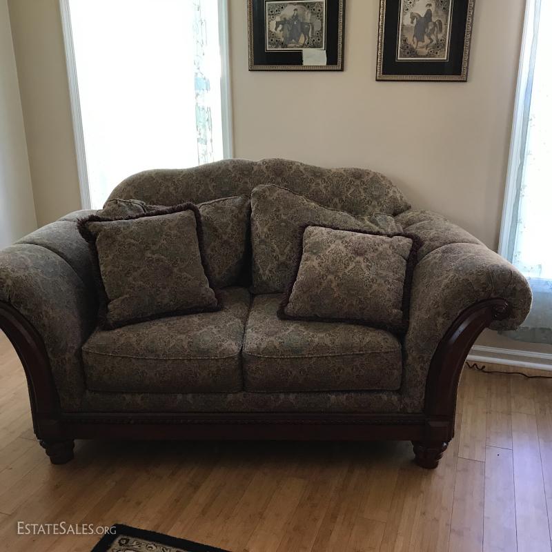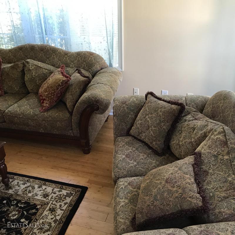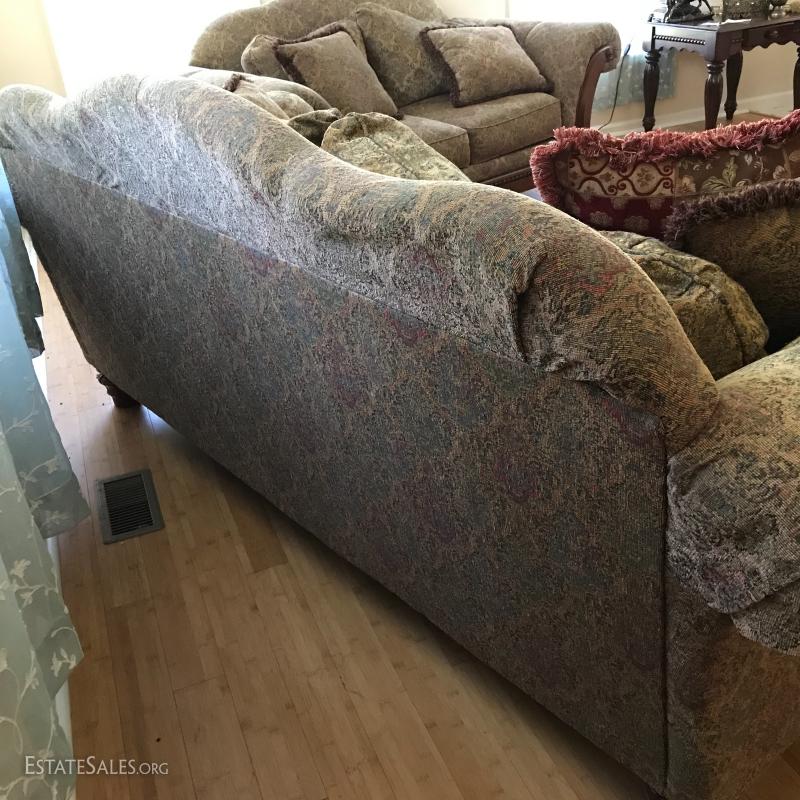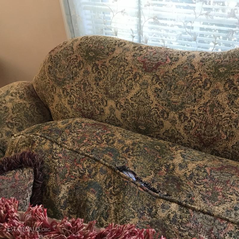 Elegant-looking sofa and love seat set. Sofa is 96"l x 39"w x 38.5"h. Love seat is 77"l x 39"w x 38.5"h. Some wear on arm rests, cat hair, and a few tears on cushions that can be easily hidden (see photos). Six throw pillows included.