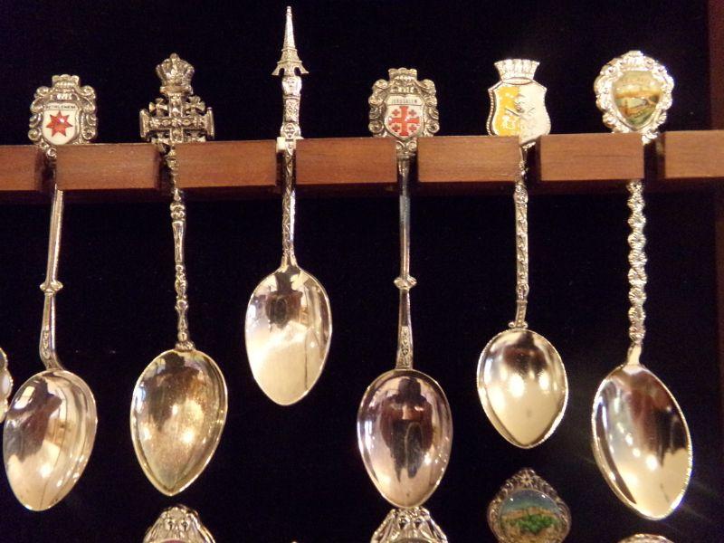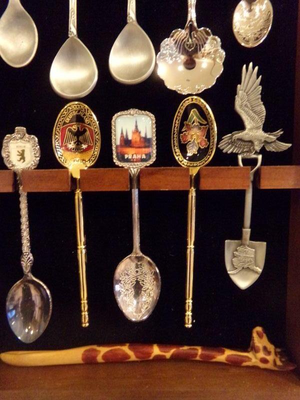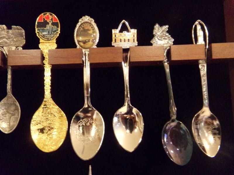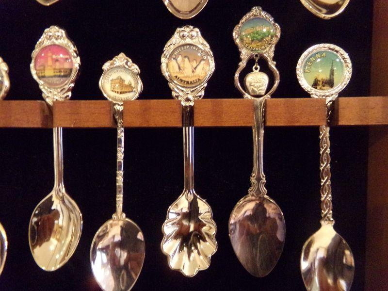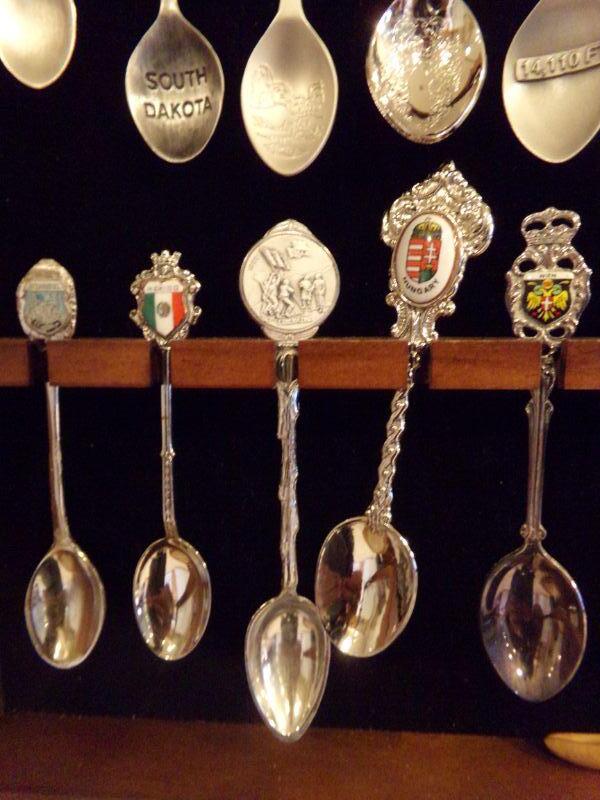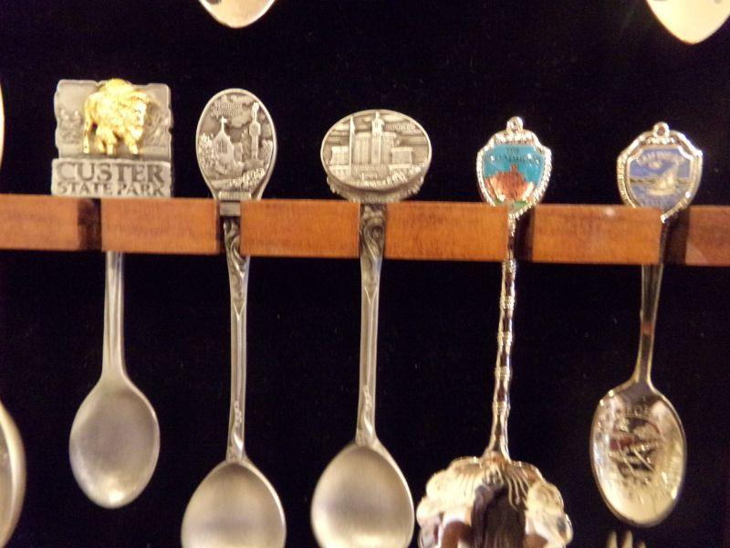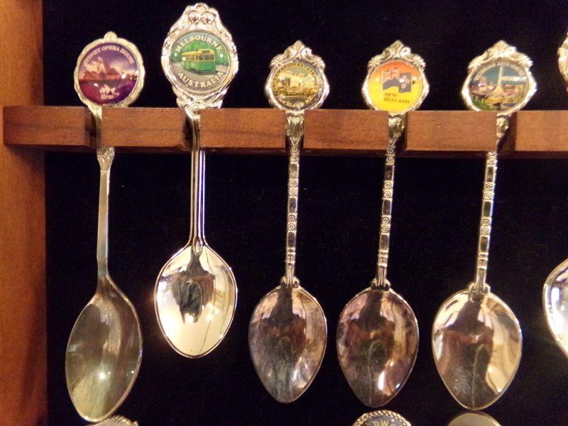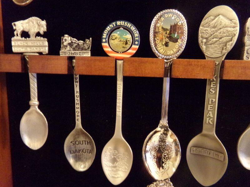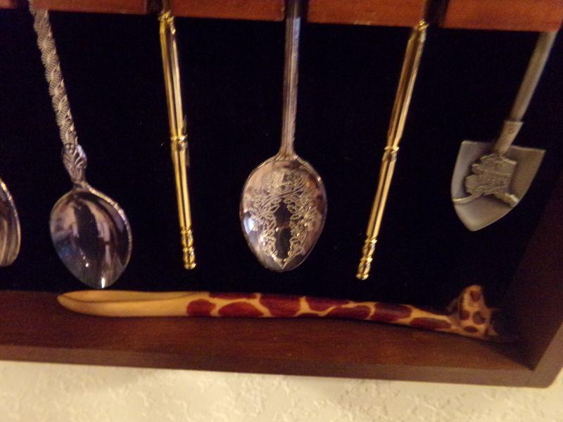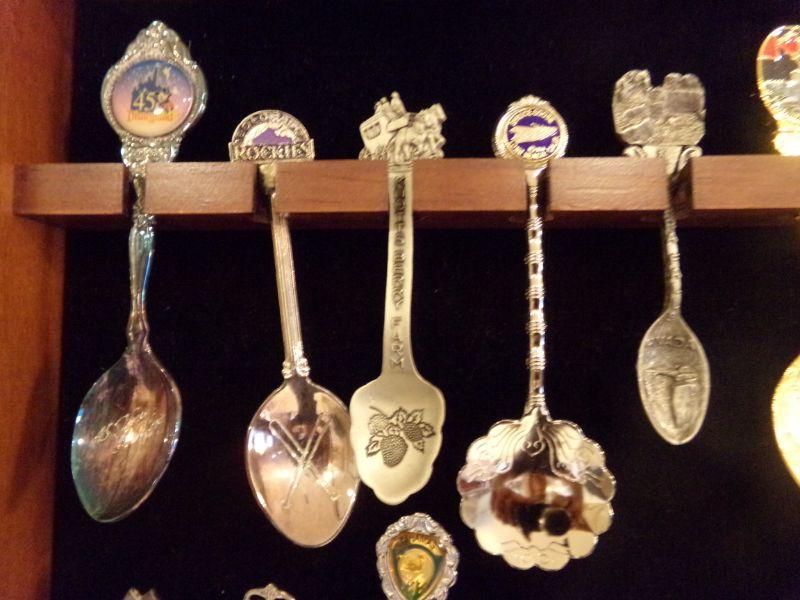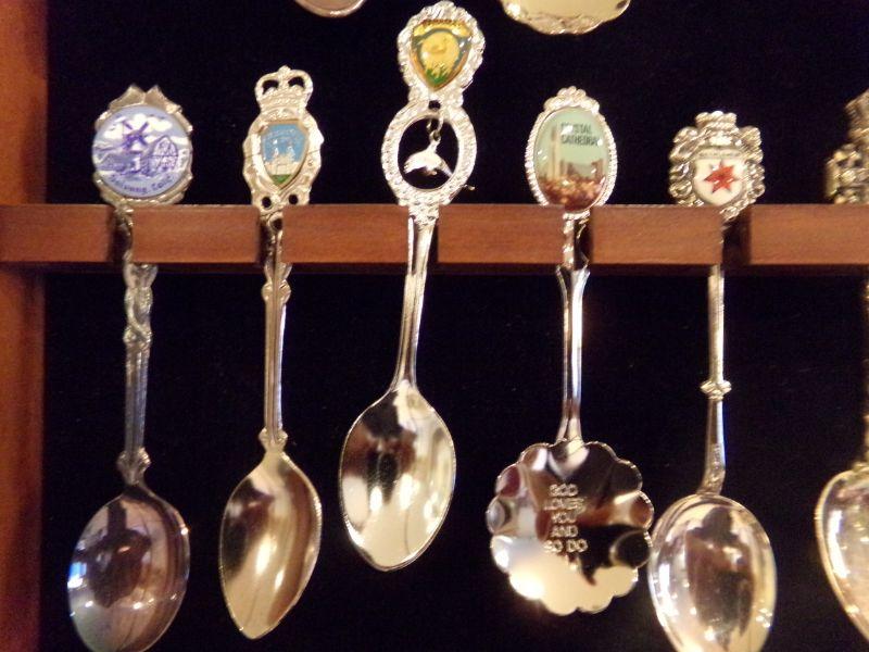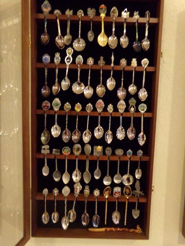 VERY NICE WOODEN DISPLAY CASE WITH GLASS FRONT FULL OF SOUVENIR SPOONS FROM A WIDE VARIETY OF PLACES