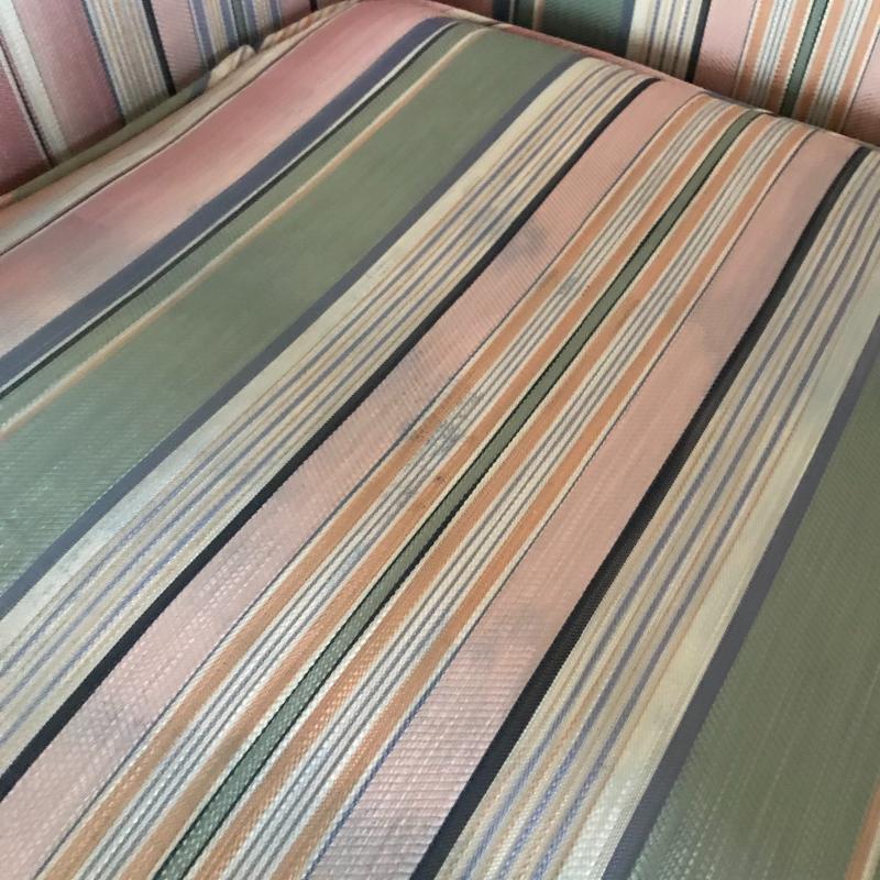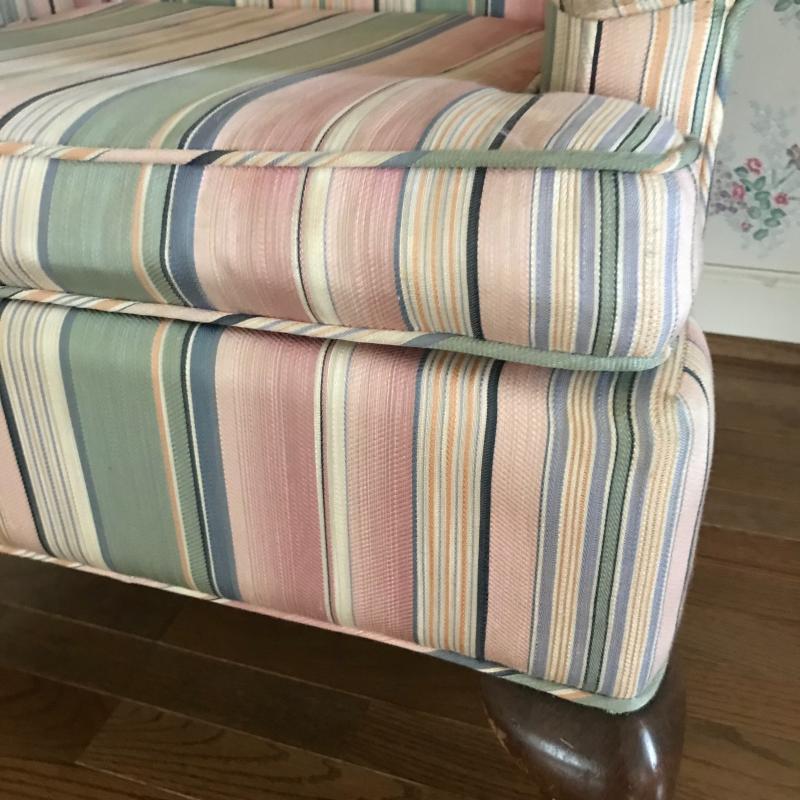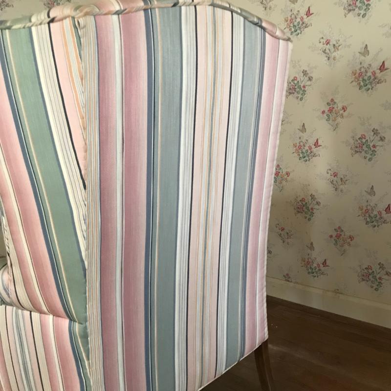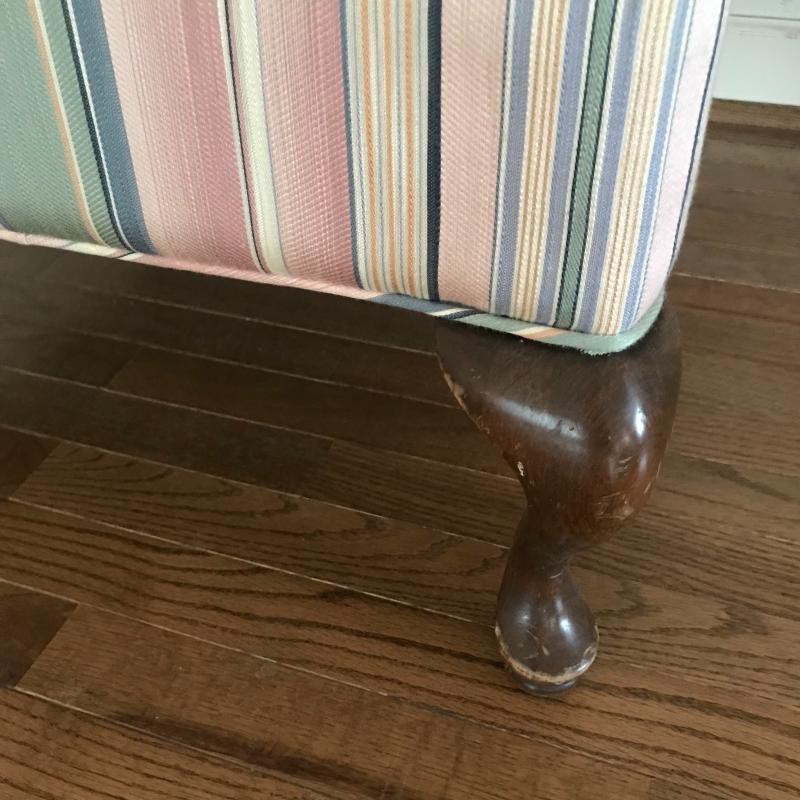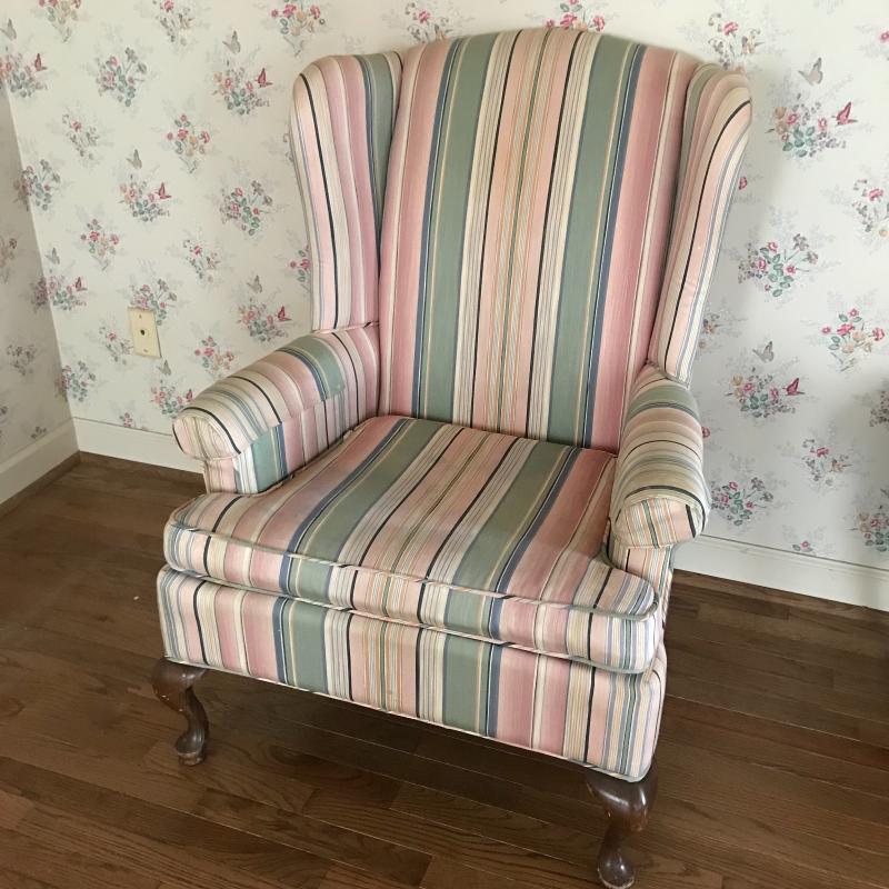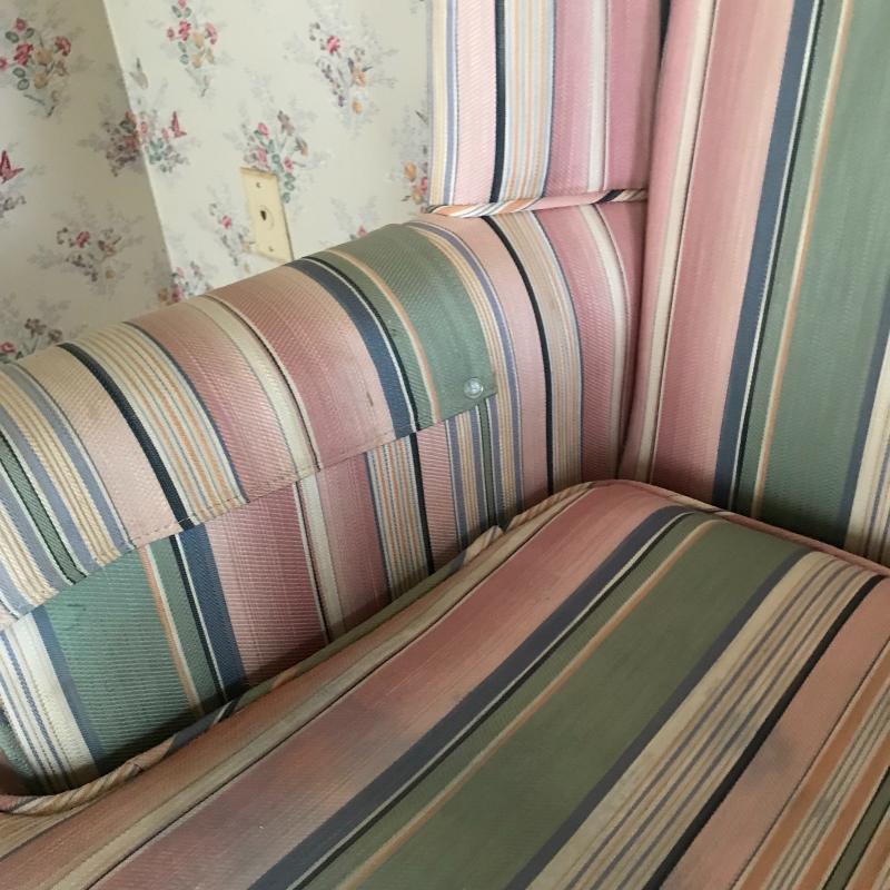 This comfy upholstered chair is sturdy with some stains. Approx. 31”l x 27”w x 41”h. No shipping available. Local pickup only in Flatrock, NC.