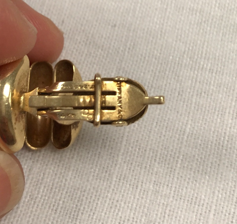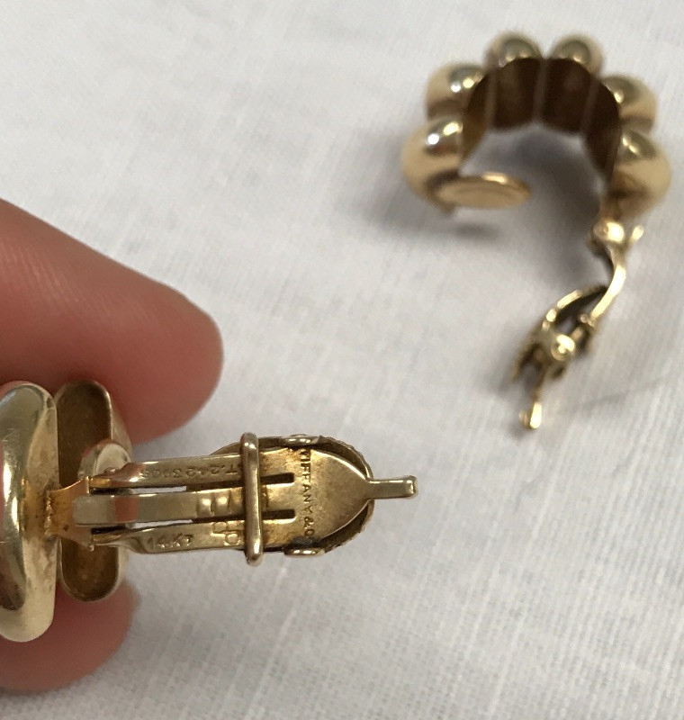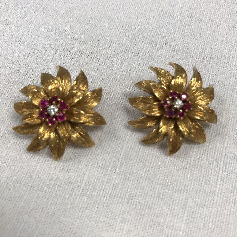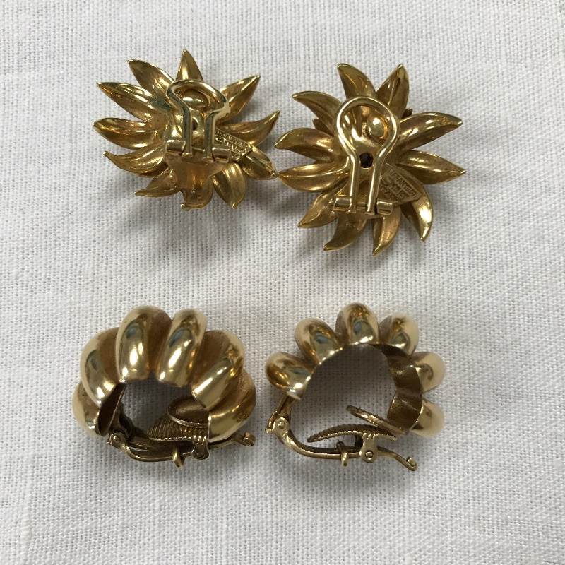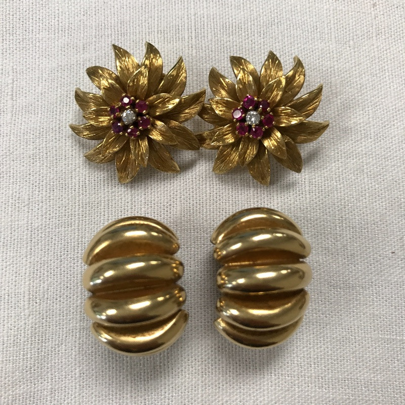 Own your very own Tiffany earrings with these two gorgeous pairs of clip-on ones. One pair are a Dahlia floral set with rubies and 10k gold (diamond does not test to be real). The second pair are curved 14k gold. These classic earrings will be a great addition to your jewelry collection.