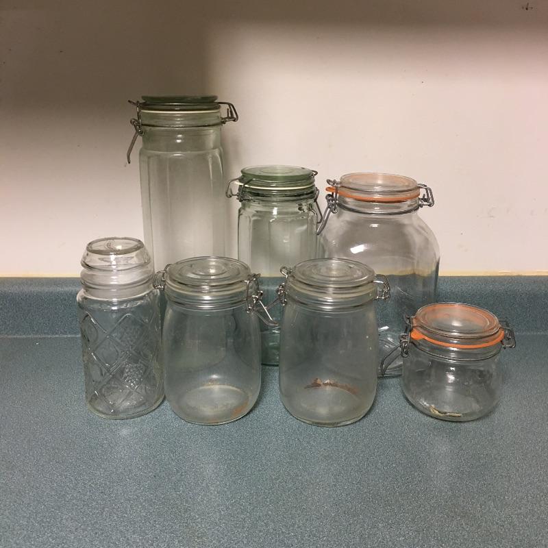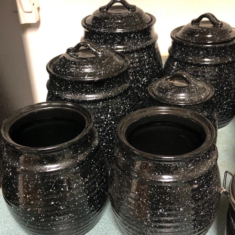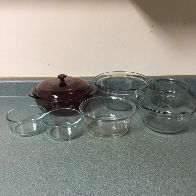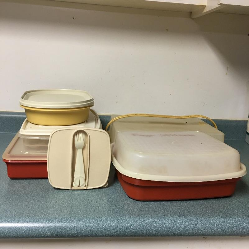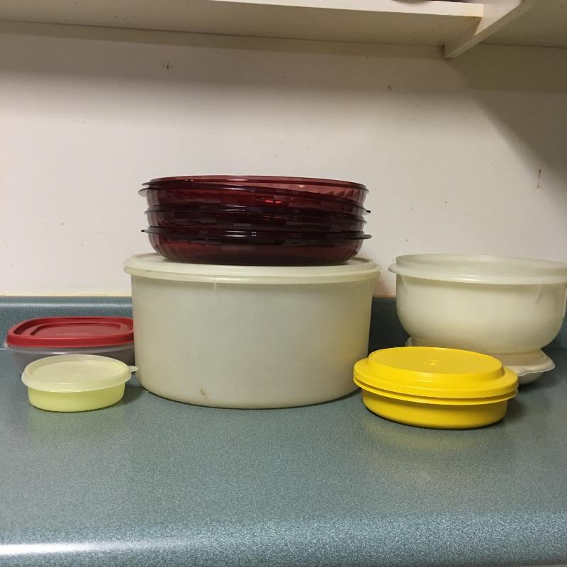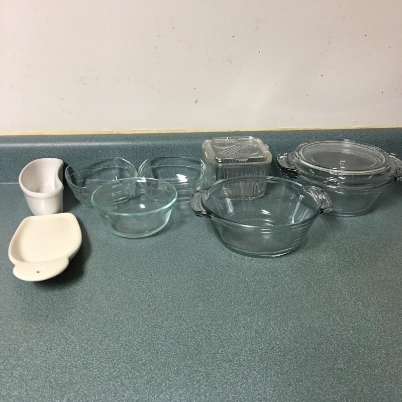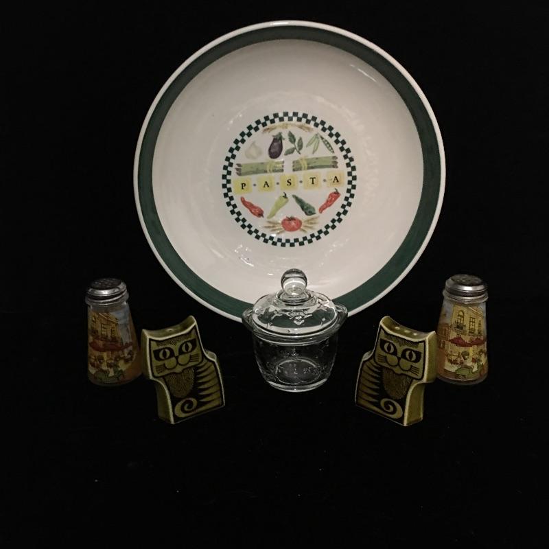 Store your perishables in this plethora of containers. Lot includes Pyrex pie plates, bowls, Corning bowls, dishes, Anchor Hocking bowls, Horsea England cat salt and pepper shakers, Jay canisters, glass flip top lid canisters, Tupperware canisters, cake carriers, egg carriers, casserole dishes, ham carrier, cracker storage, assortment of glass vases, bottles, votive holders and more. Largest platter Measures 16” x 20” x 1.5”.