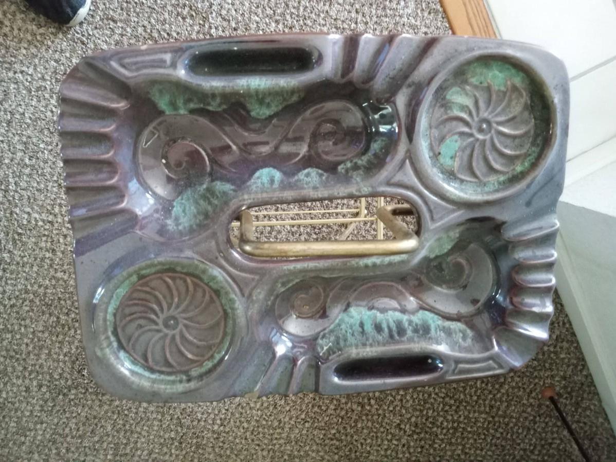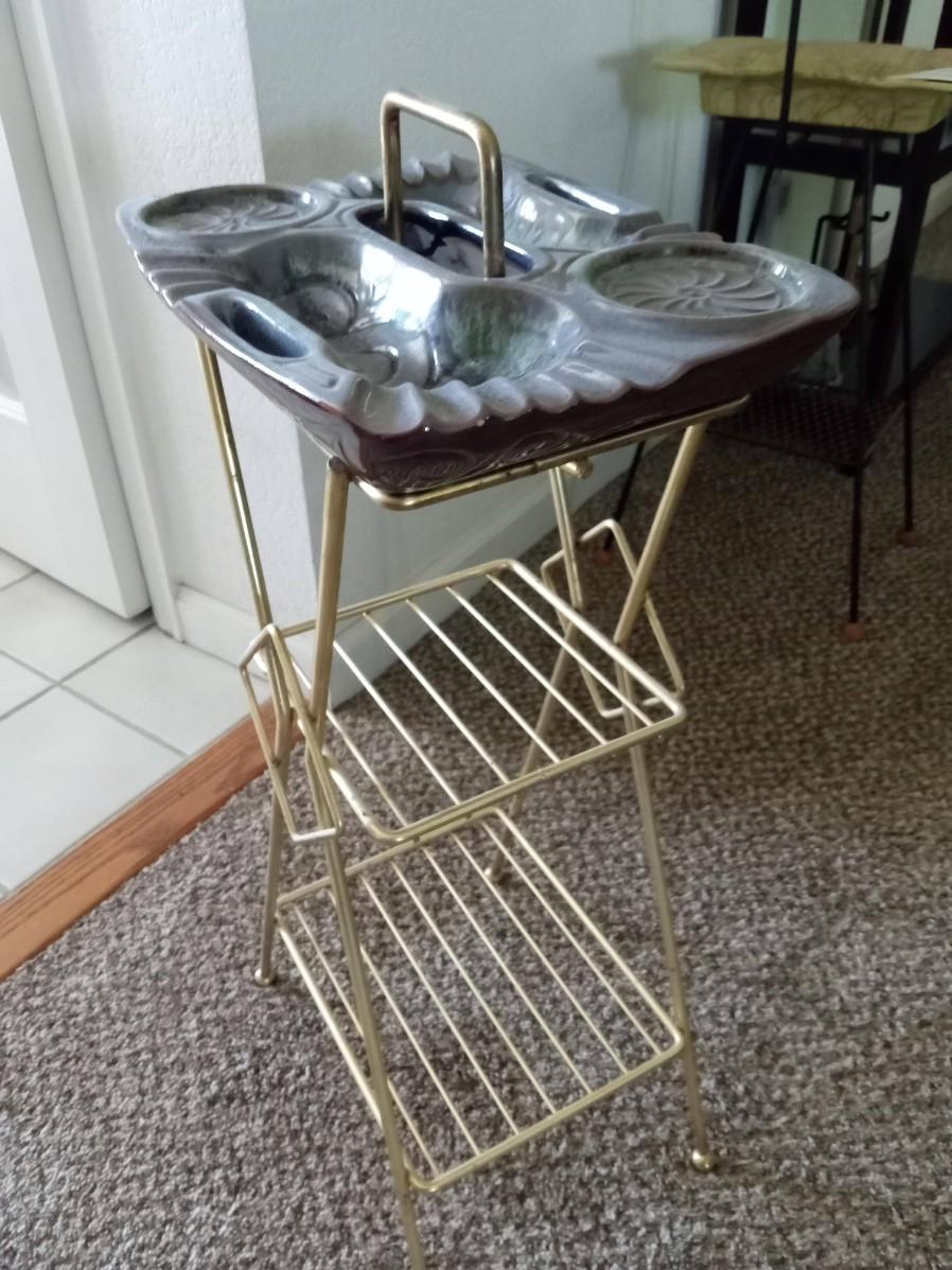 BEAUTIFUL CERAMIC ASHTRAY WITH CUP HOLDERS ON A METAL STAND