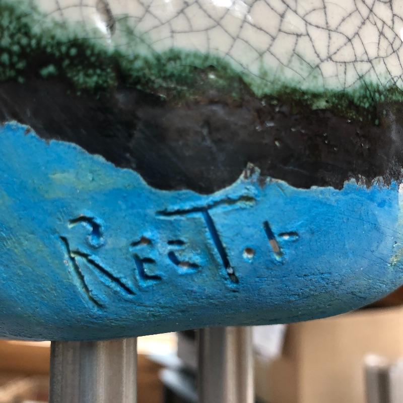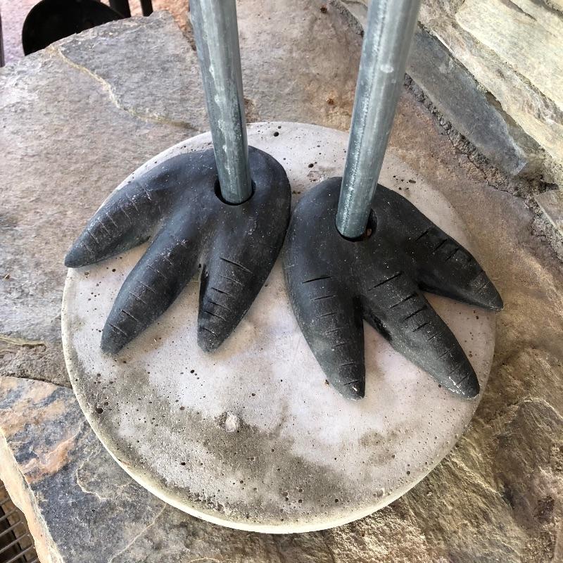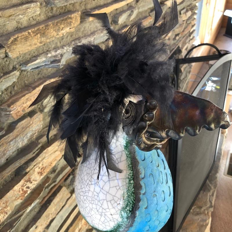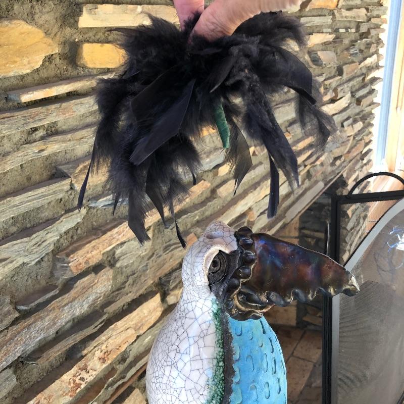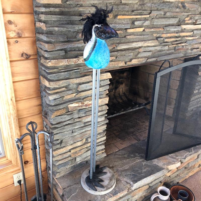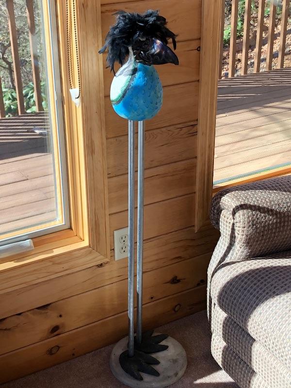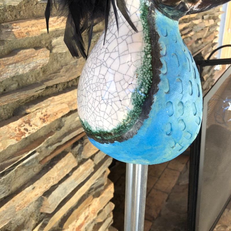 This handsome gal or guy is a combination of materials that includes a ceramic body and feet, metal legs, cement base and a gorgeous feather boa hairdo. He will brighten up any space he flies to and bring a smile every time you look at him or her. Piece is signed by artist, see pictures. Bird measures approximately 6” x 43” tall.