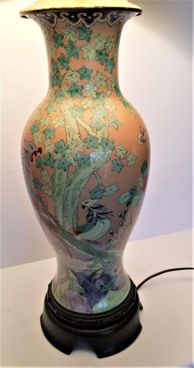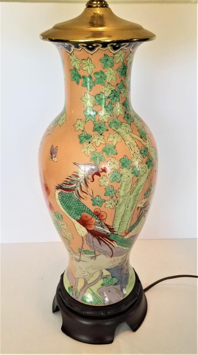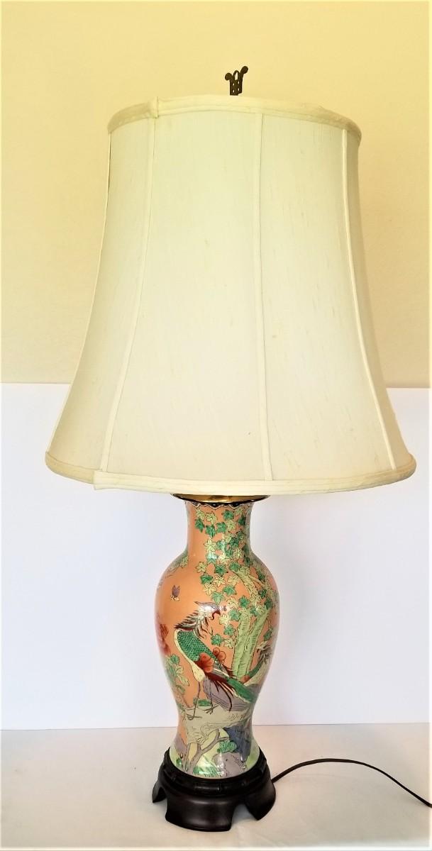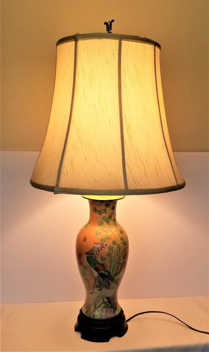 Pretty table lamp with Asian bird motif all the way around - good working condition - brass Asian finial. 33" tall. Build in wooden base.