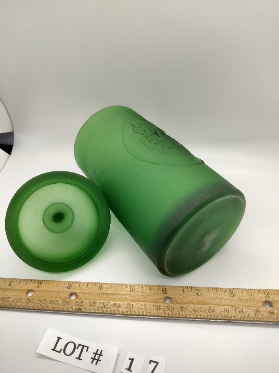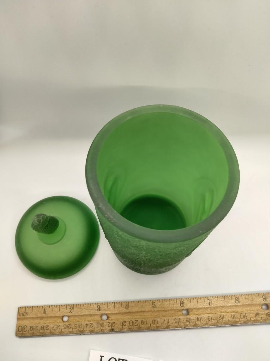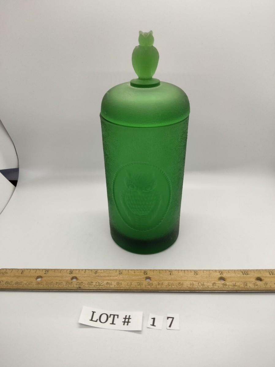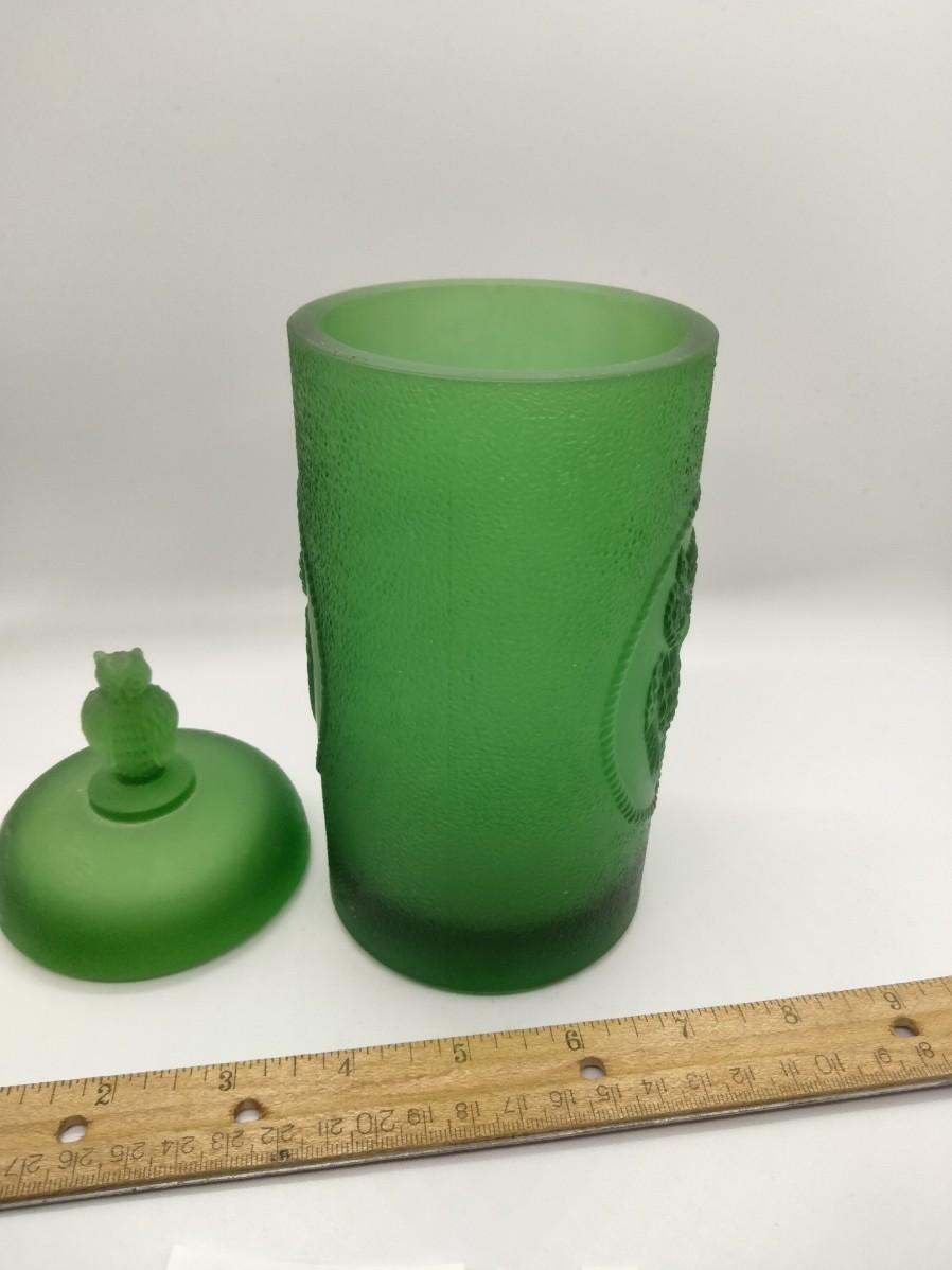Frosted green satin glass with texture and owl cartouche. owl finial lid. rare