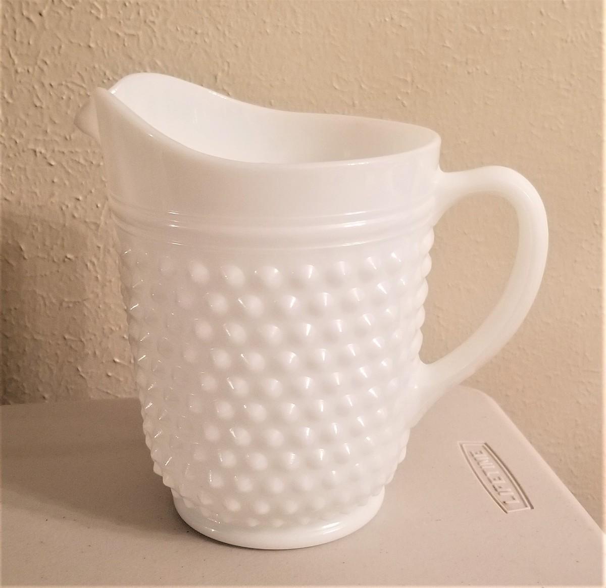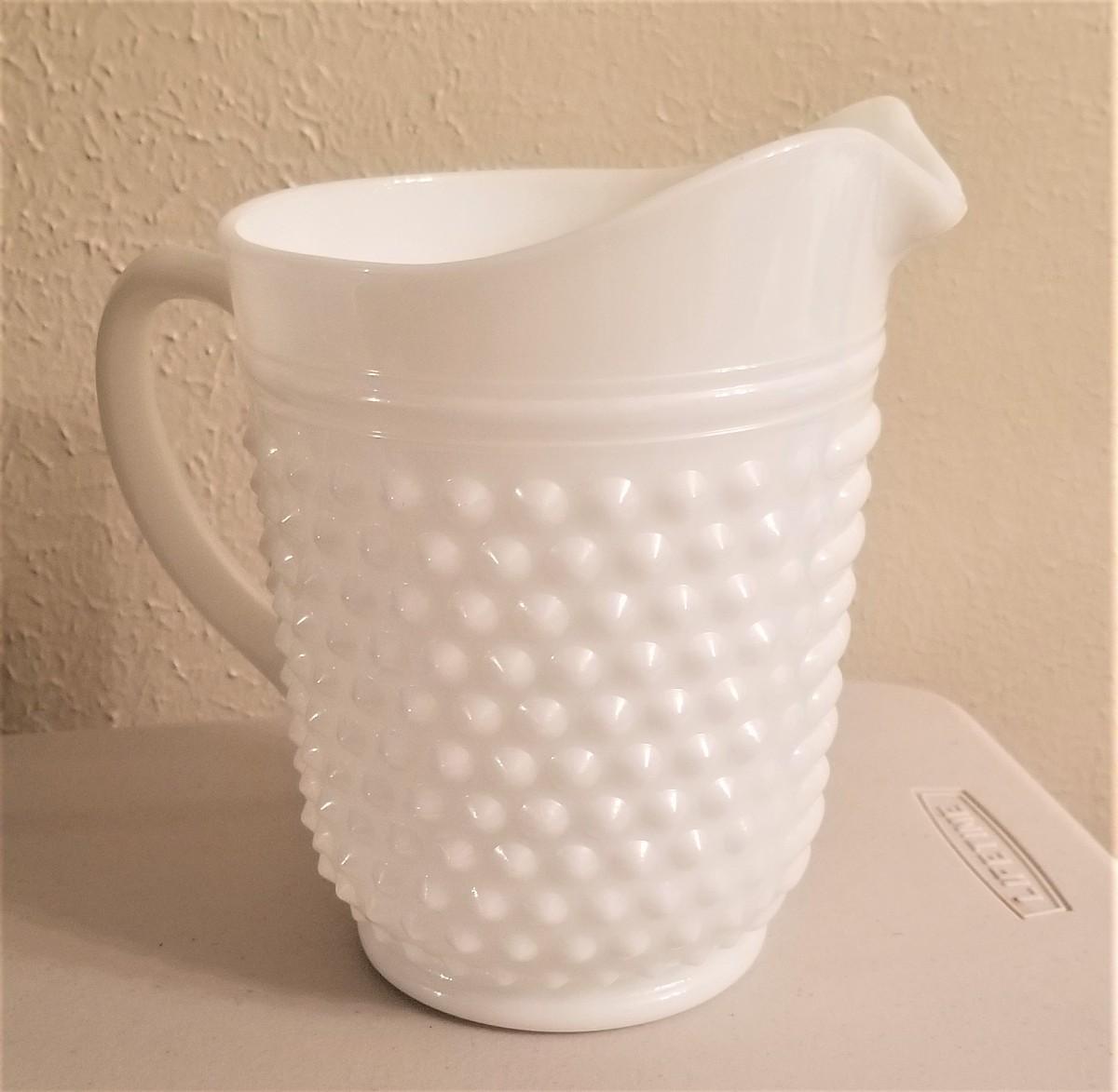 Classic vintage milk glass pitcher - 8" tall - good condition. Possibly Fenton.